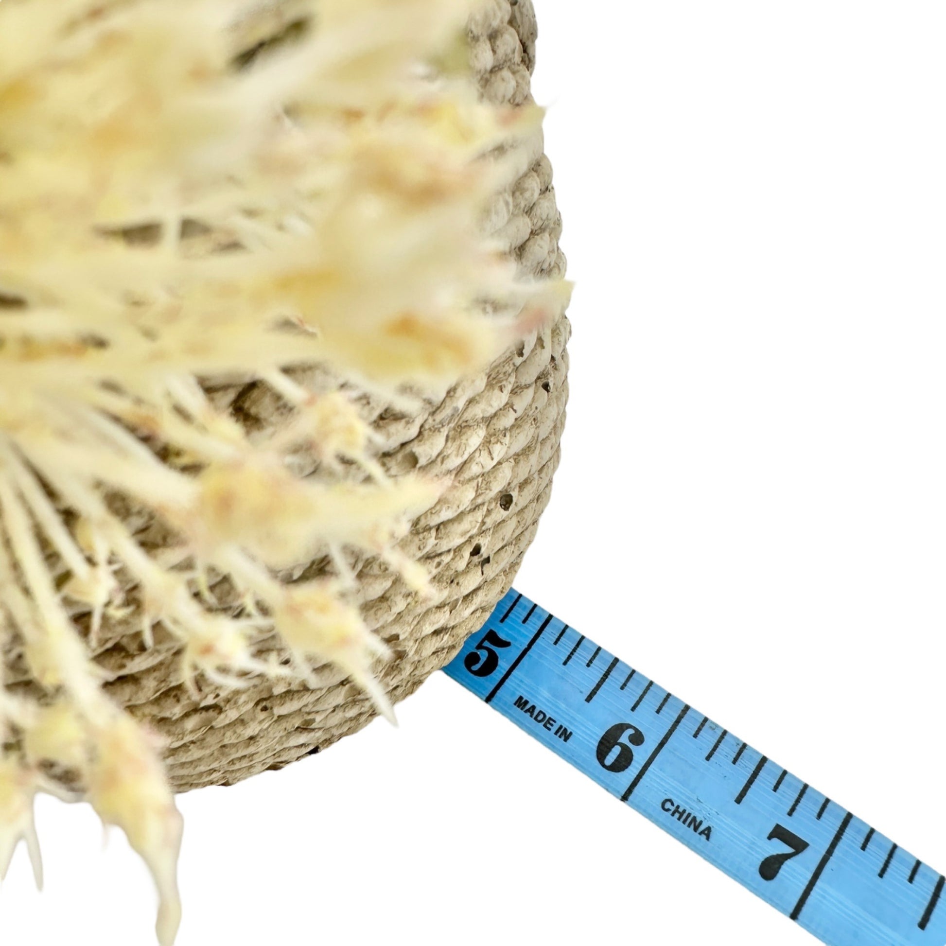 Basket diameter = almost 5 inches, height = 14 inches (including flowers).
