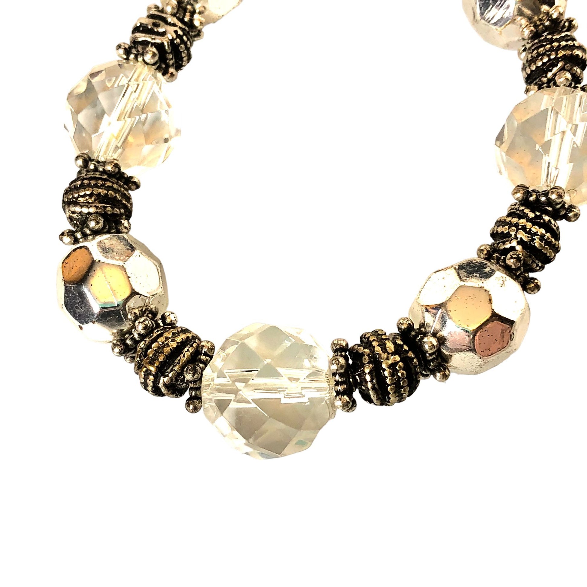 Beaded Stretch Bracelet Silver Crystal Beads Women's Costume Jewelry - This costume jewelry bracelet features lovely faceted clear beads alternating with patterned silver colored beads in between. It's a stretch bracelet so it is so easy to slip on and off! Dress this bracelet up or down; it does it all!