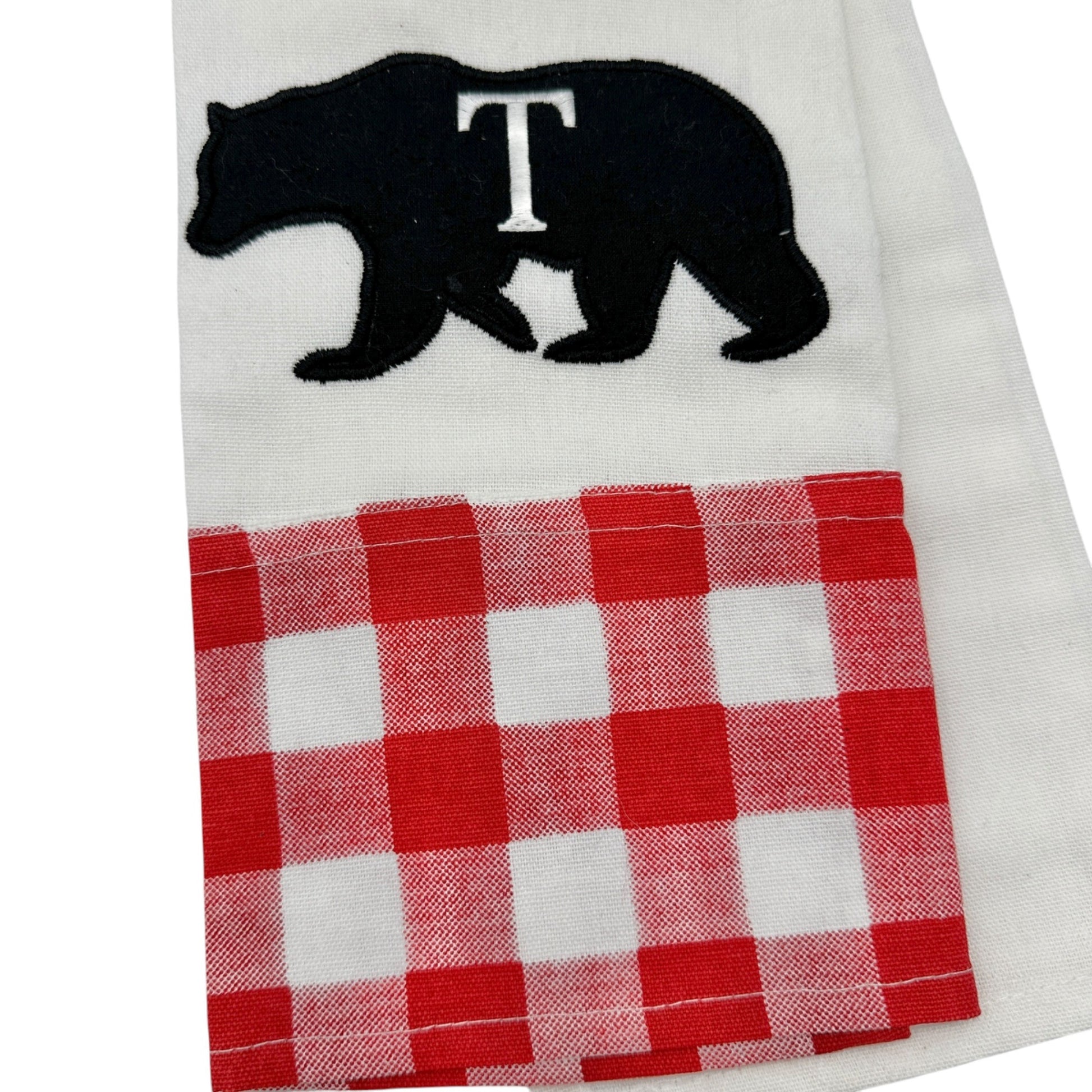 Bear Applique Kitchen Towel Red White Plaid Trim Embroidered T Initial 28x18