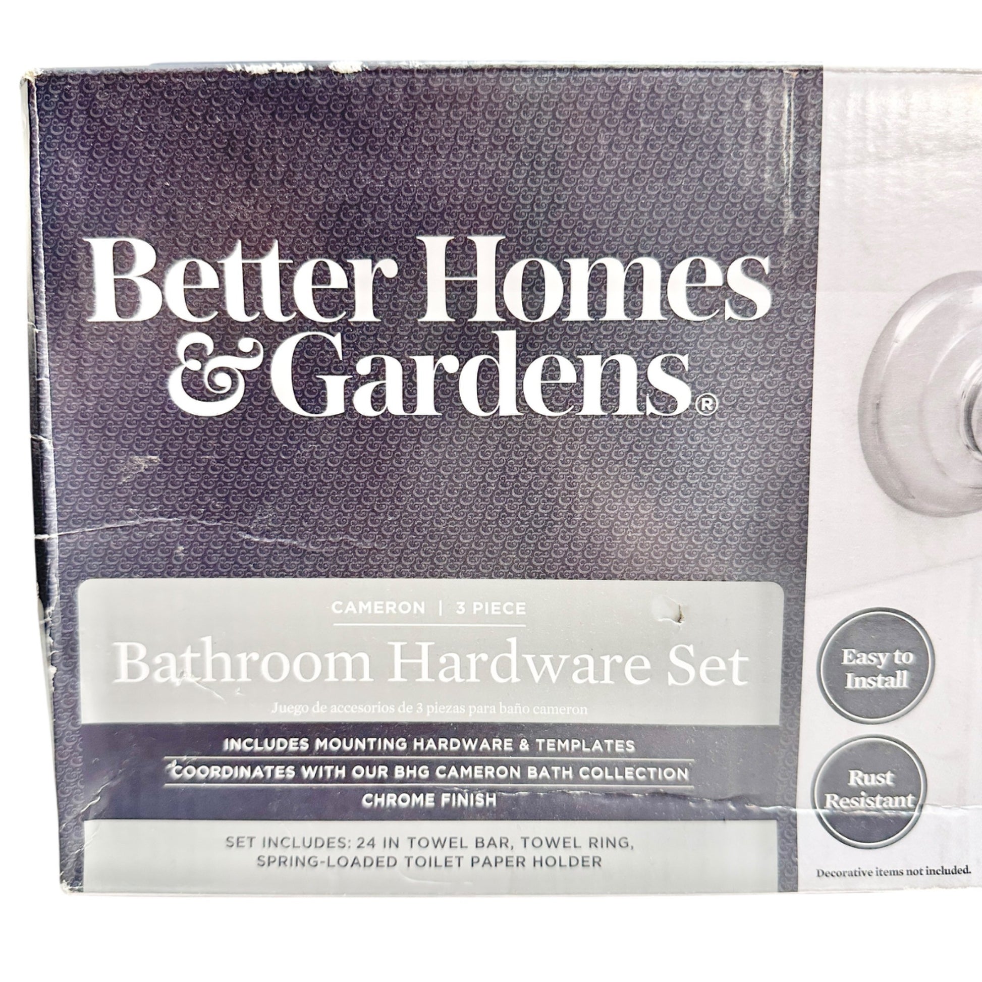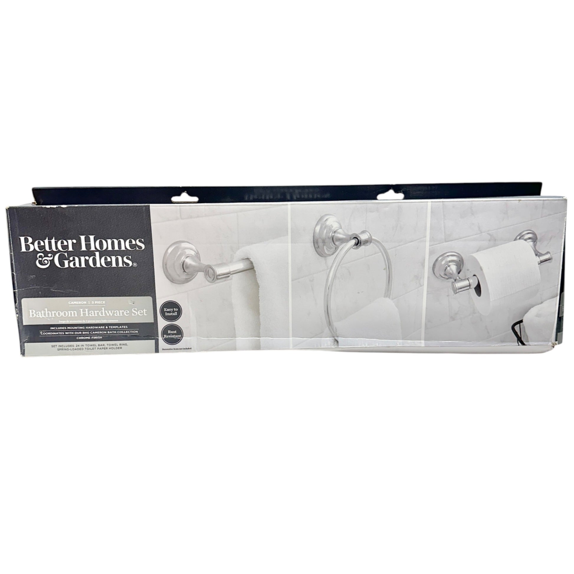 The Better Homes & Gardens Cameron 3-piece set features a chrome finish for a sleek, modern look. It includes a towel bar, towel ring, and a spring-loaded toilet paper holder. Rust-resistant and coordinated with the Cameron bath collection, this set combines functionality and style in your bathroom.