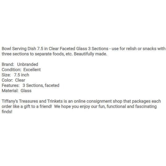 Bowl Serving Dish 7.5 in Clear Faceted Glass 3 Sections - use for relish or snacks with three sections to separate foods, etc. Beautifully made.