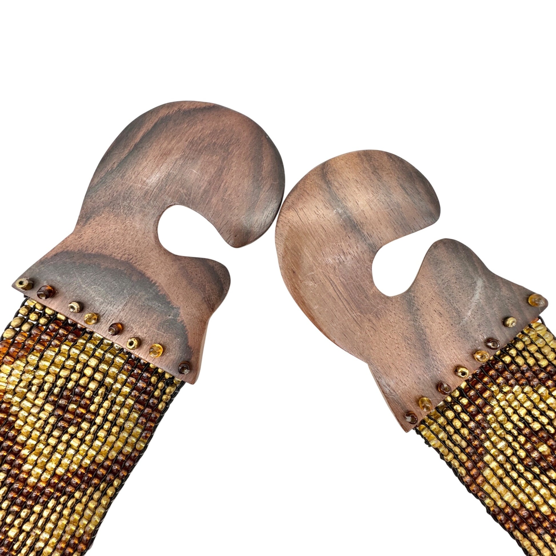 Brown and Gold Beaded Elastic Belt With Wooden Interlocking Buckle 31 Inch Long