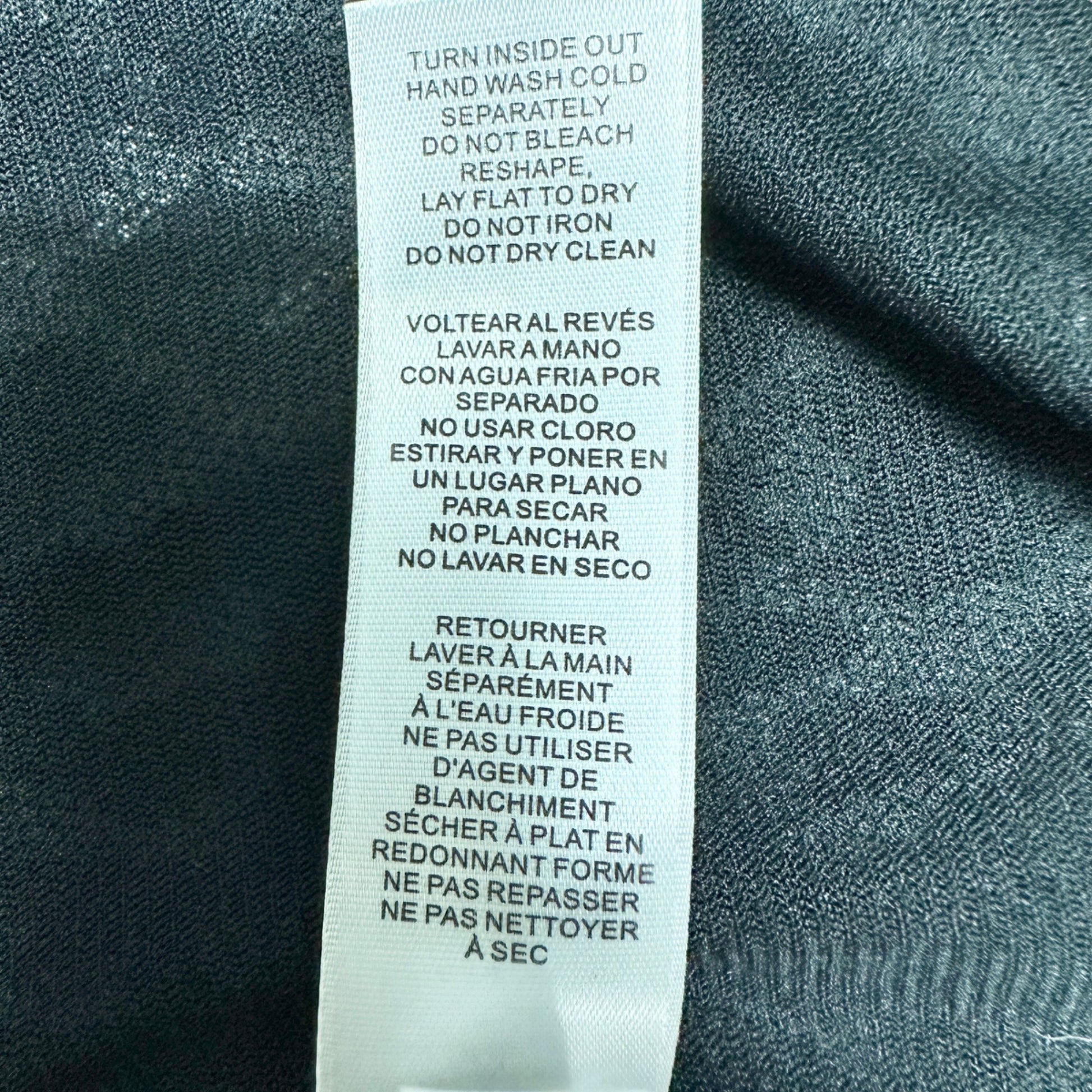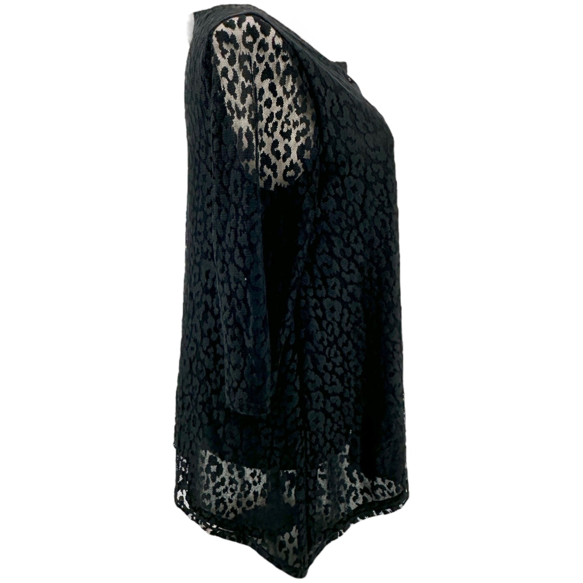 This black tunic tells a tale of elegance. With its leopard burnout pattern and sheer 3/4 sleeves, it blends wild charm and sophistication. A Chico's size 2, it's crafted from a soft nylon-polyester blend, ensuring comfort and style unite effortlessly.