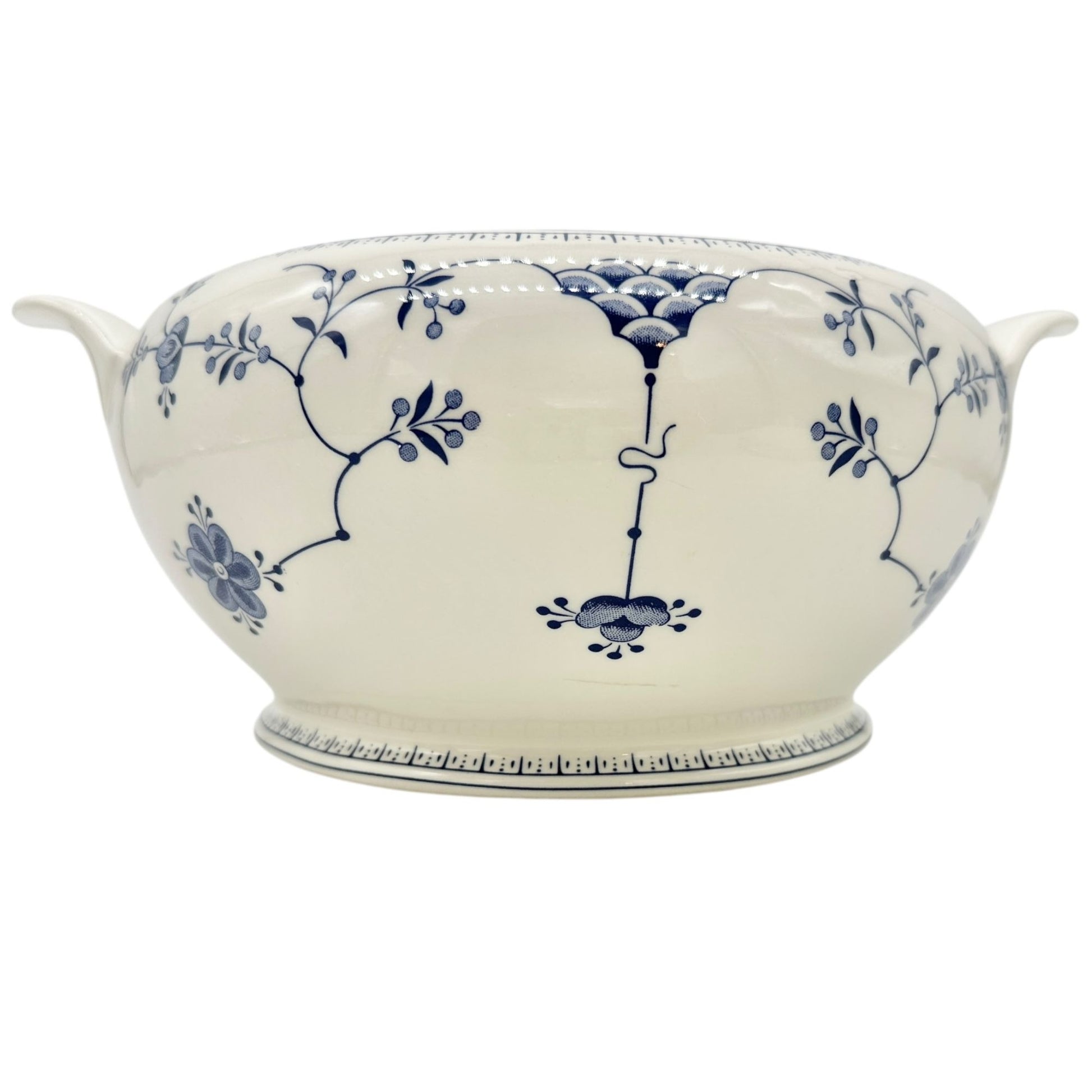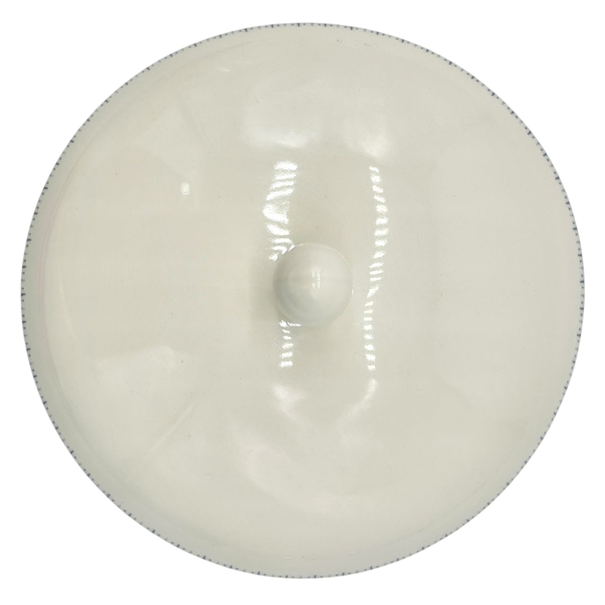 Crafted by Churchill in England, this timeless white serving bowl adorned with delicate blue floral designs exudes elegance. The lidded design keeps contents warm, while its 8" size is practical for family gatherings or intimate dinners. Perfect for vegetables. A piece that brings history and artistry to your table.
