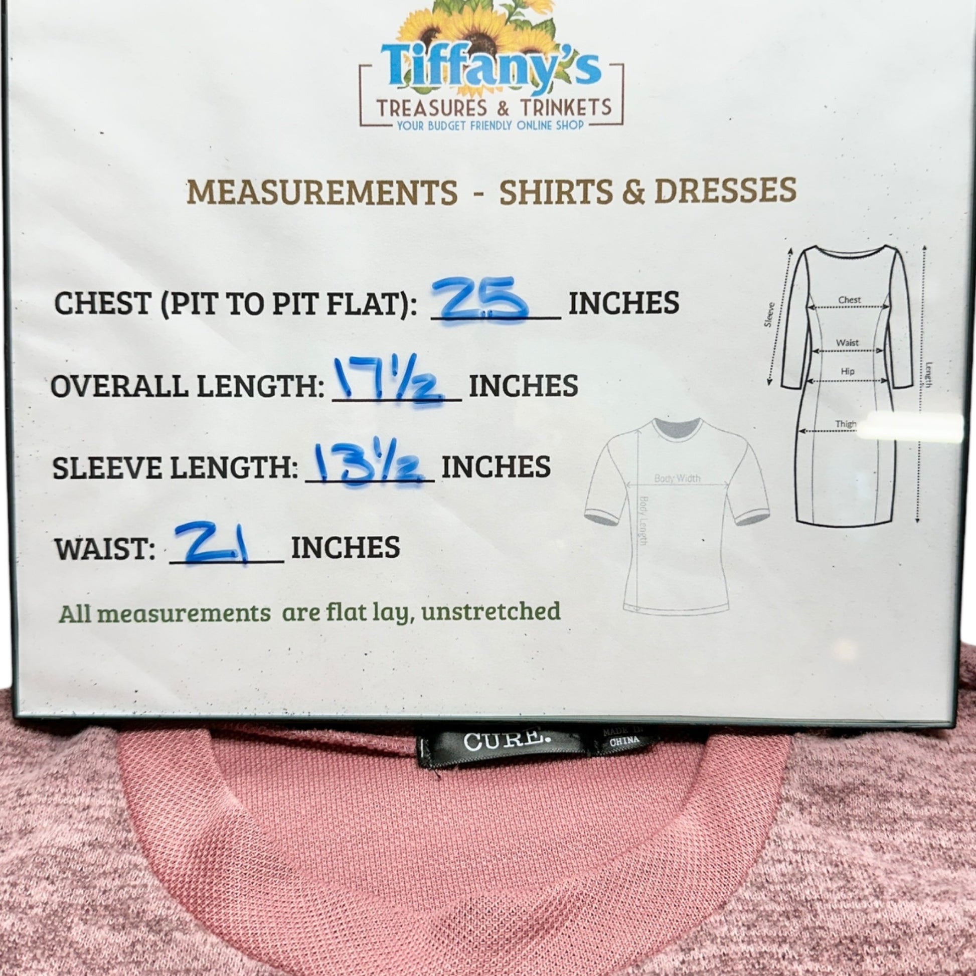 No visible flaws. Chest (pit to pit flat) = 25 inches, Overall length = 17 1/2 inches, Sleeve length = 13 1/2 inches, Waist = 21 inches
