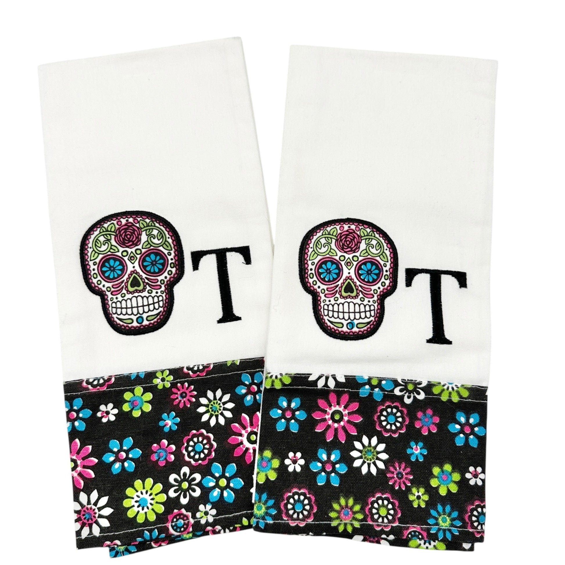 Day Of The Dead Embroidered Kitchen Towels Floral Trim Set Of 2 Sugar Skulls