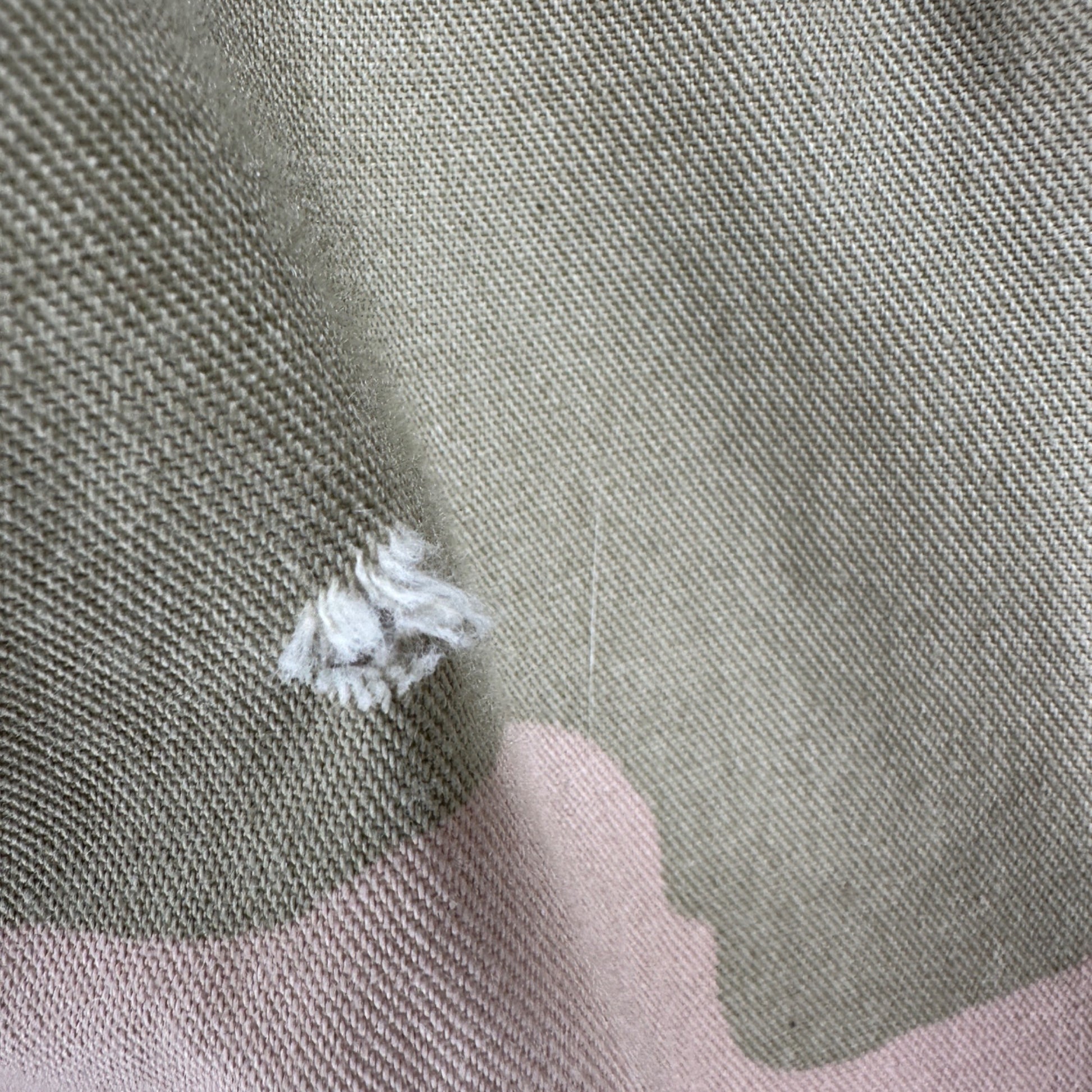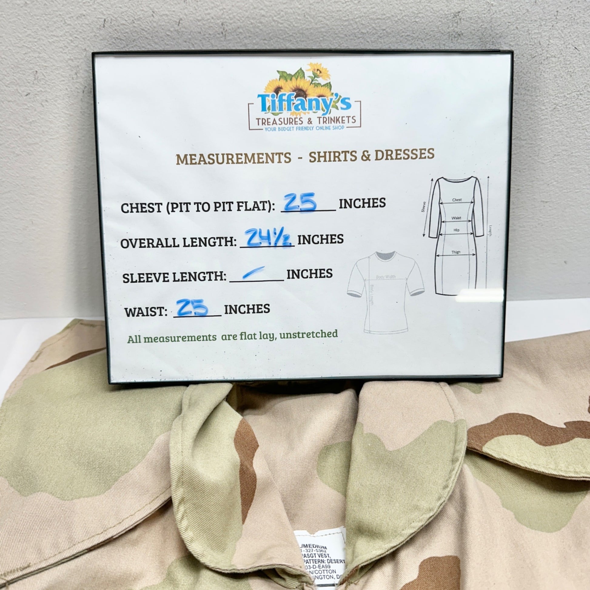 Small hole on the front near pocket. Measurements: chest = 25 inches, overall length = 24.5 inches, waist = 25 inches.