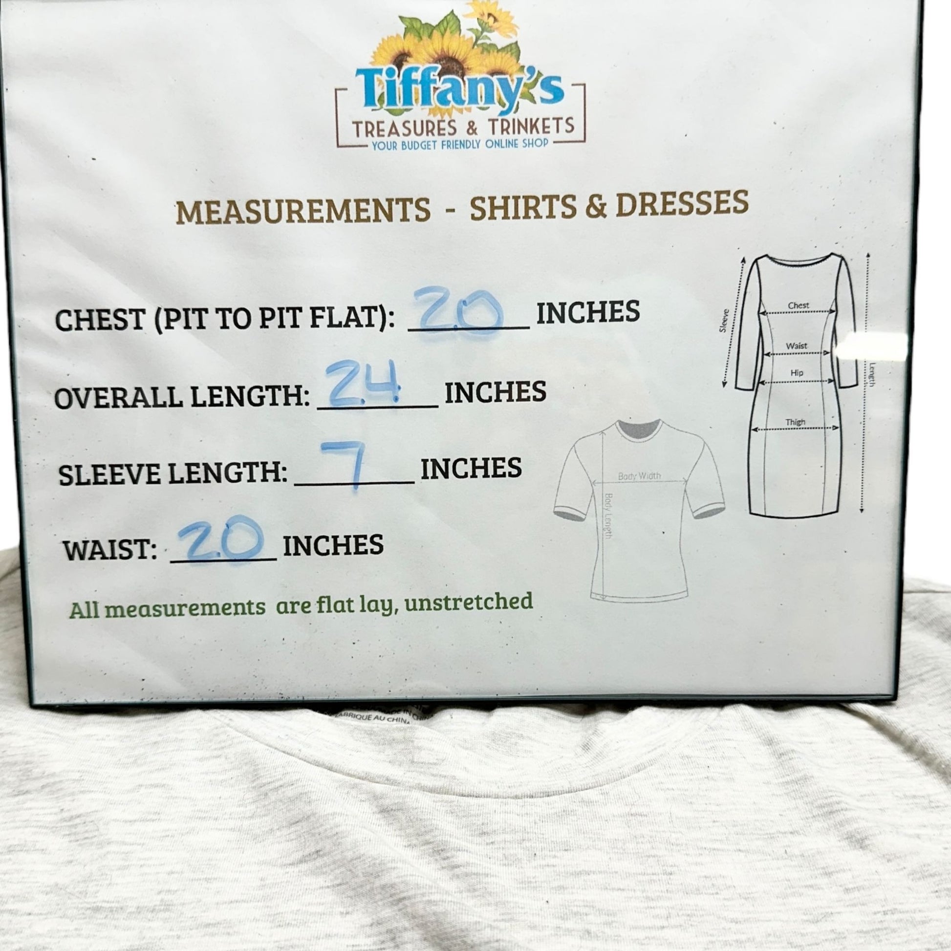 No visible flaws. Measurements: Chest (Pit to Pit Flat): 20 inches, Overall Length: 24 inches, Sleeve Length: 7 inches, Waist: 20 inches.