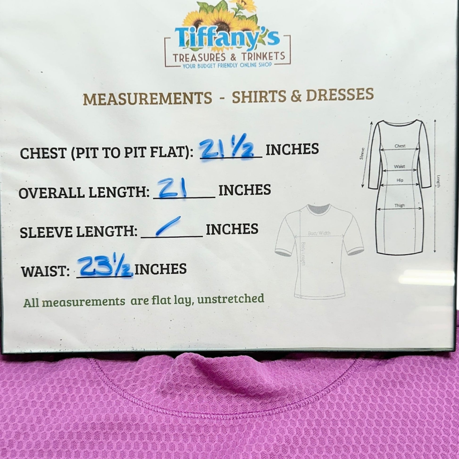 Chest = 21.5 inches, Overall length = 21 inches, Waist = 23.5 inches