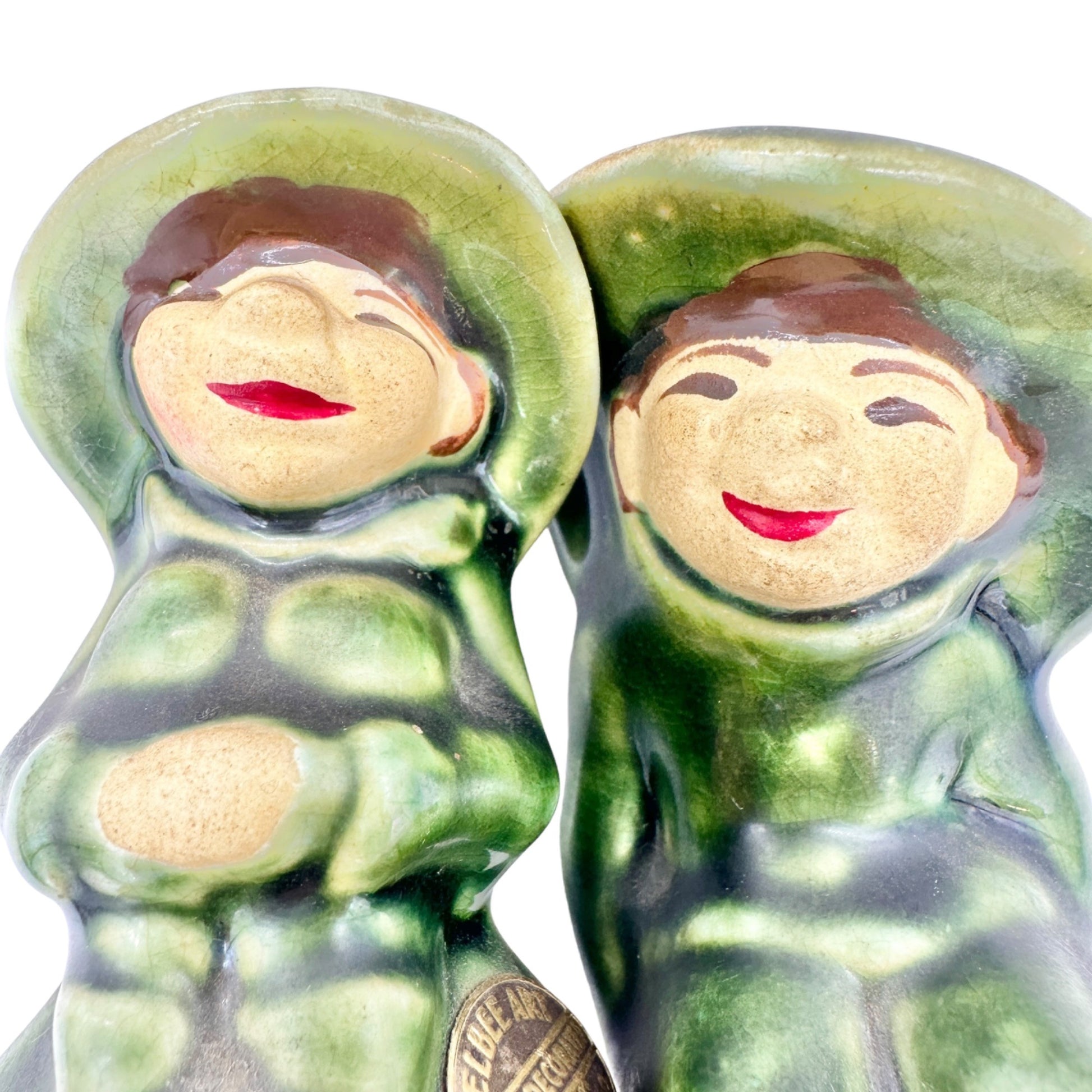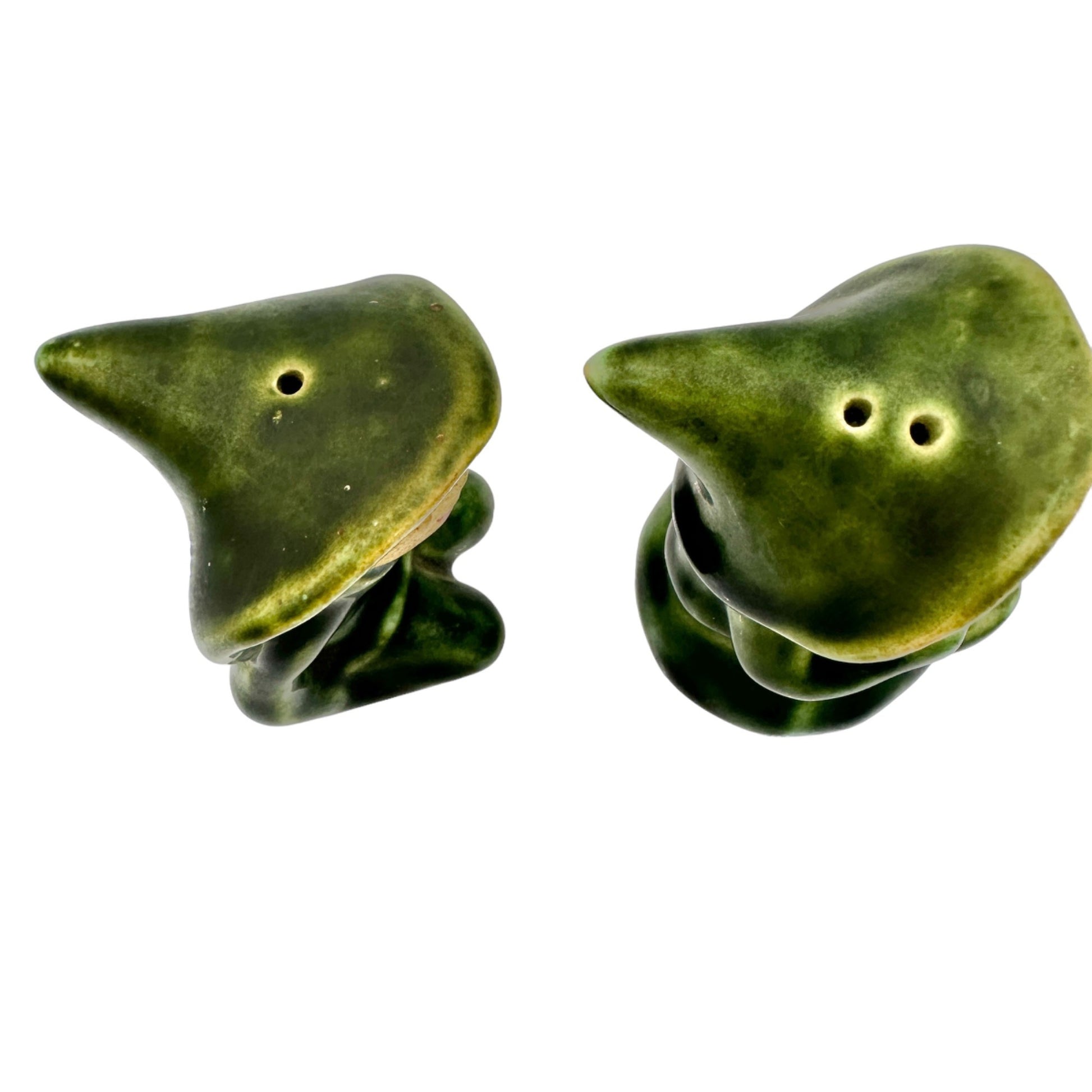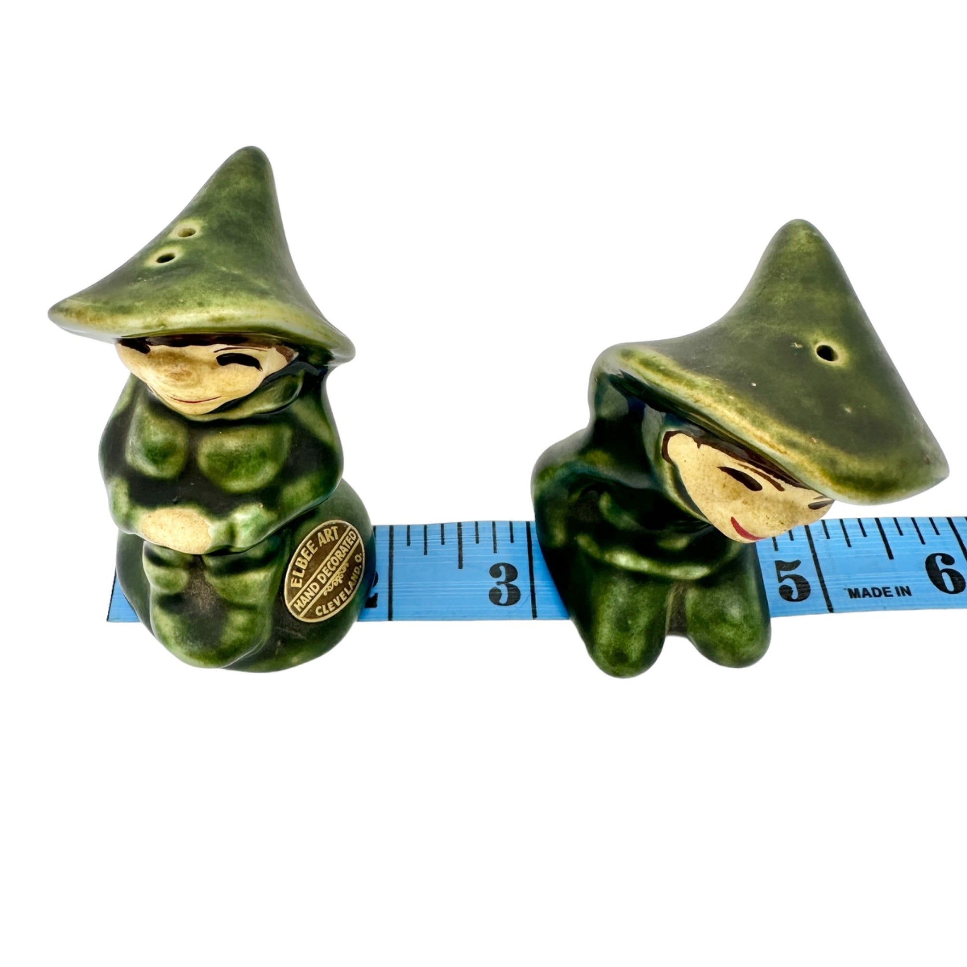 Vintage Elbee Art salt and pepper shaker set featuring a whimsical pixie elf design. Handcrafted in Cleveland, Ohio, these unique pottery pieces add charm to any table setting or collection.