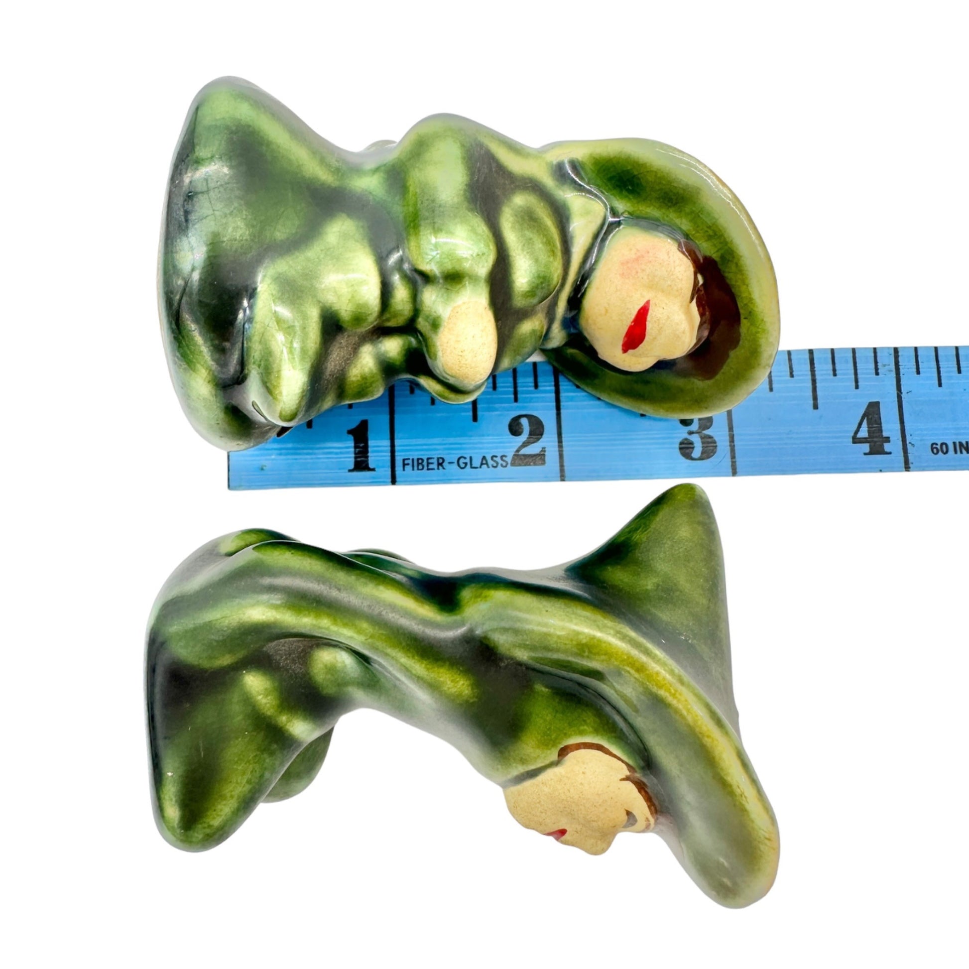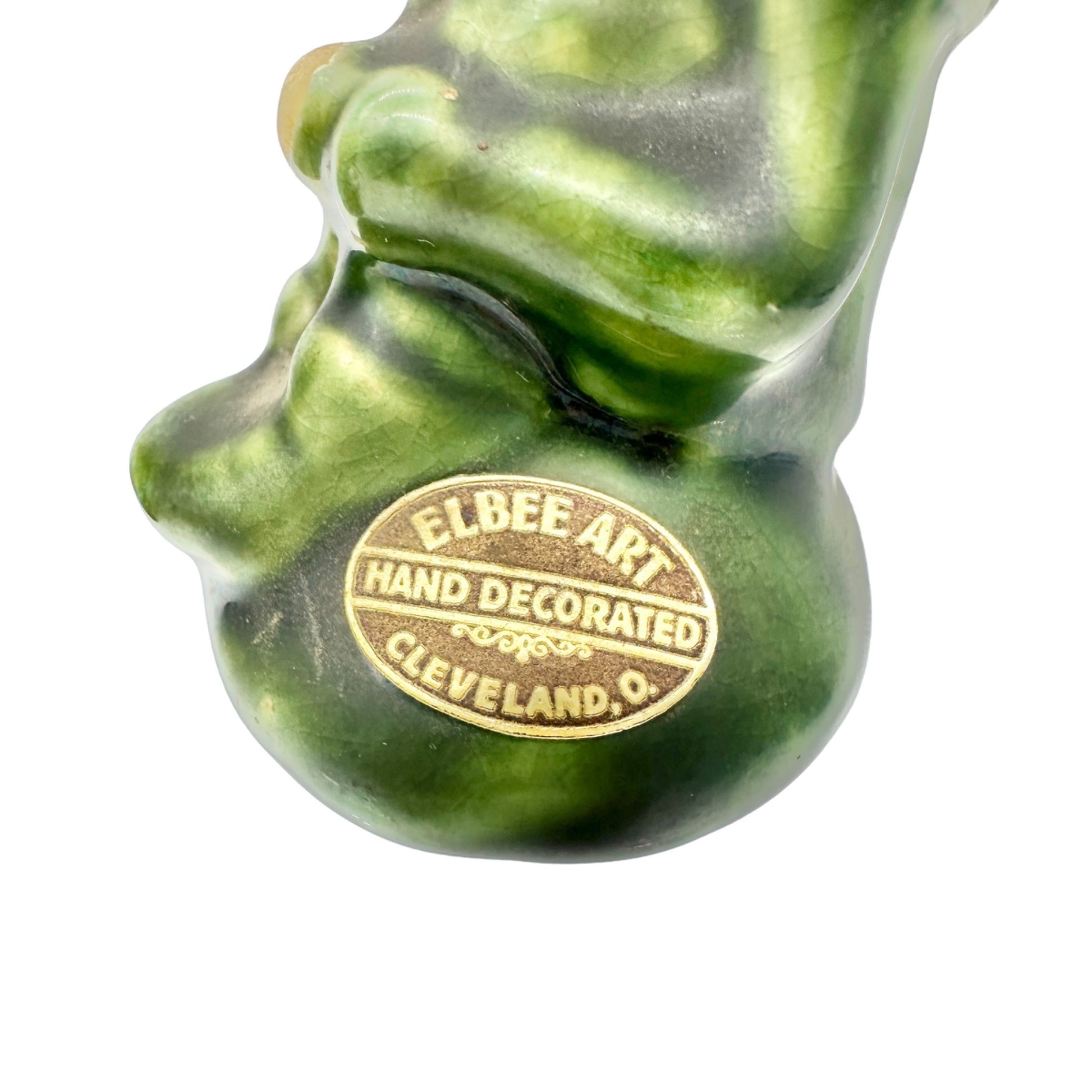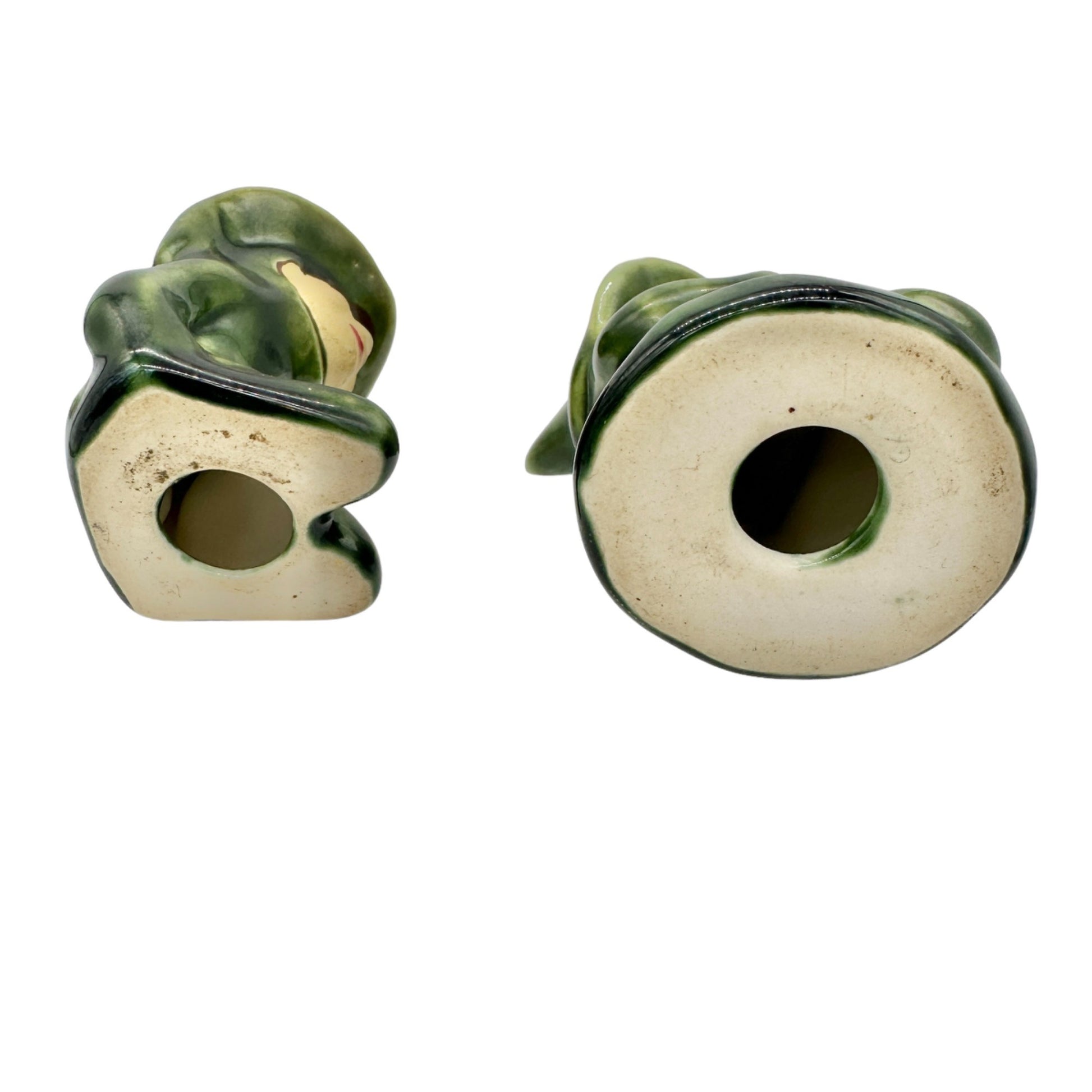 Vintage Elbee Art salt and pepper shaker set featuring a whimsical pixie elf design. Handcrafted in Cleveland, Ohio, these unique pottery pieces add charm to any table setting or collection.