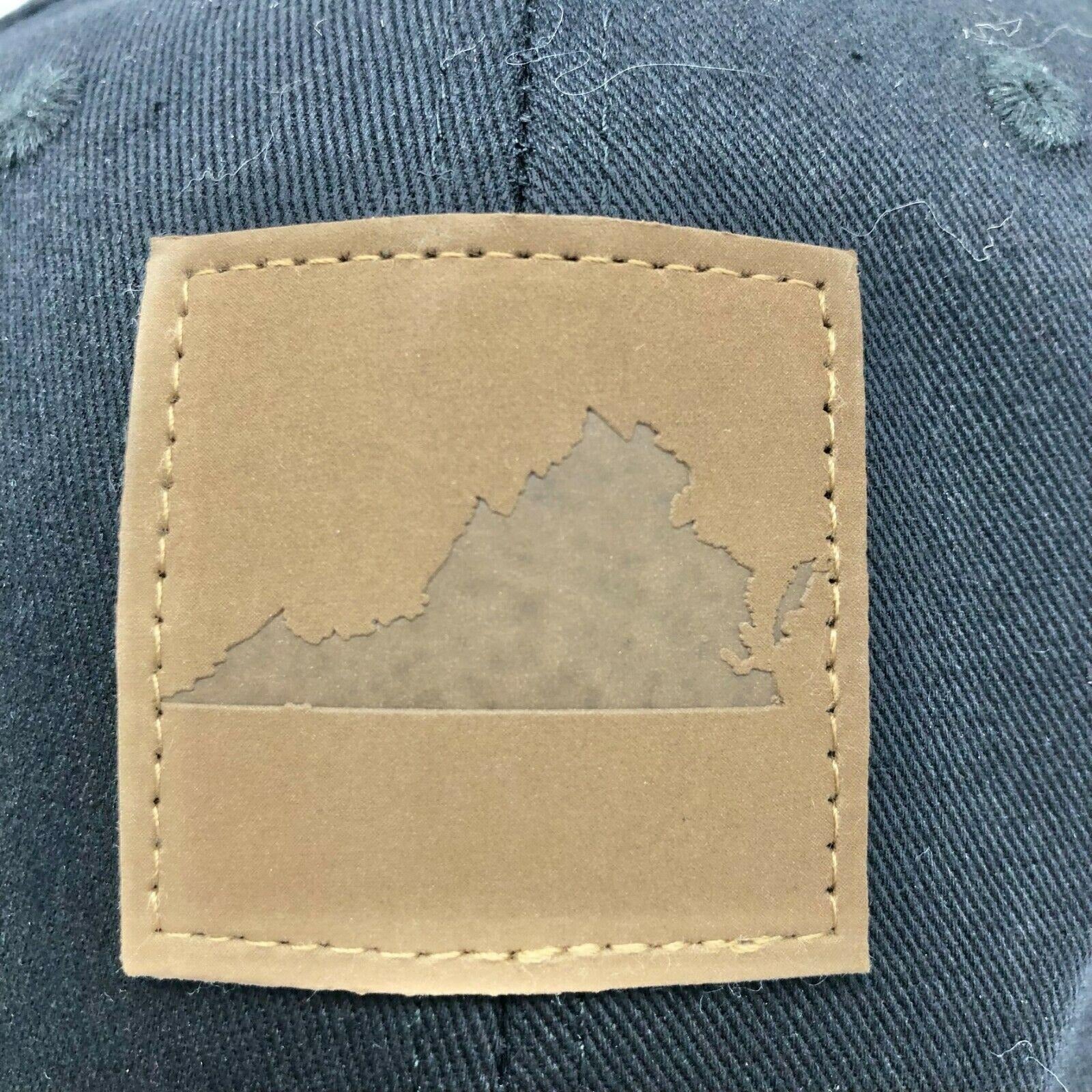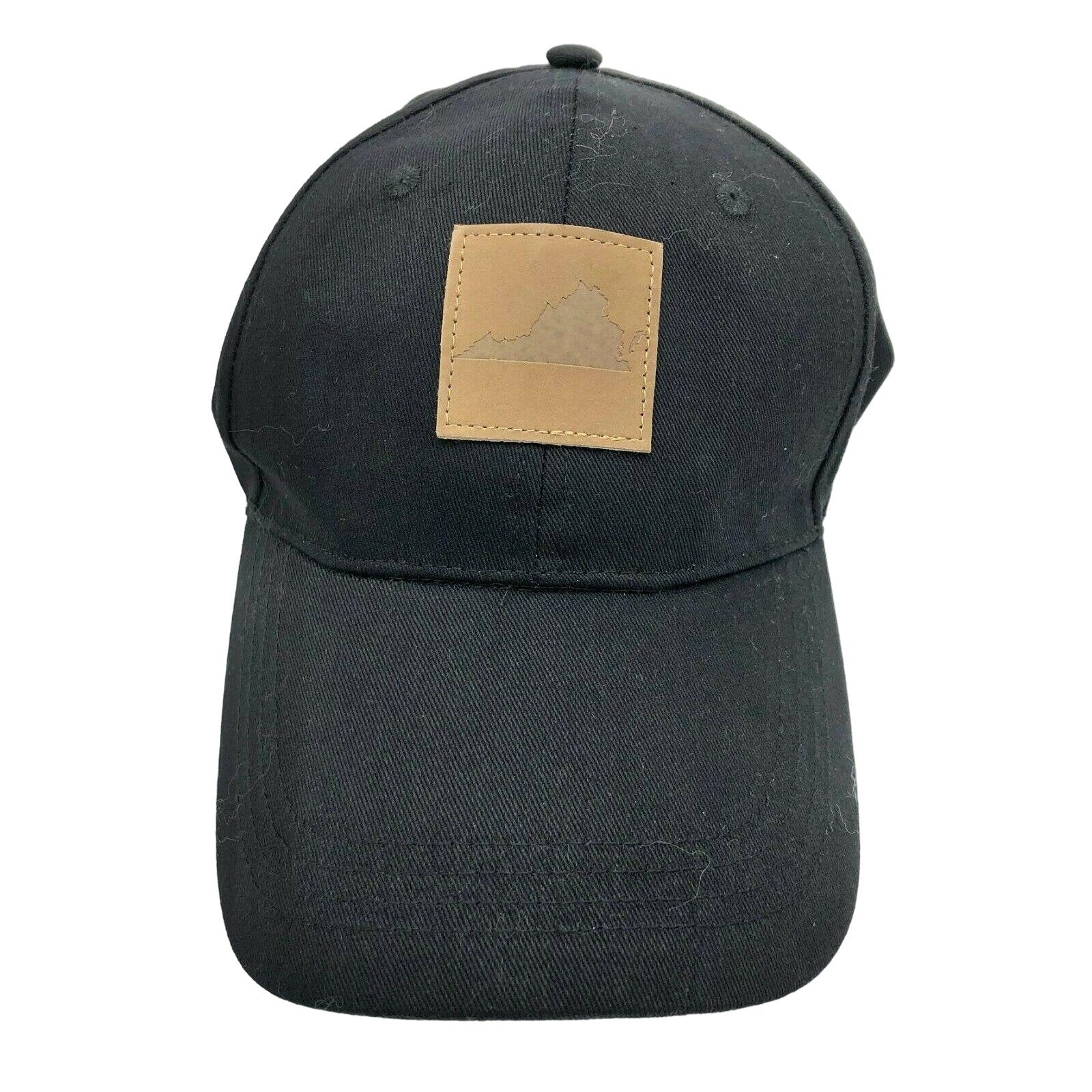 Design: Black adjustable ball cap with tan faux leather patch on front with outline of Virginia stamped on it