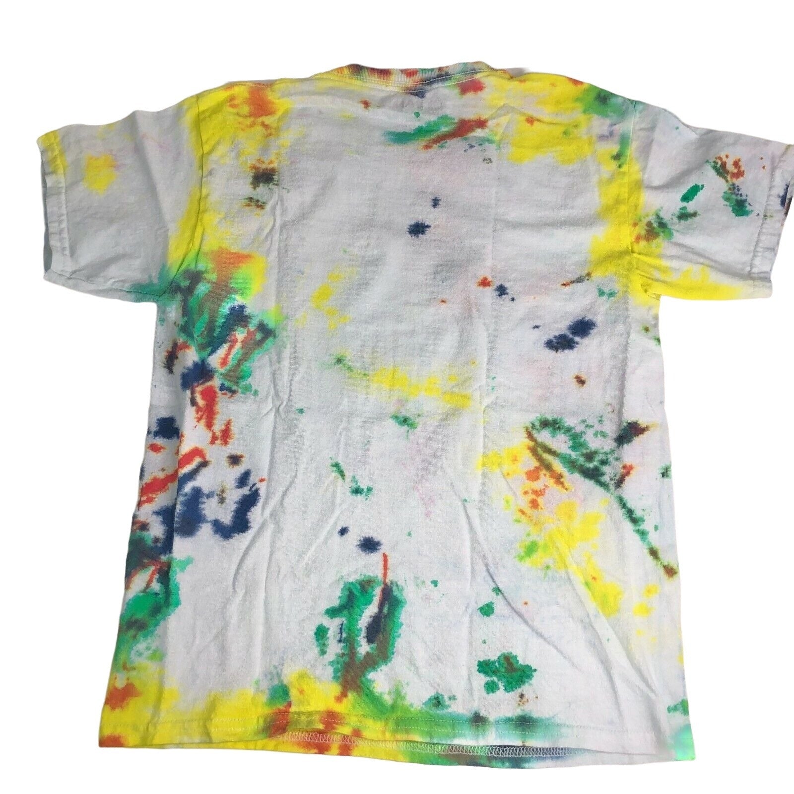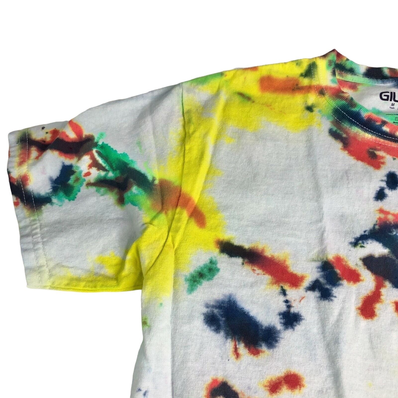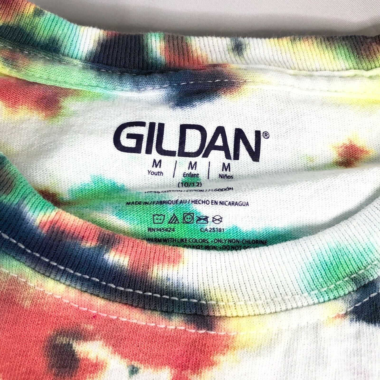Enjoy the groovy splatter of color in this youth medium Gildan tie-dye shirt. As this shirt is hand tie dyed, it is unique; there is no other exactly like it!