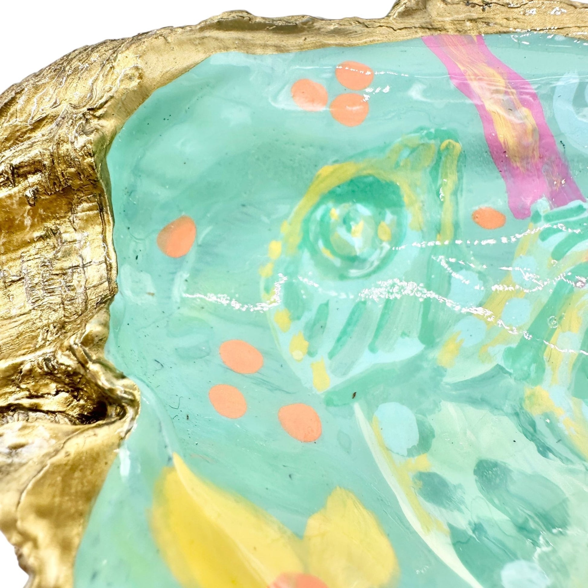 This delightful oyster shell dish was lovingly crafted and hand-painted with a charming seahorse and floral design, bordered by gold for an elegant touch. It evokes the beauty of the ocean and brings a coastal charm to your decor. A unique gift or functional piece for small treasures.