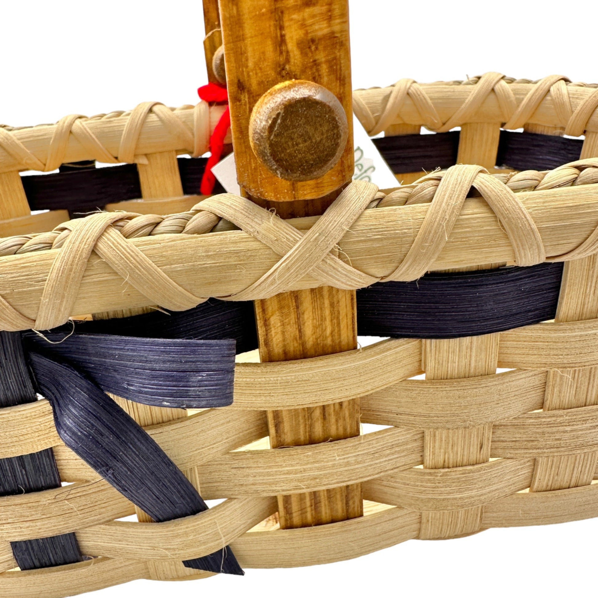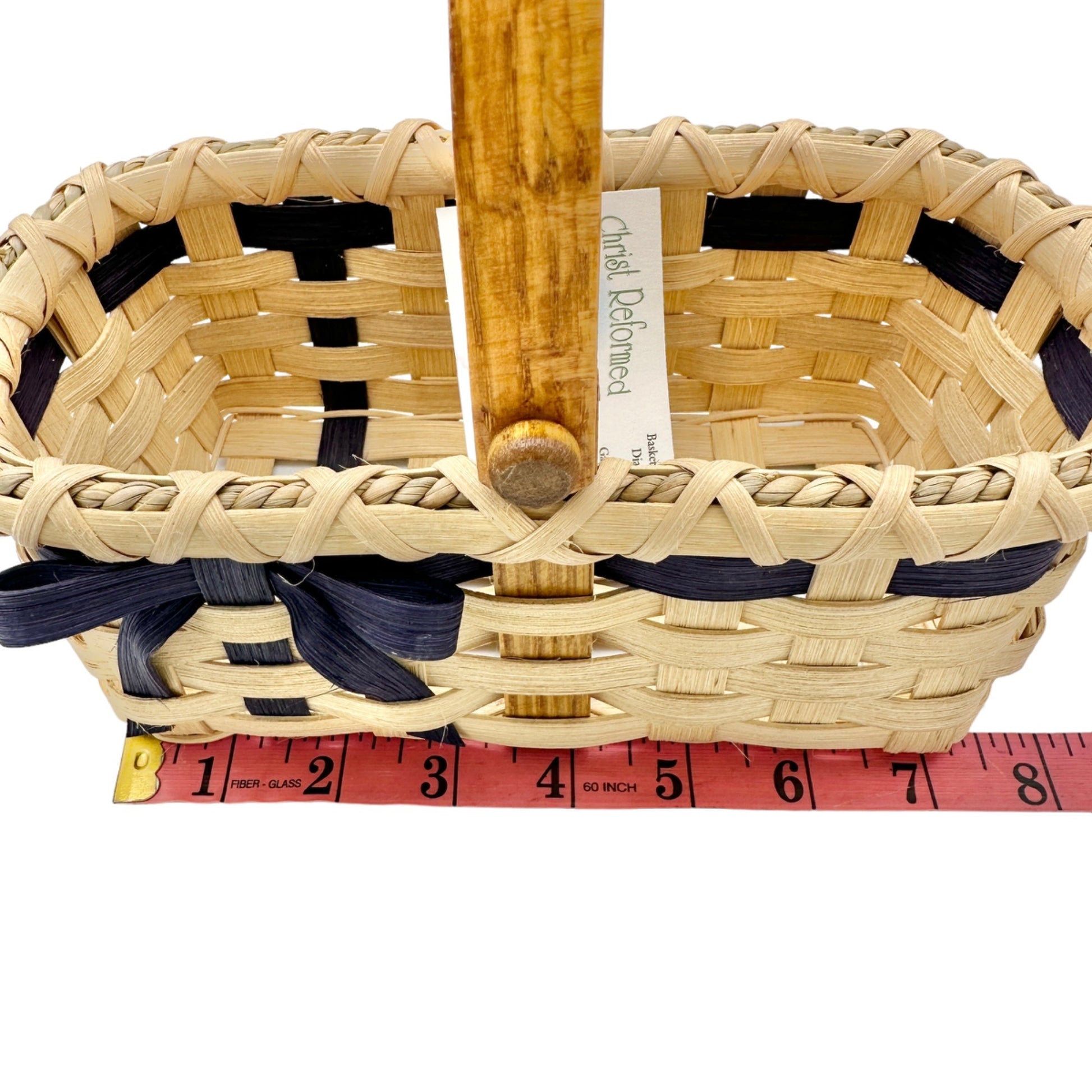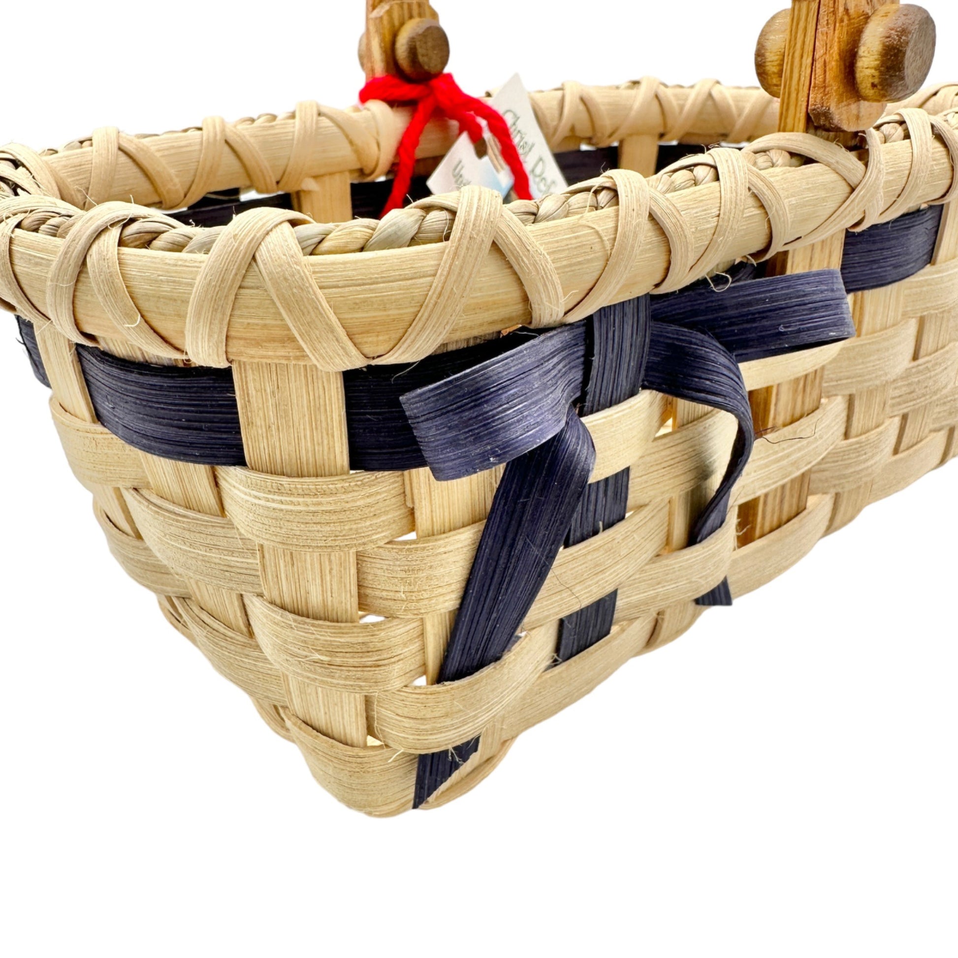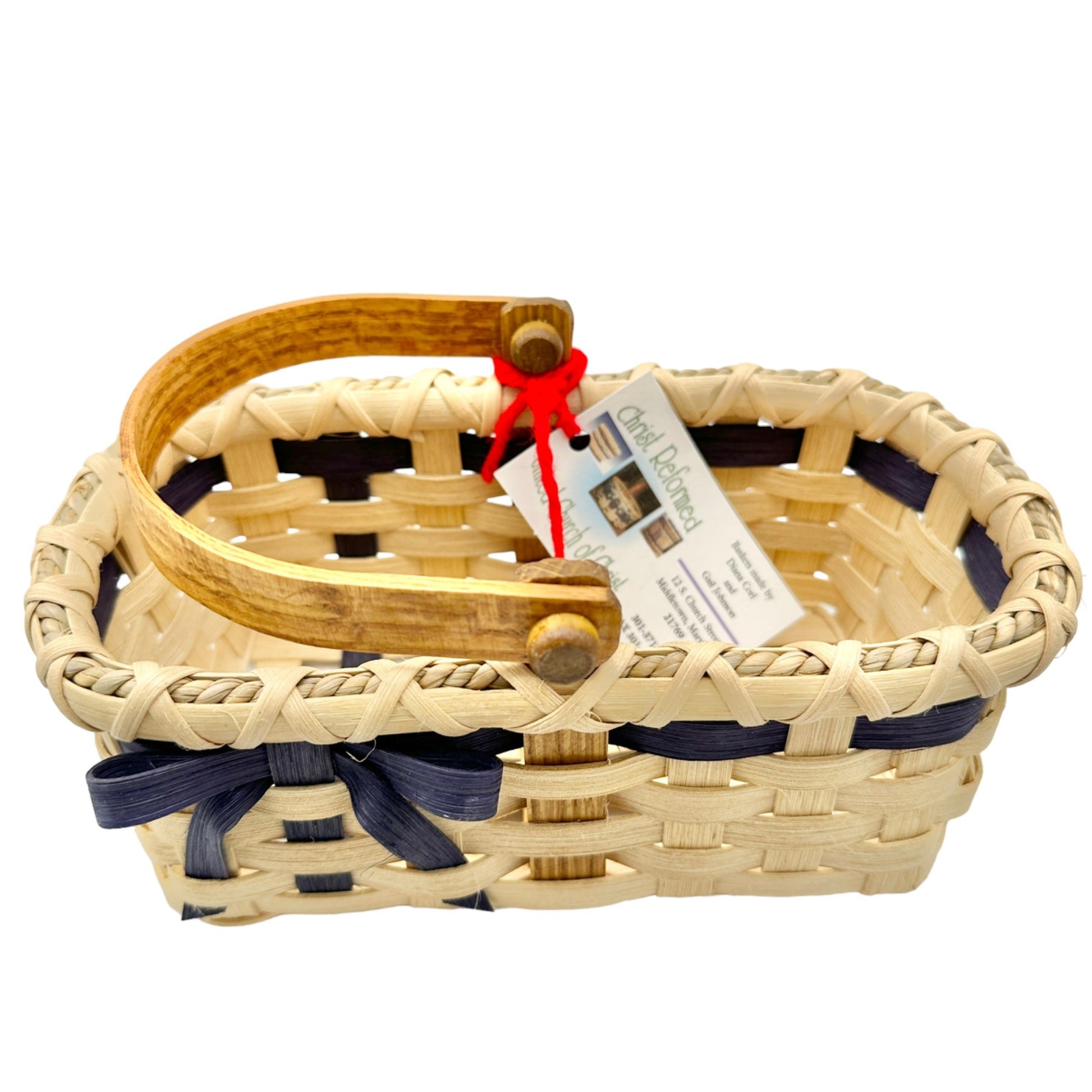 This baskets features a wooden handle that swivels up and down (right to left) and a blue reed accent piece in the shape of a ribbon and bow.