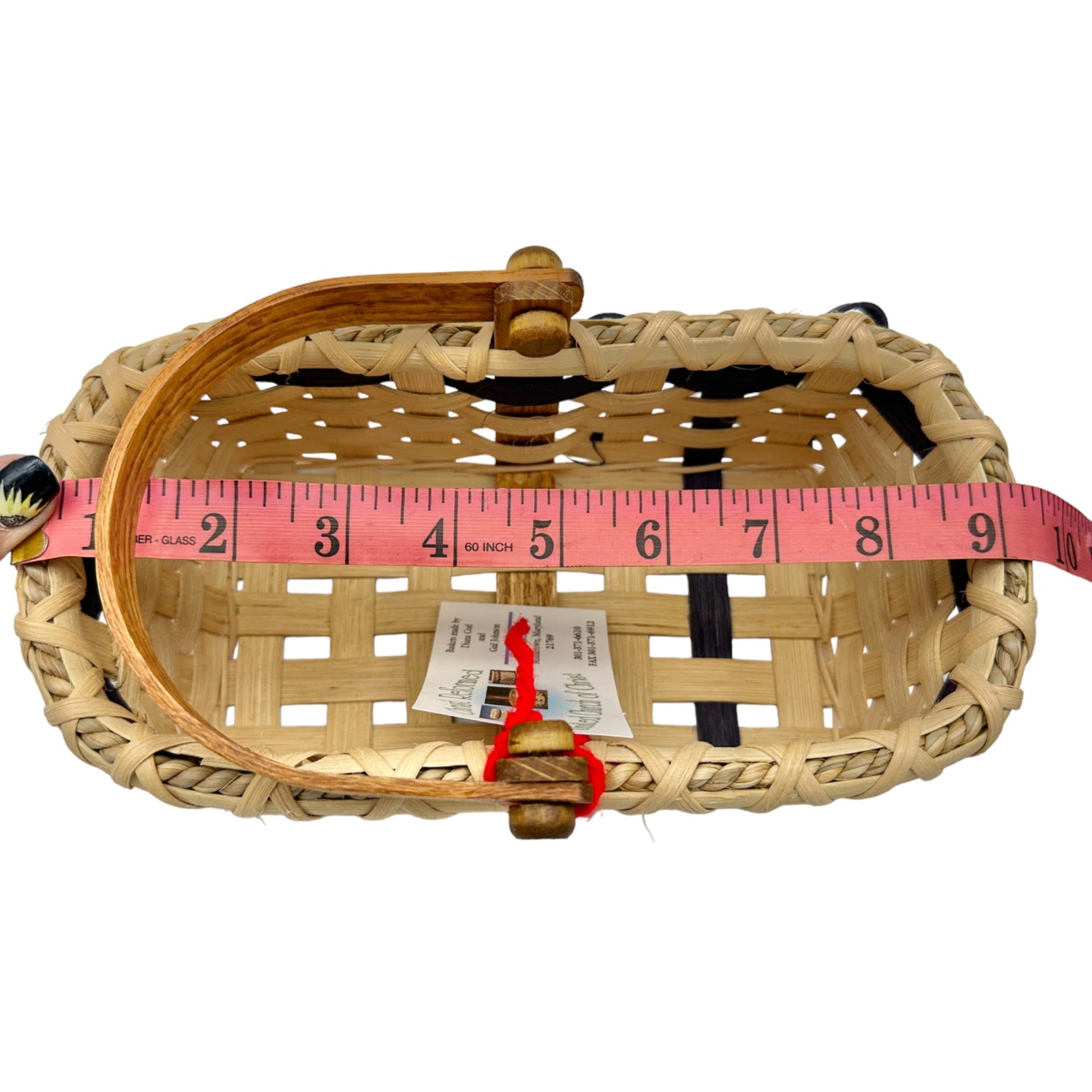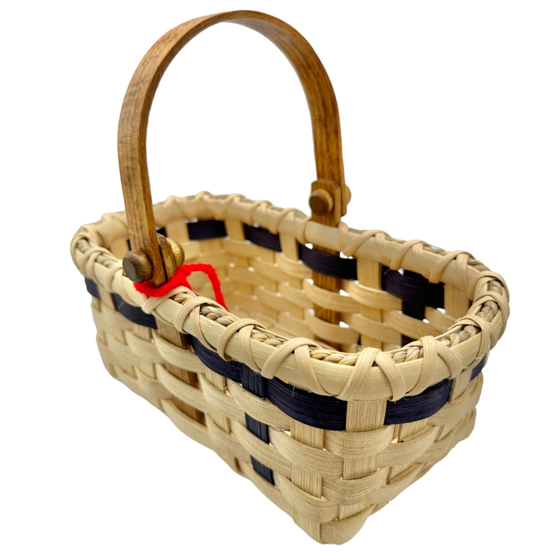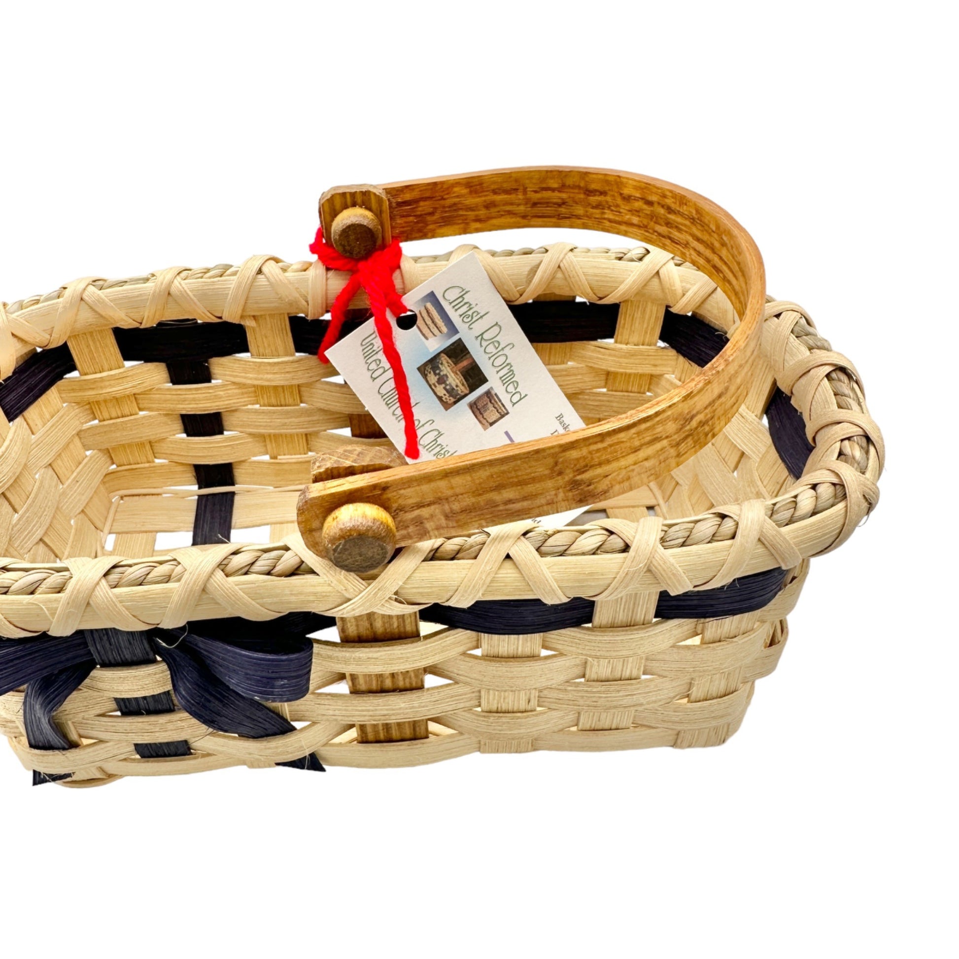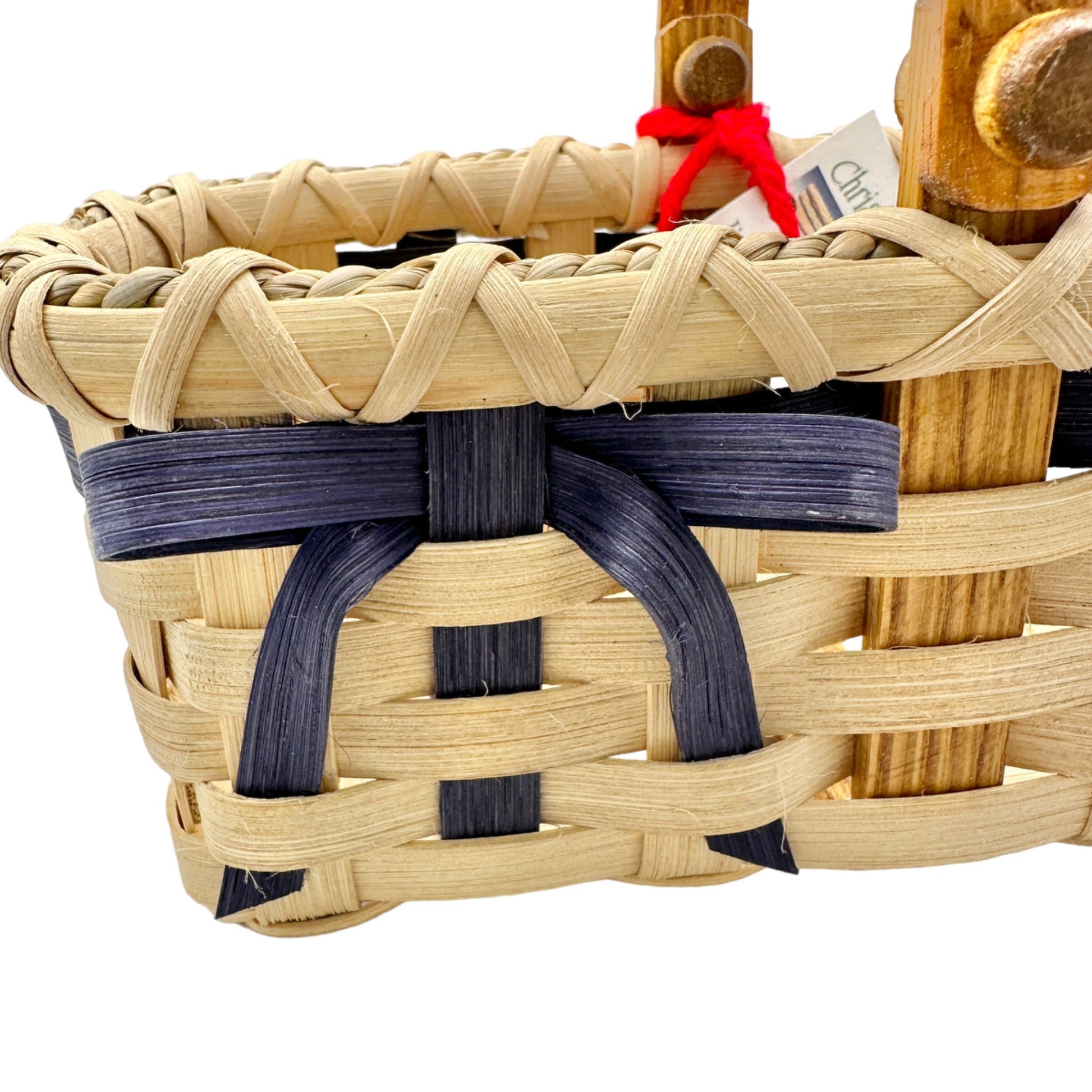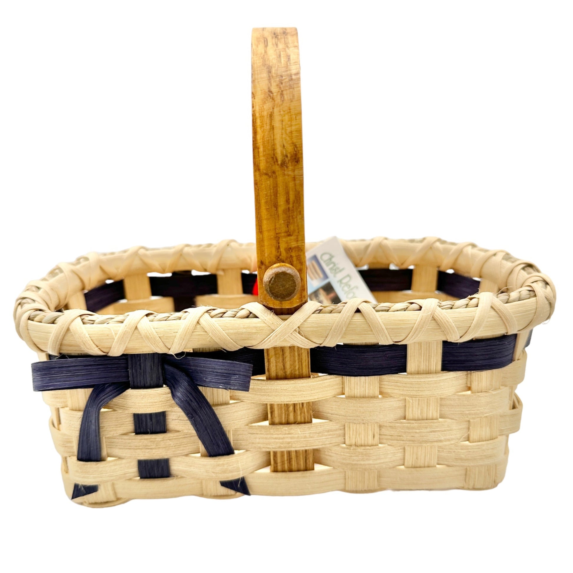 This baskets features a wooden handle that swivels up and down (right to left) and a blue reed accent piece in the shape of a ribbon and bow.
