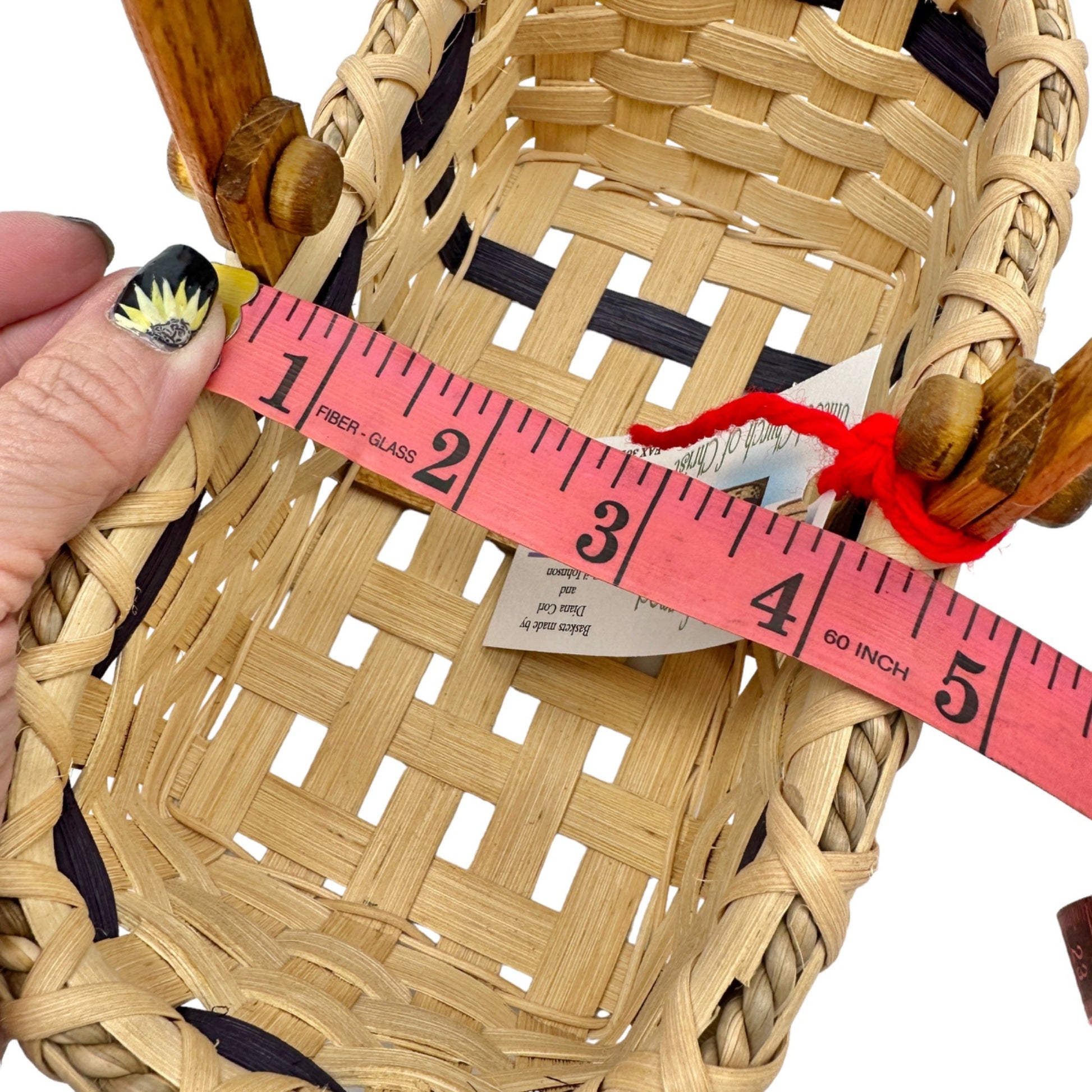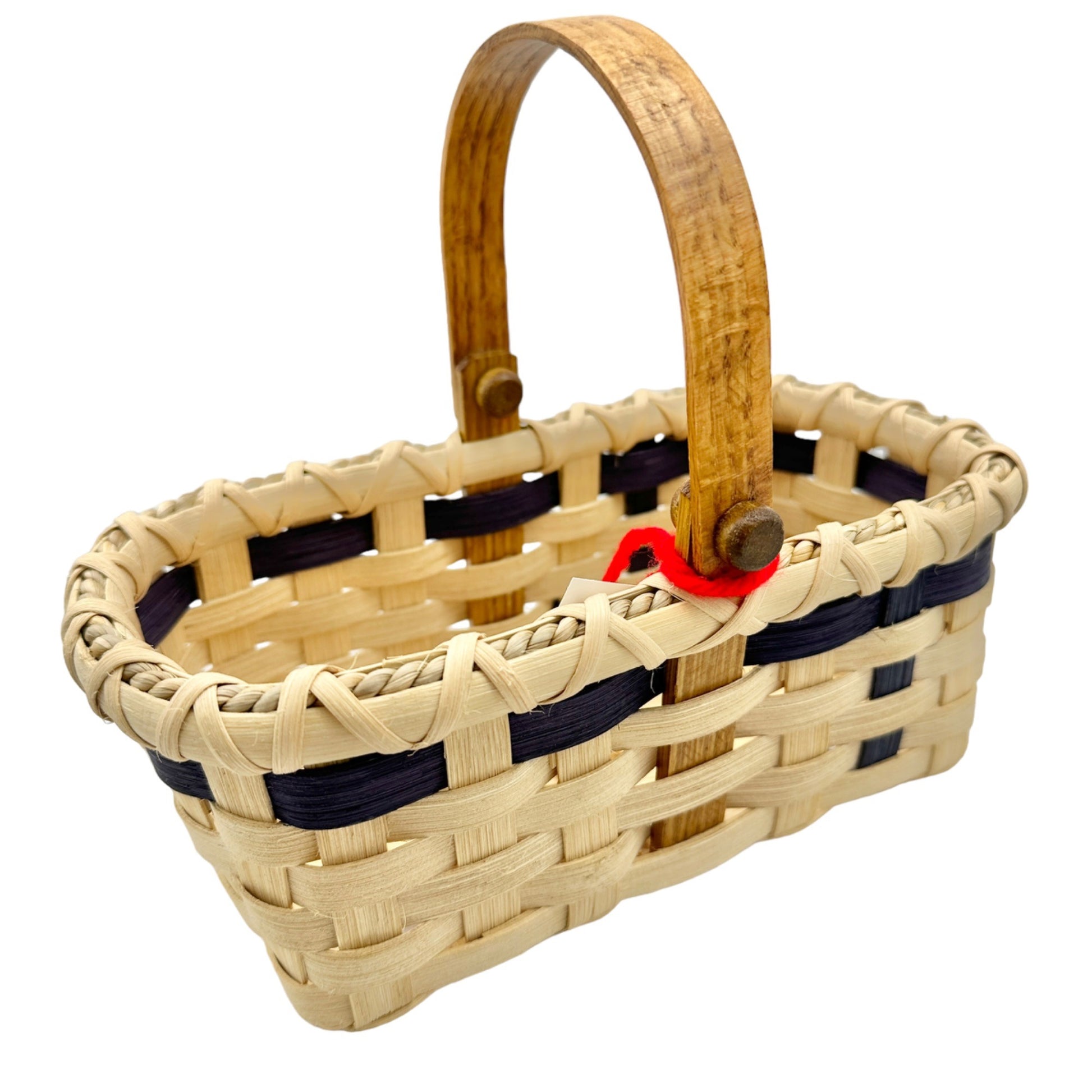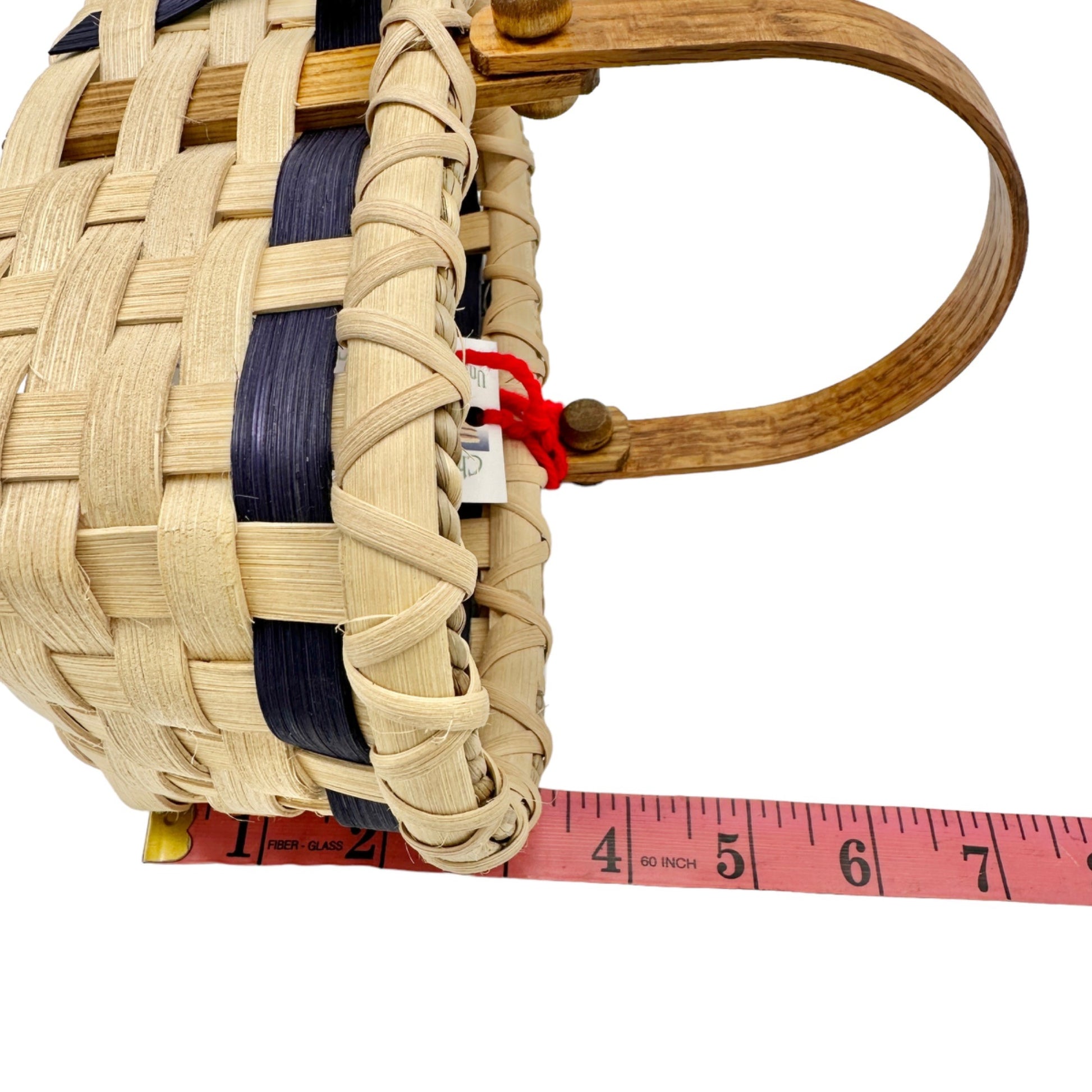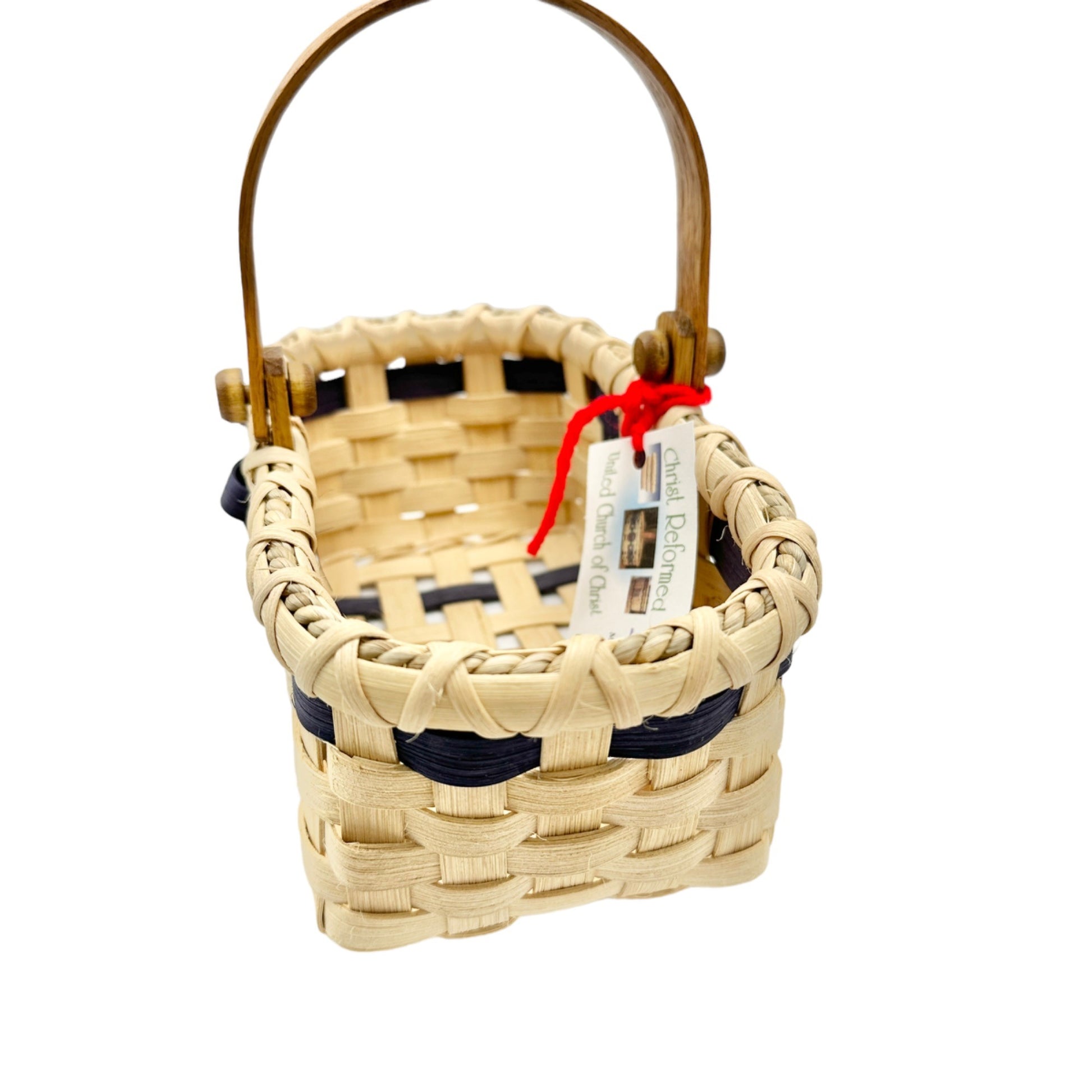 This baskets features a wooden handle that swivels up and down (right to left) and a blue reed accent piece in the shape of a ribbon and bow.