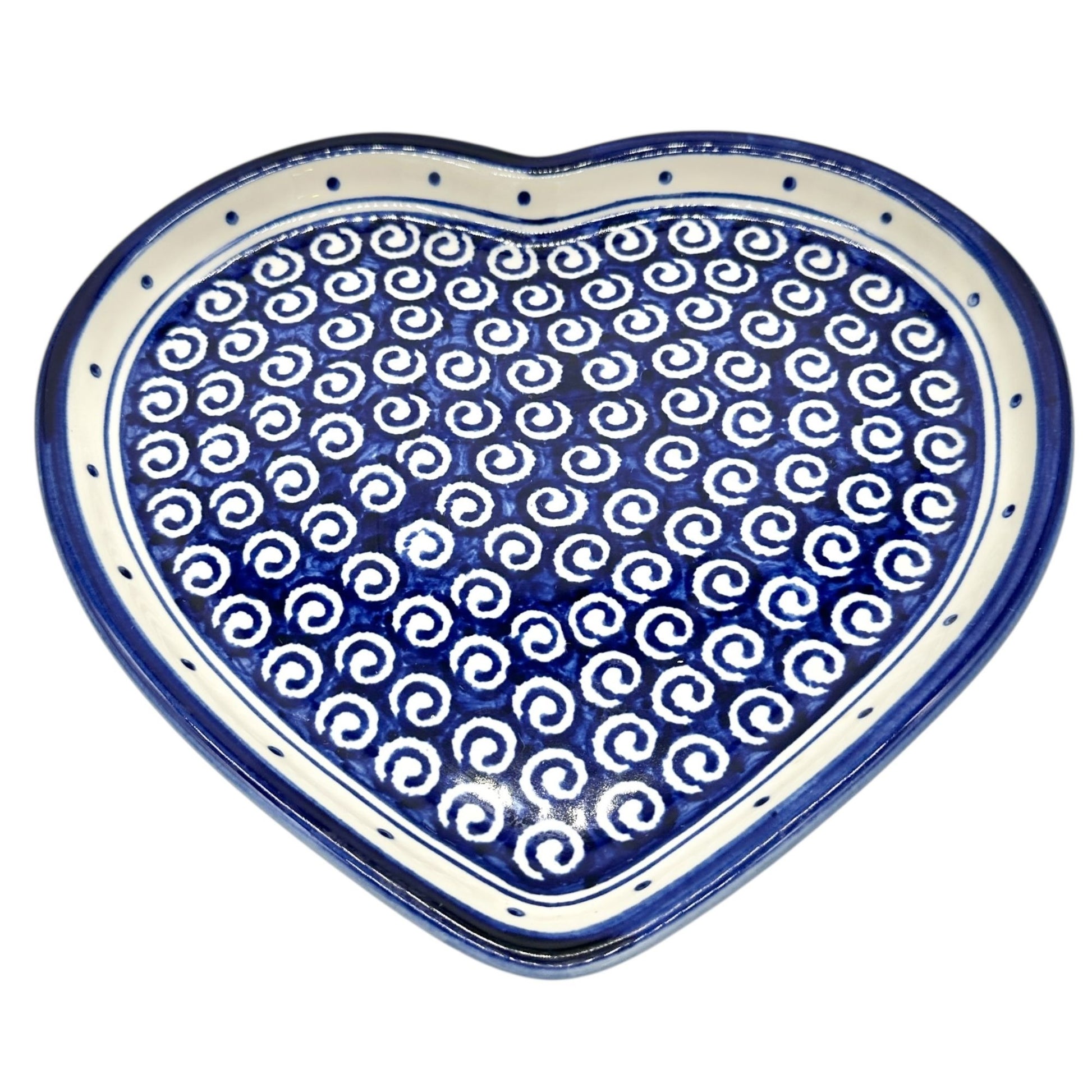 Handmade Boleslawiec Polish Pottery Heart-Shaped Plate Blue White Swirl Design