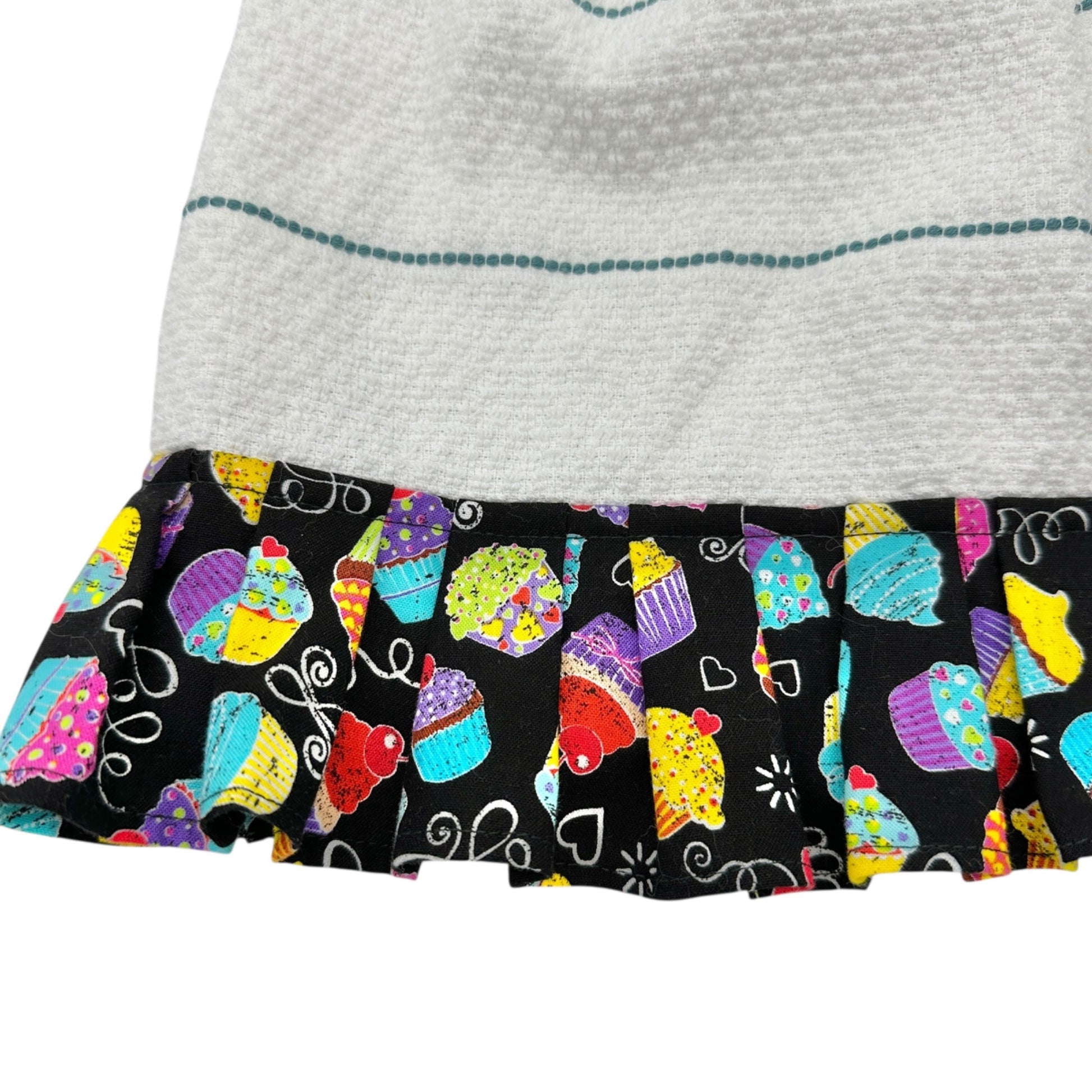 Handmade Hanging Kitchen Towel With Cupcake Print Top and Ruffle Trim Colorful