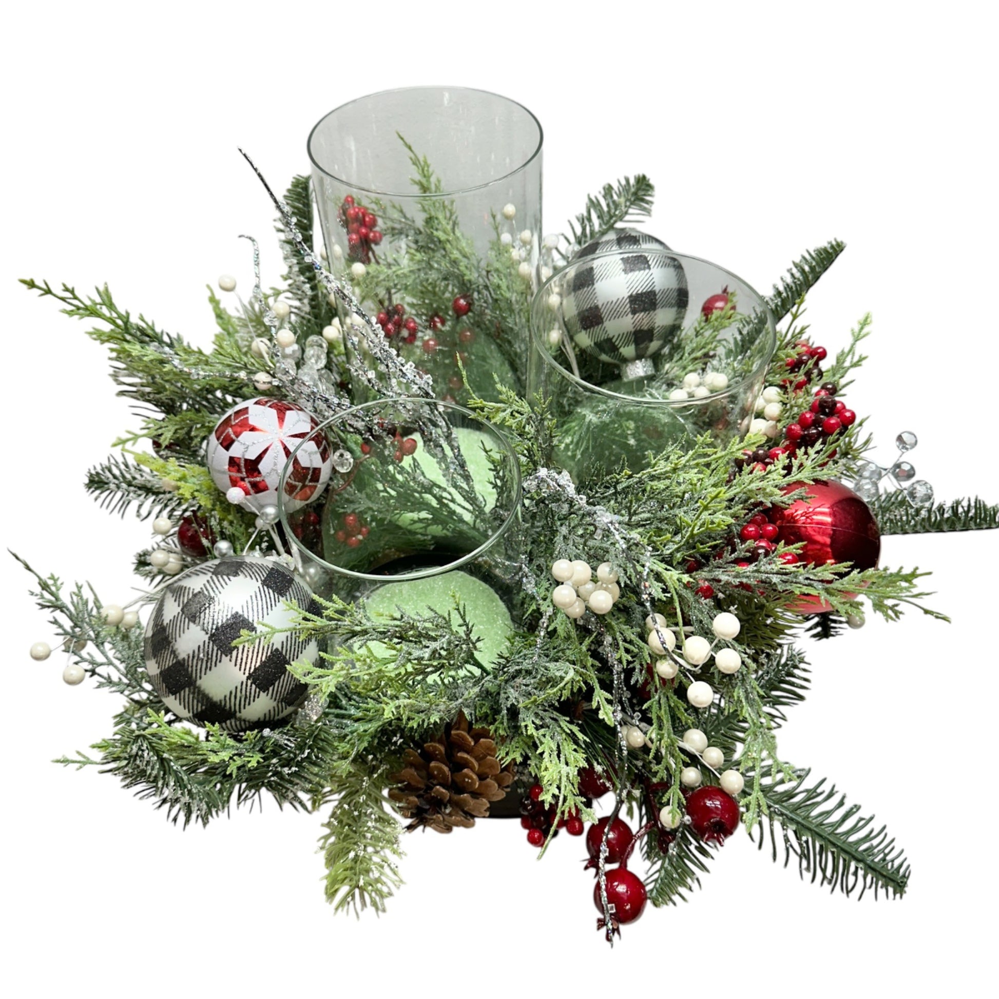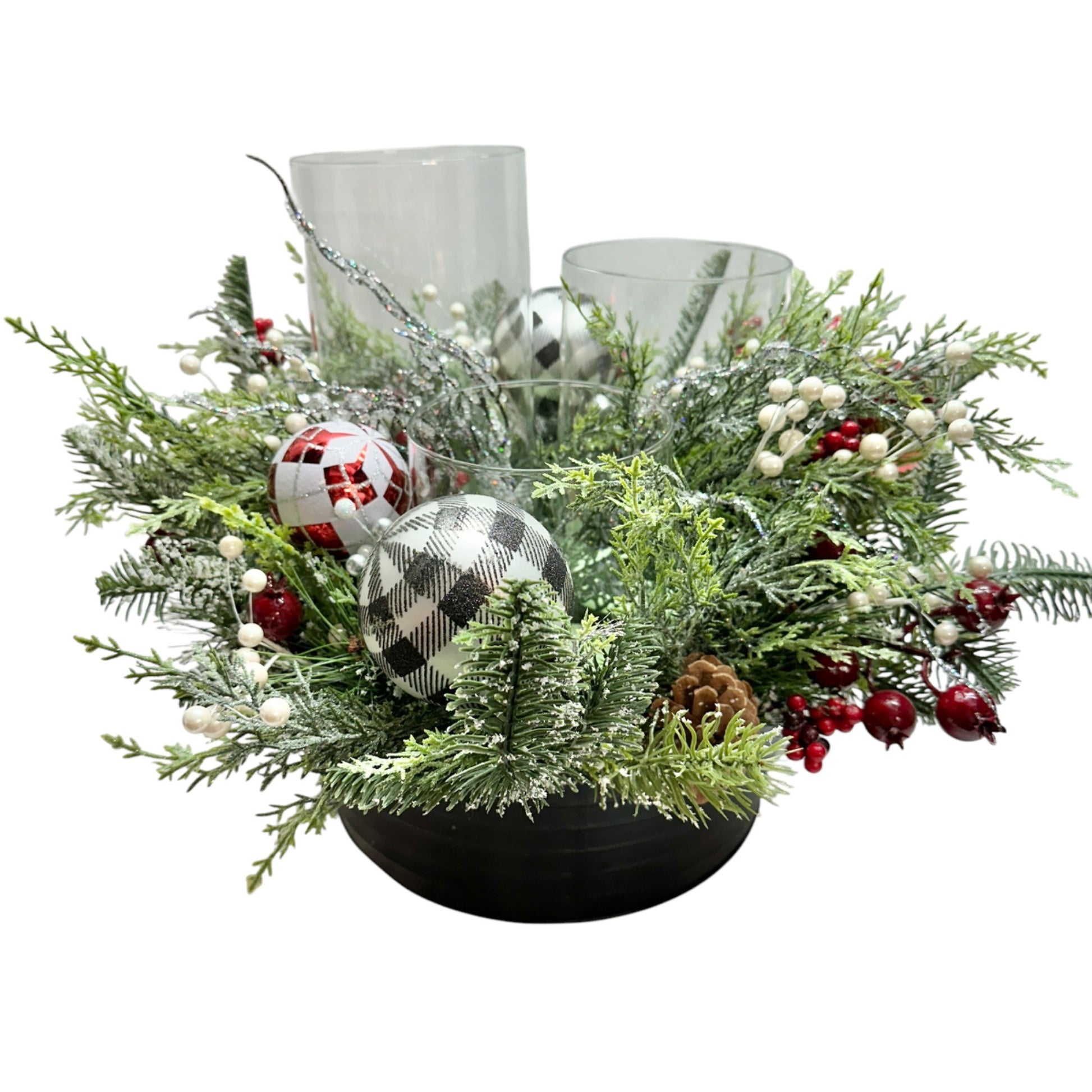 Enhance your holiday decor with this festive centerpiece that includes pinecones, ornaments, and faux greenery, presented in a sleek black planter bowl. This decorative piece brings a touch of elegance and cheer to your table or mantelpiece.