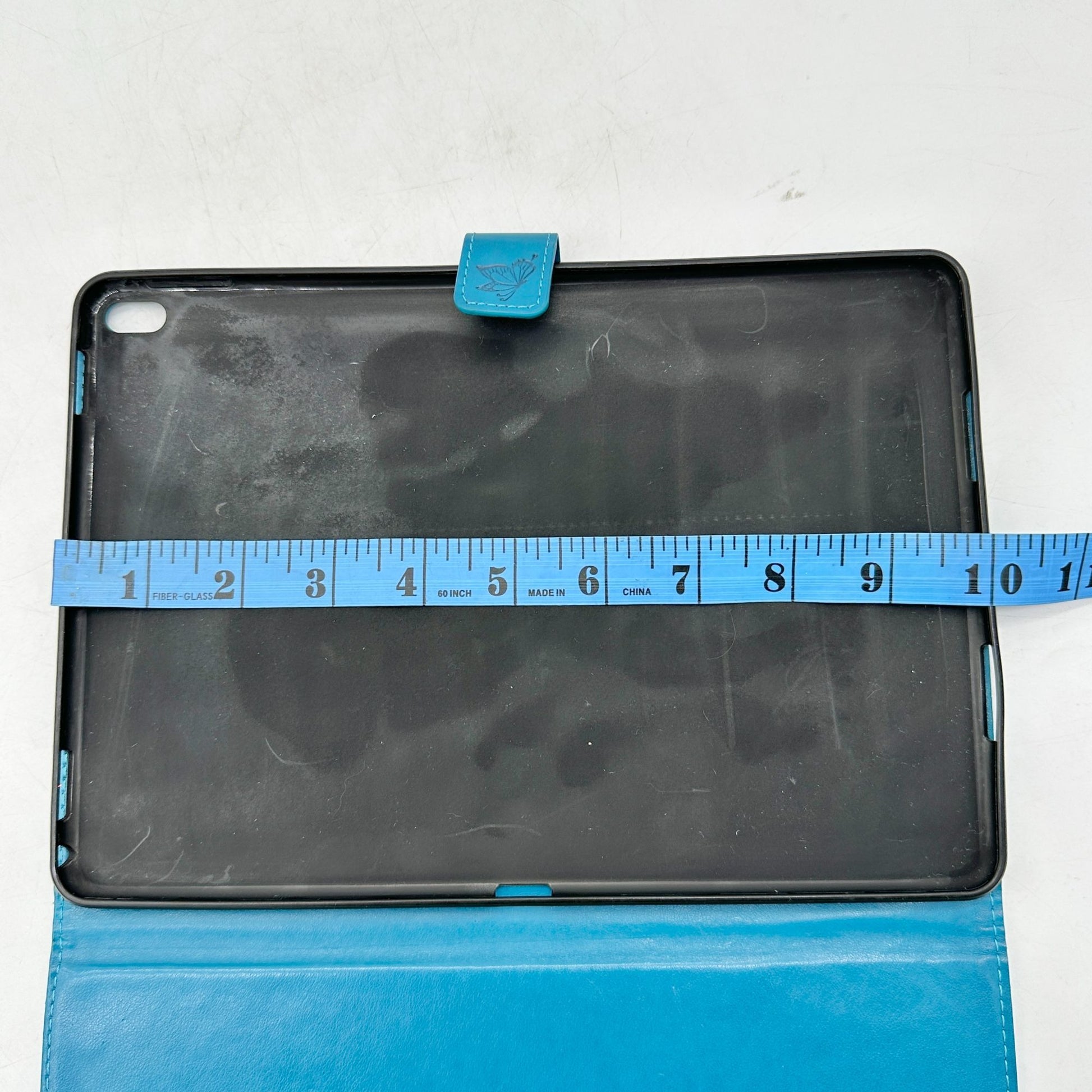 An enchanting turquoise iPad case adorned with a whimsical tree and playful cat design. It combines practical features like magnetic closure and card slots with a charming aesthetic, offering both style and functionality for your electronic device.
