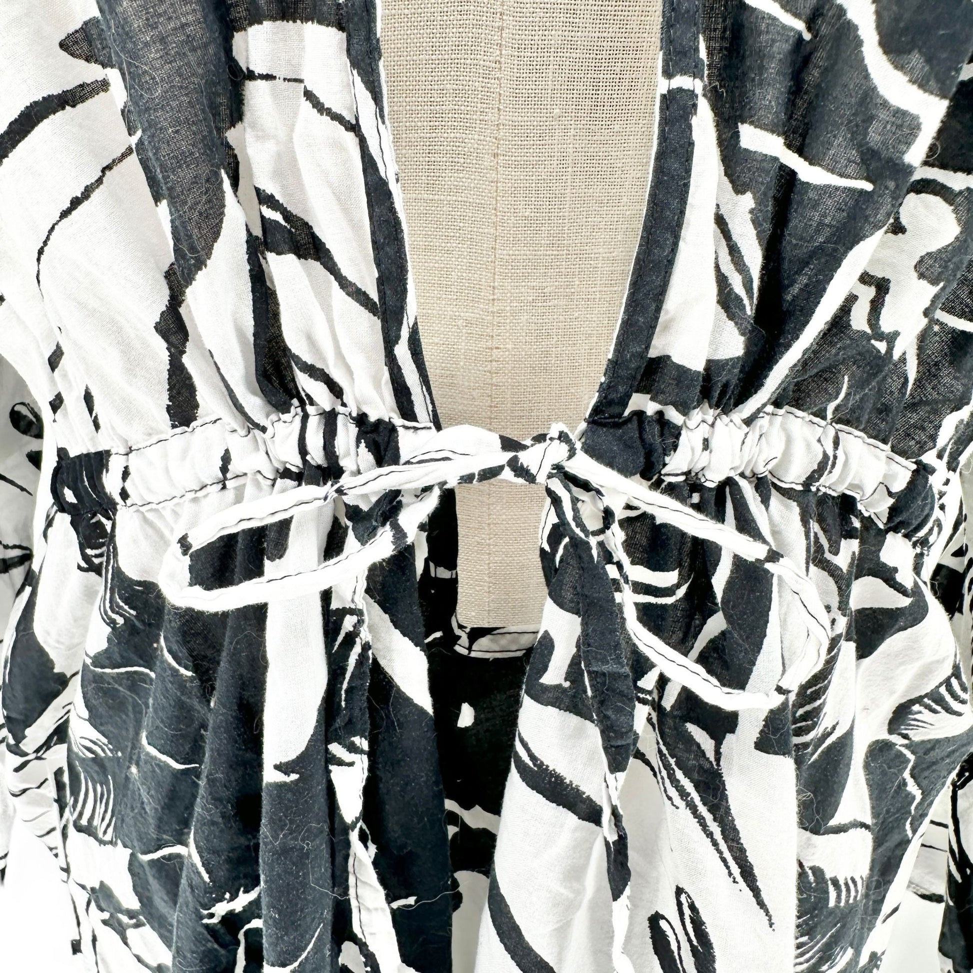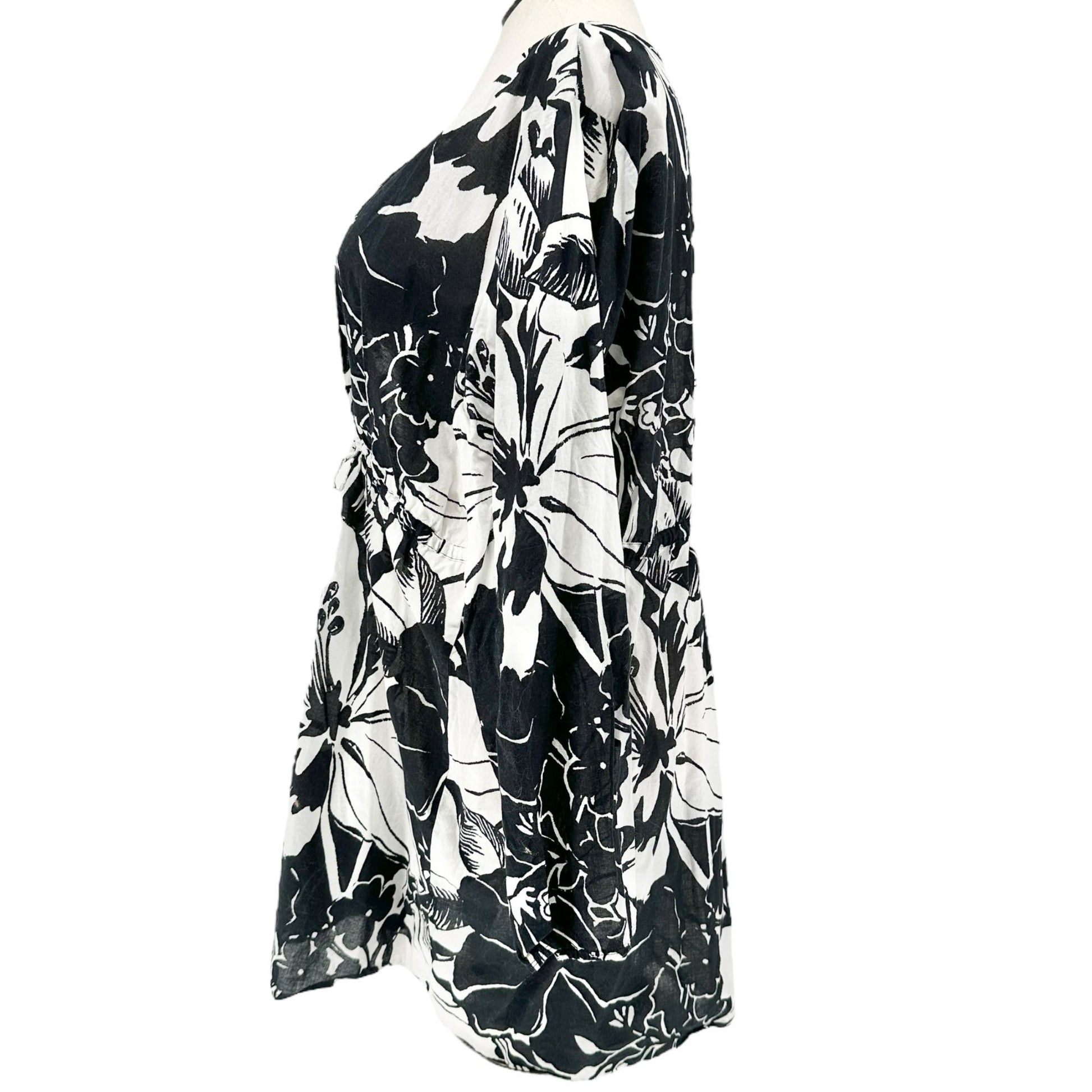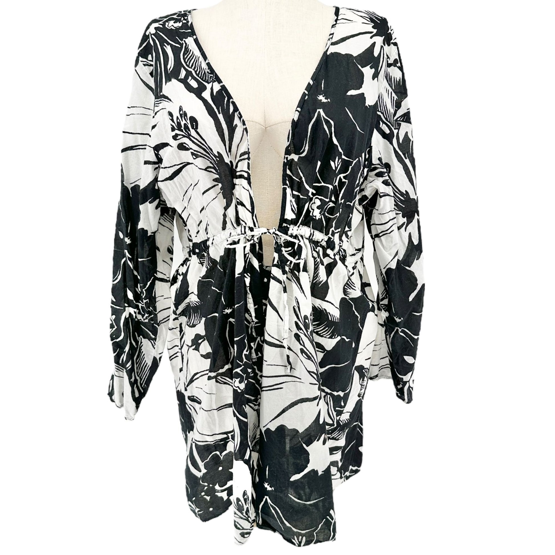 With this 3X swim cover-up, step into a dreamy tropical realm where black and white floral prints dance gracefully. A lightweight design drapes comfortably, while the adjustable waist tie flatters your silhouette. Whether by the pool or strolling along the shore, it whispers tales of breezy island charm.