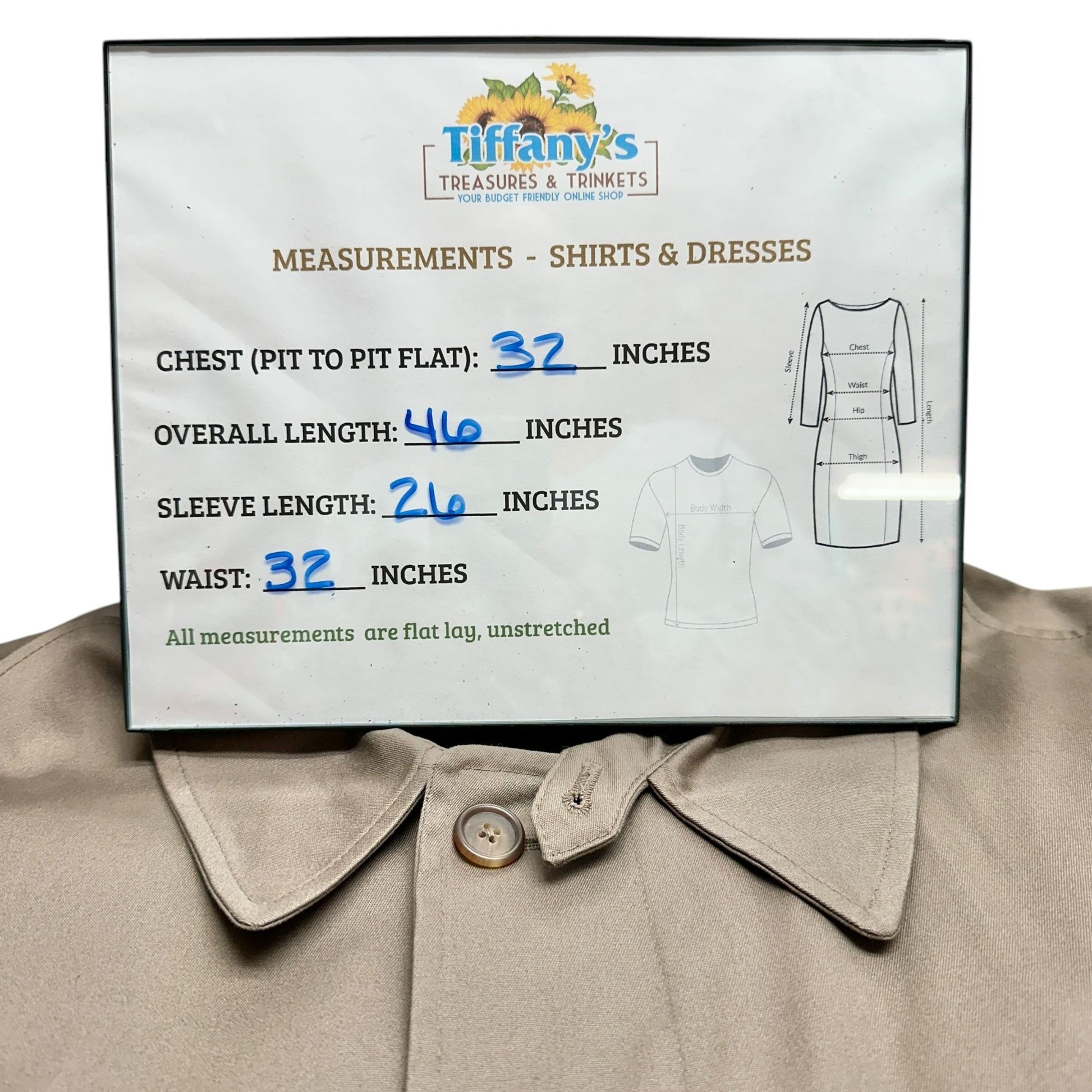 Measurements: Chest (Pit to Pit Flat) = 32 inches, Overall Length = 46 inches, Sleeve Length = 26 inches, Waist = 32 inches.