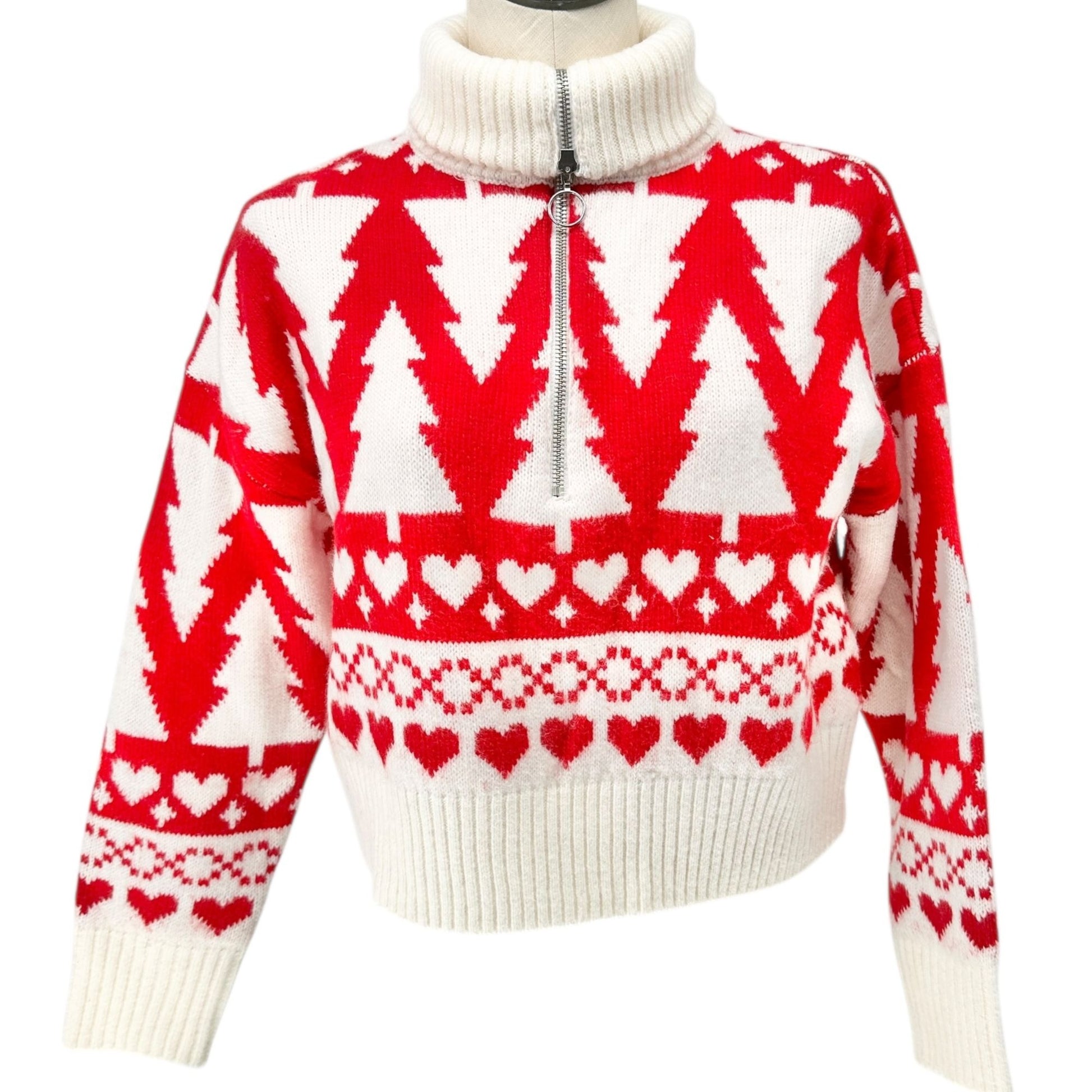 A cozy embrace of holiday cheer, this womens small sweater features a charming design of trees and hearts in vibrant red and white. Its soft knit and turtleneck style make it a snug companion for brisk winter days, while the half-zip offers versatility in wear.