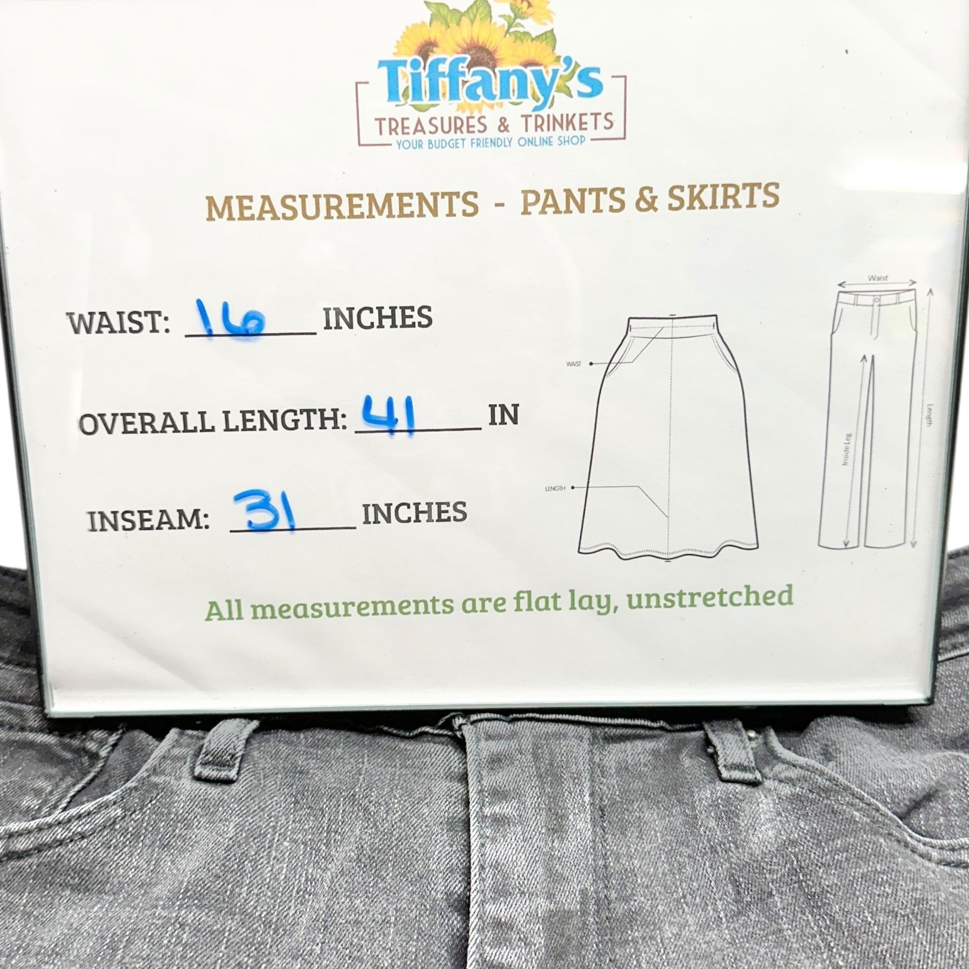 Waist = 16 inches, Inseam = 31 inches, Overall length = 41 inches.