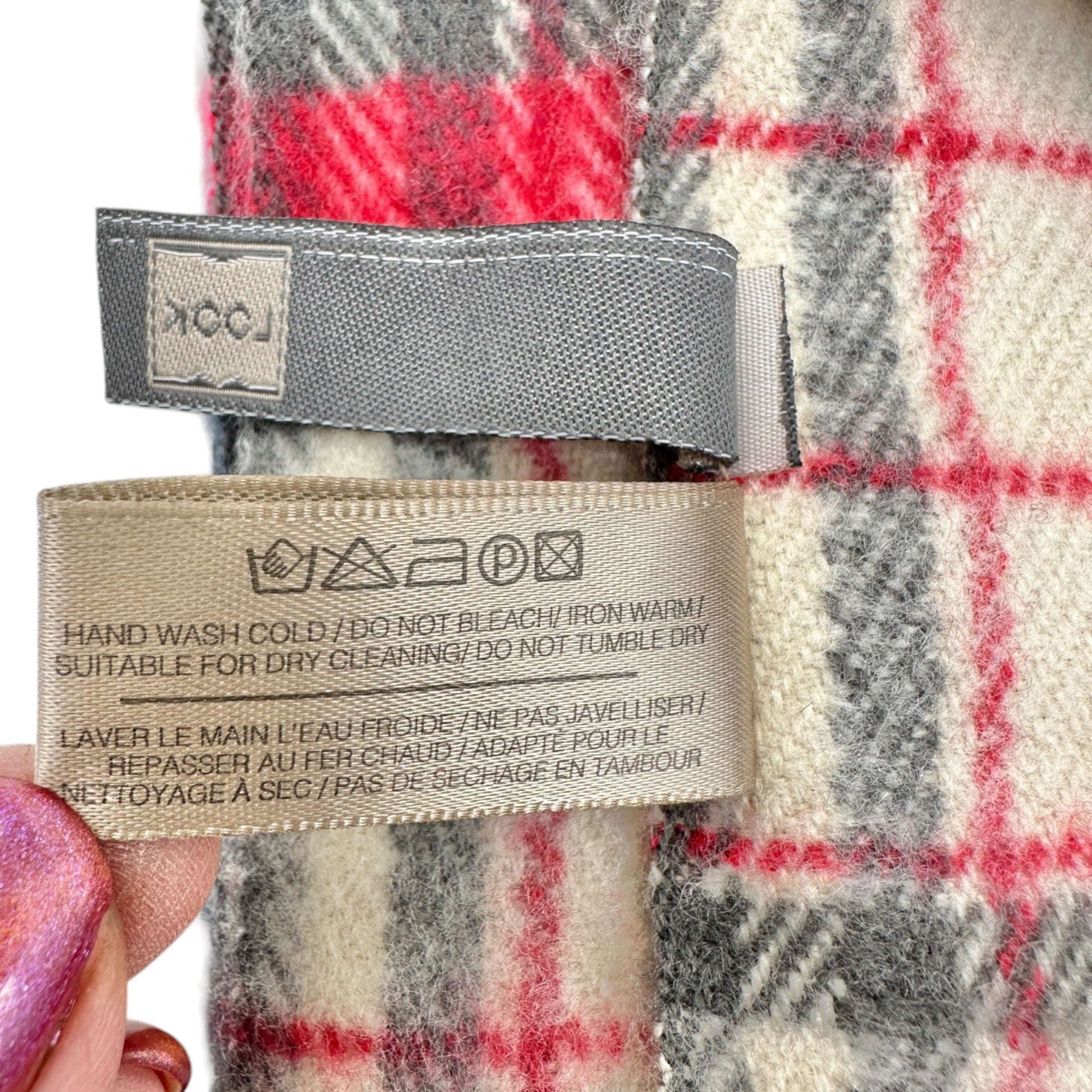Look Plaid Wool and Acrylic Blend Scarf 80 x 27 Red Beige Navy Fringed Edges