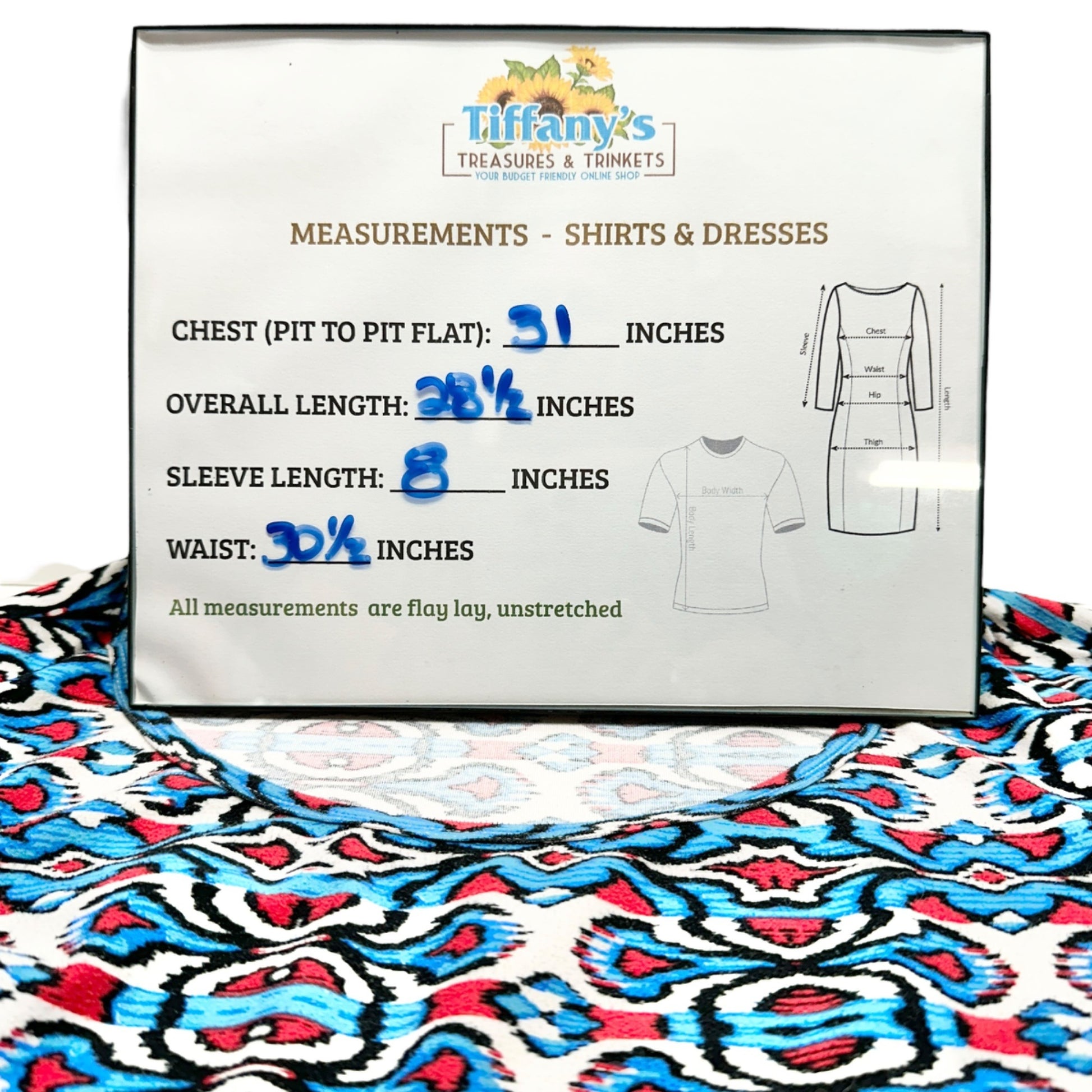 LuLaRoe Irma Top Womens 3XL Geometric Print Scoop Neck features red, white and blue geometric design with high low hem in tunic length.