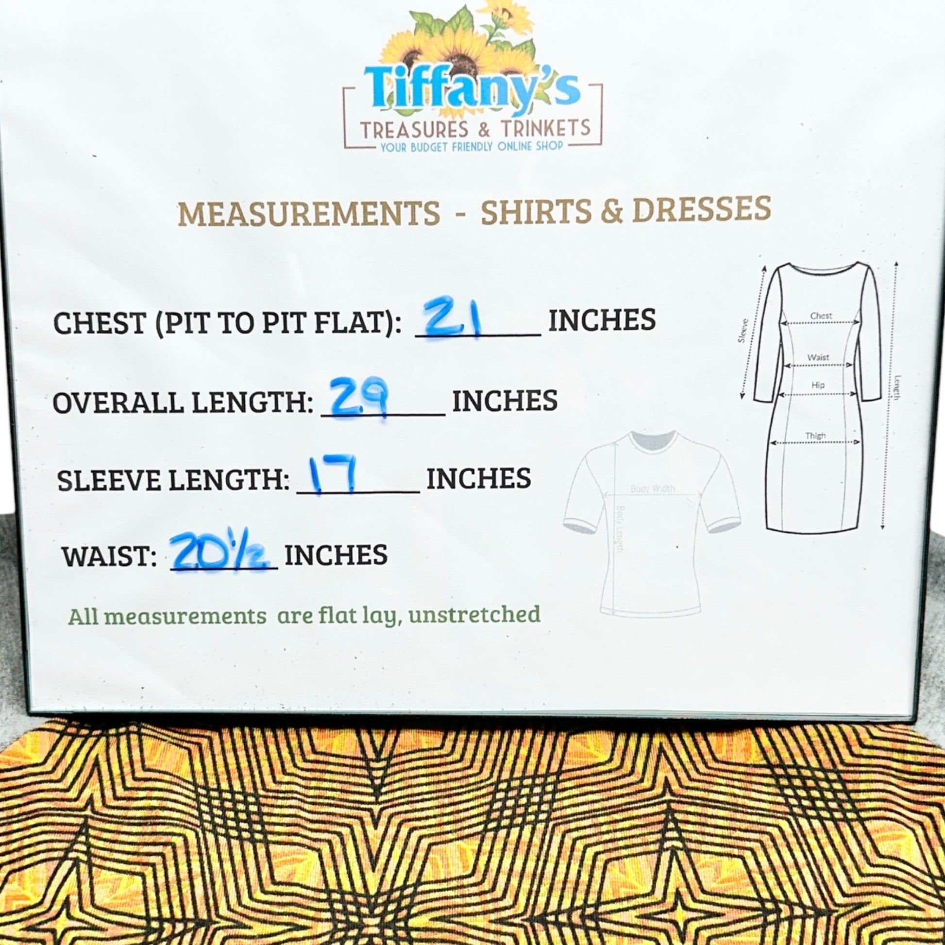 Chest (pit to pit flat) = 21 inches, Overall length = 29 inches, Sleeve length = 17 inches, Waist = 20 1/2 inches.