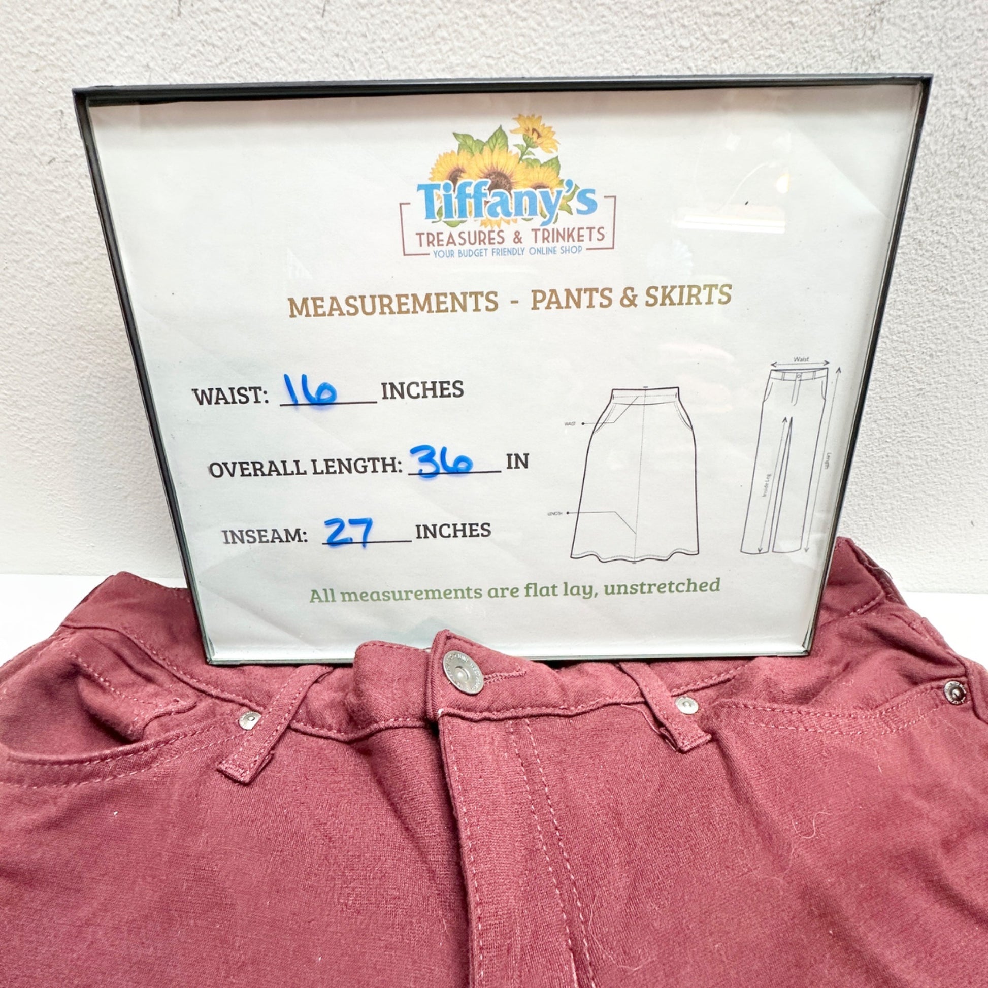 • Waist = 16 inches, overall length = 36 inches, inseam = 27 inches