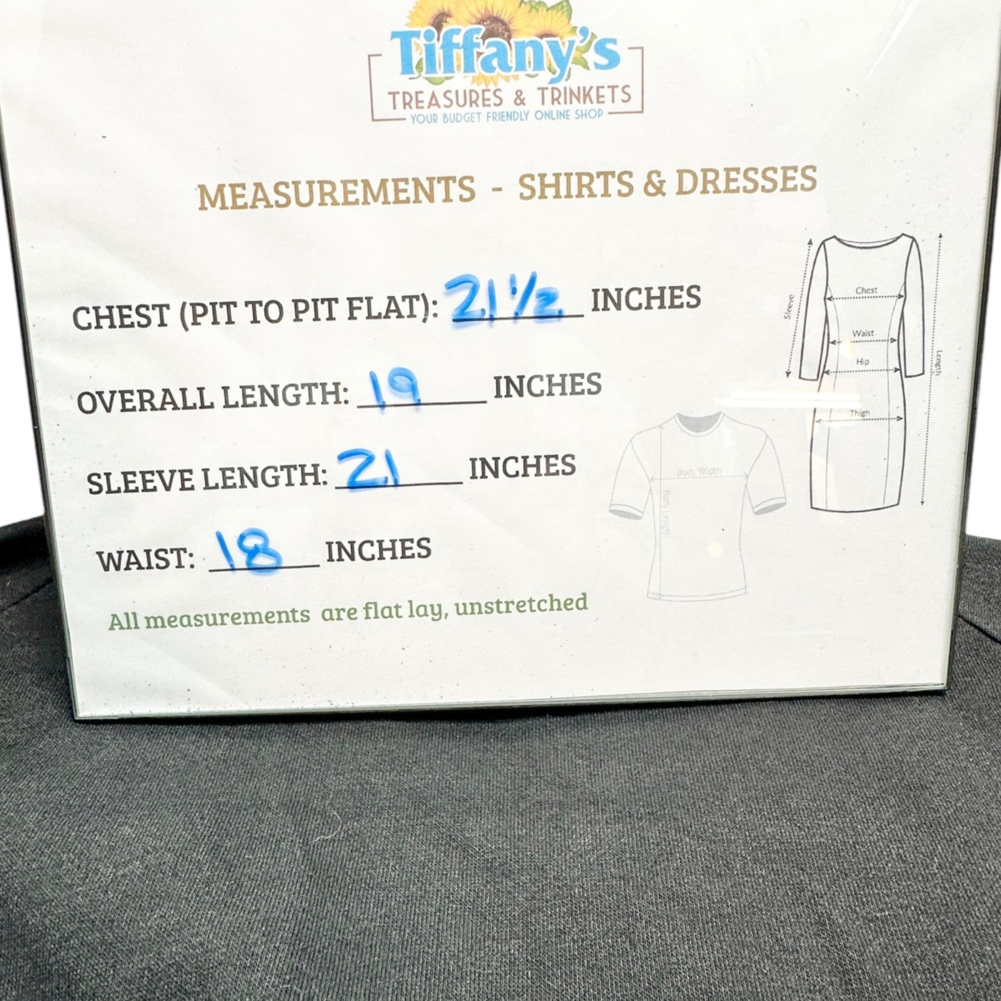 No visible flaws; overall length = 19 inches, chest (pit to pit flat) = 21.5 inches, sleeve length = 21 inches, waist = 18 inches.