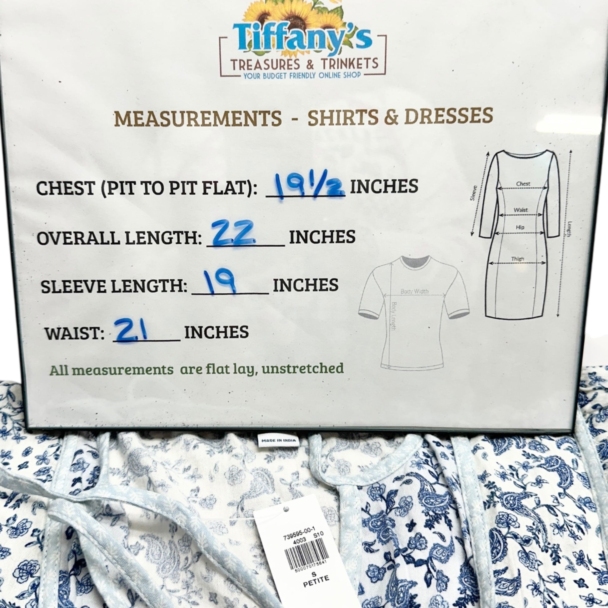 This blouse tells a story of timeless elegance with its intricate floral design, delicate button closures, and soft fabric blend. Ideal for adding a dash of charm to your wardrobe, the blue and white hues evoke a serene and classic mood, while the petite fit ensures a flattering silhouette.