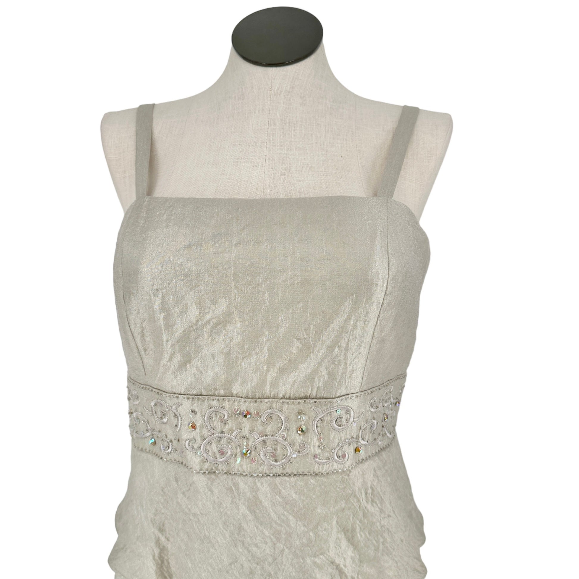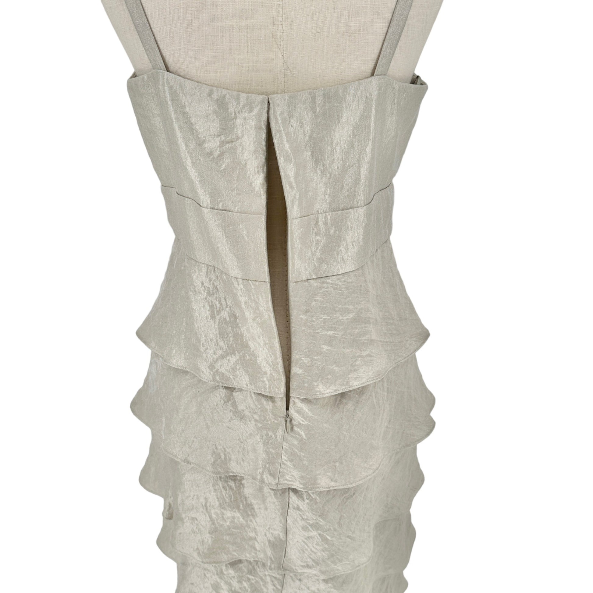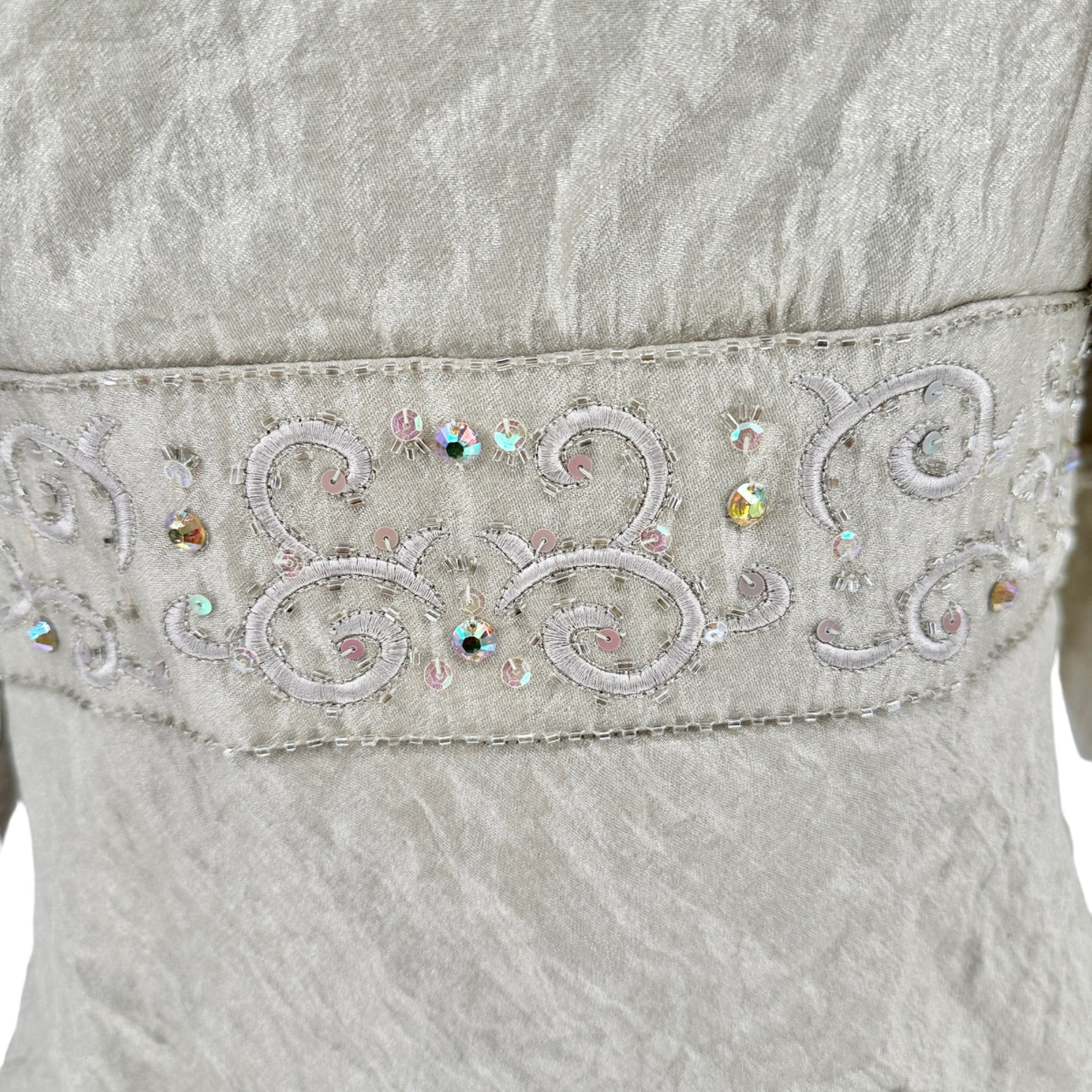 R&M Collection 2pc Dress Jacket Set Womens 16 Champagne Gold Tiered Skirt featured embellished empire waist and back zip. Can be worn with or without the jacket. Shimmery and sleek this tiered jacket dress is perfect for any event.