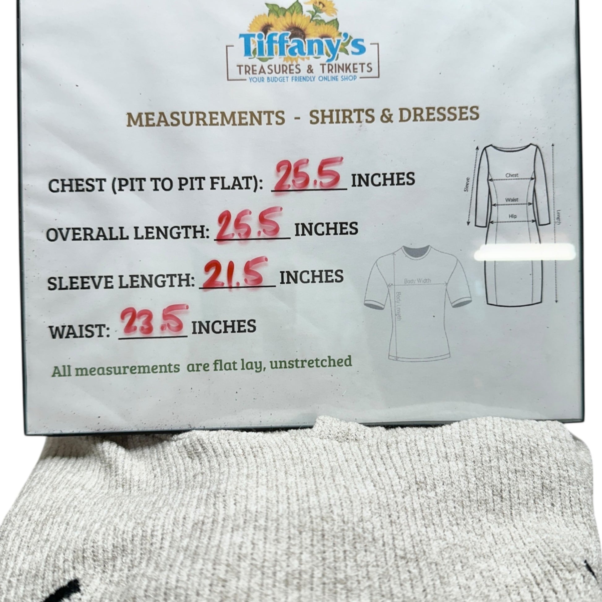Chest (pit to pit flat) = 25.5 inches, Overall length = 25.5 inches, Sleeve length = 21.5 inches, Waist = 23.5 inches