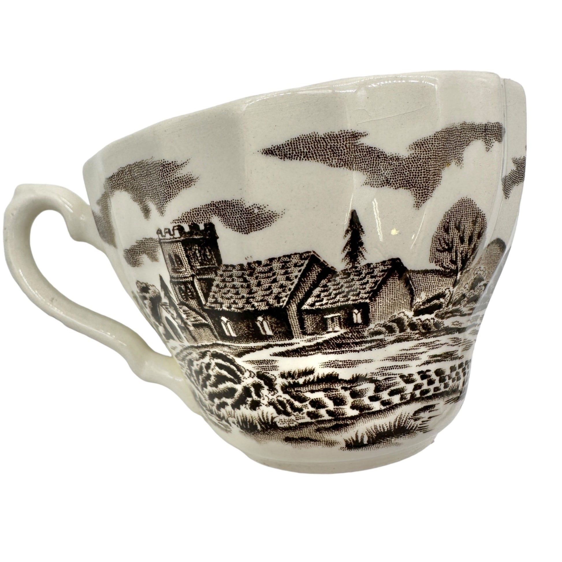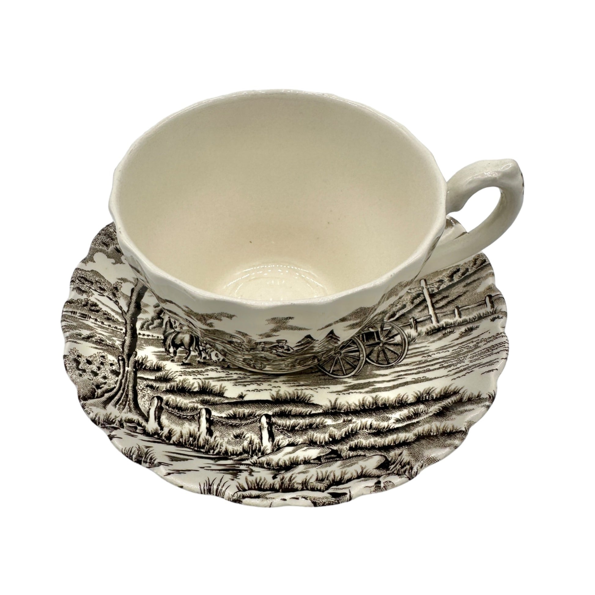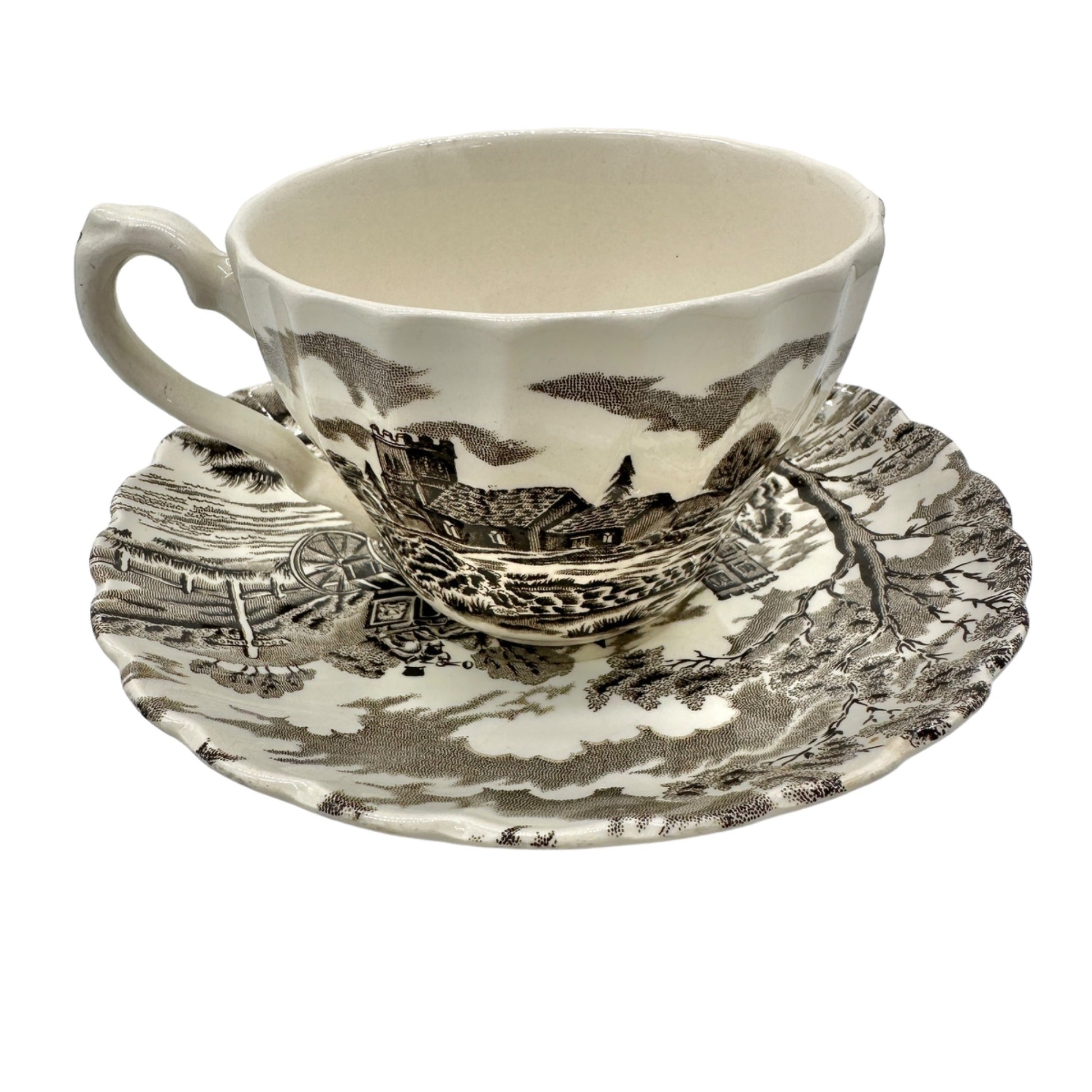 This Staffordshire Ironstone cup and saucer set features intricate countryside scenes. Made in England, the set exemplifies fine craftsmanship and timeless design.