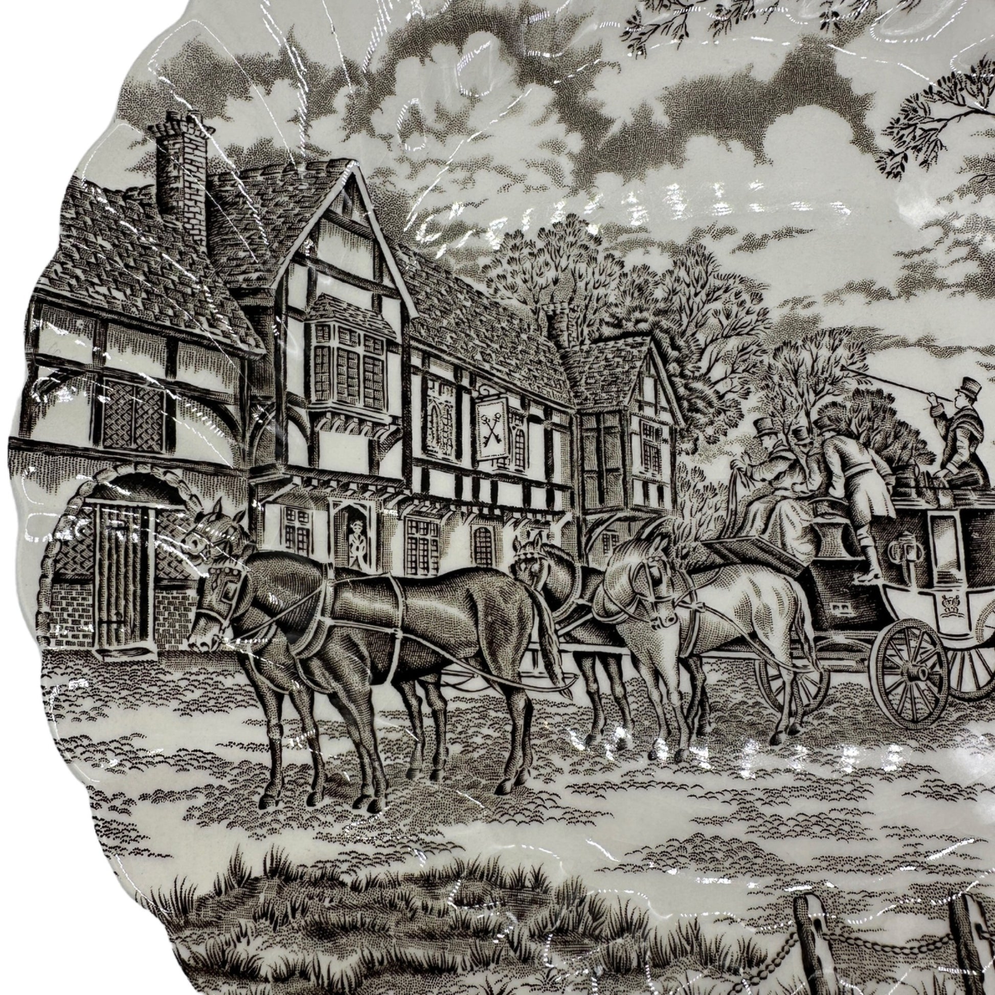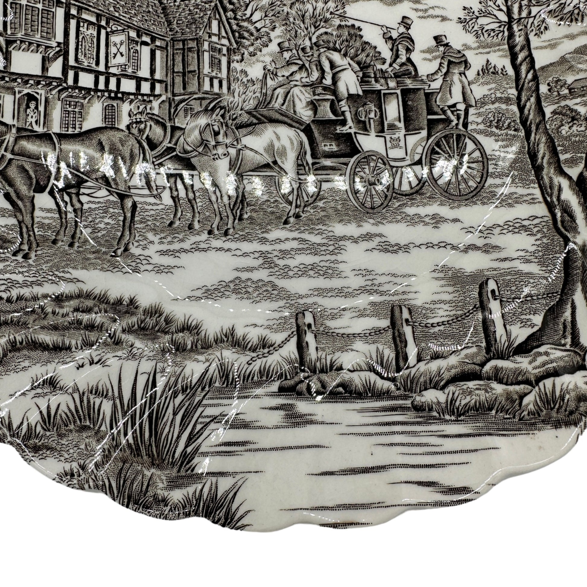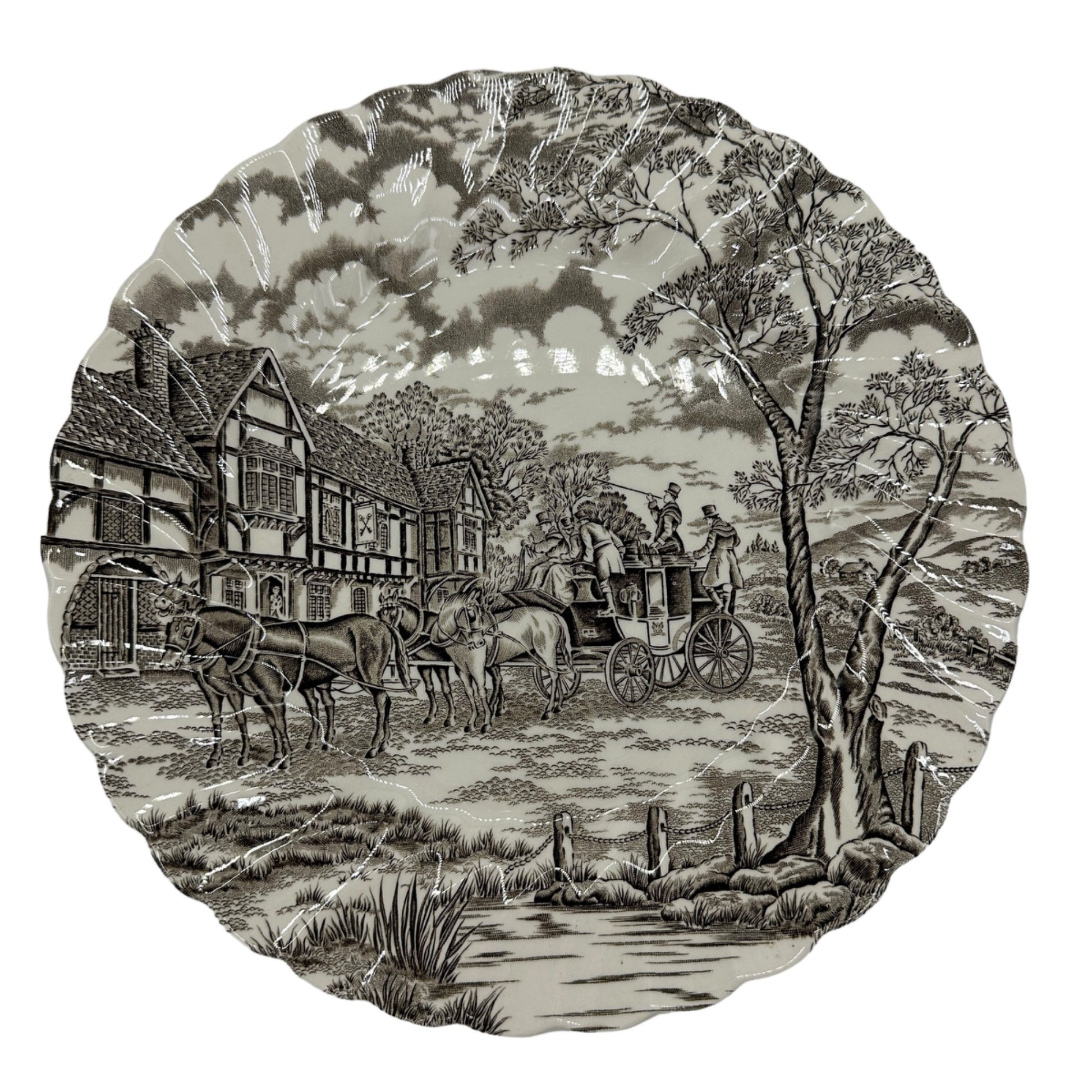 Royal Mail Fine Staffordshire Ironstone Dinner Plate - This handcrafted Staffordshire dinner plate features intricate hand-engraving, showcasing a quaint countryside scene. Made with fine ironstone and permanent colors, it's a timeless collectible.