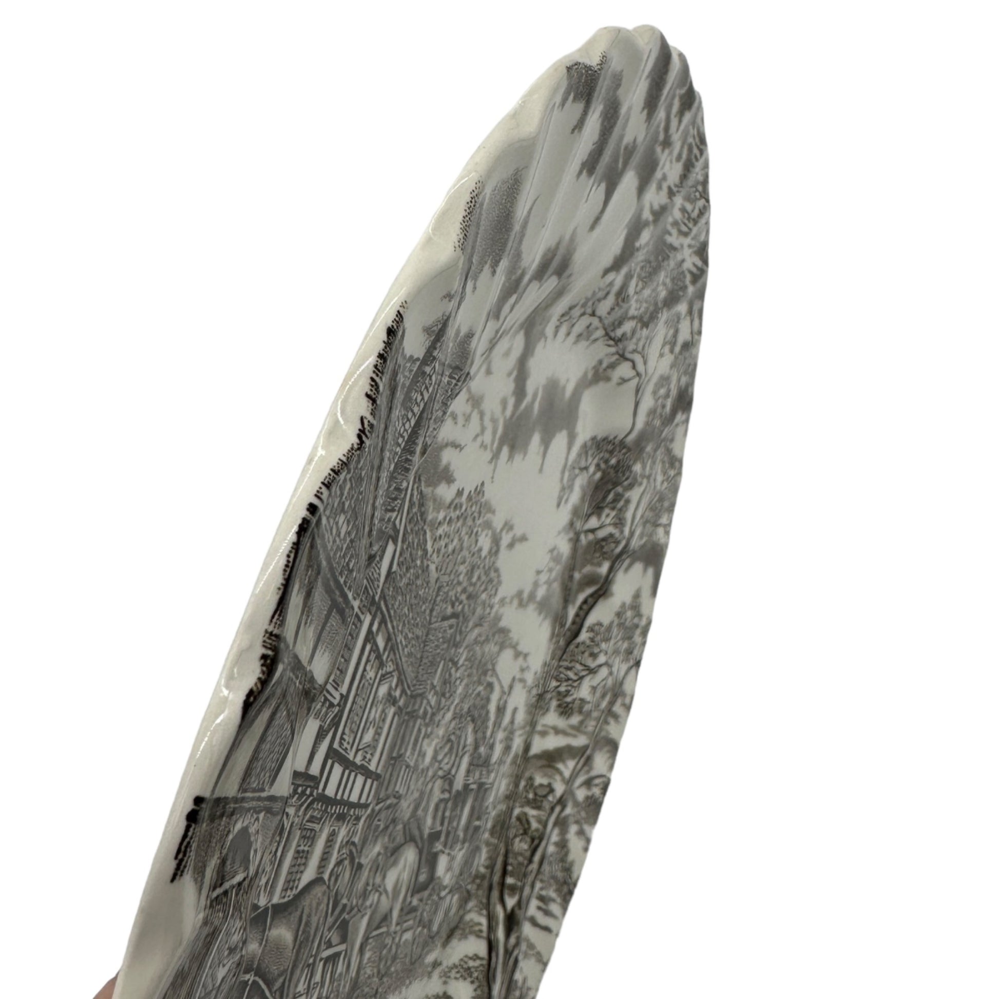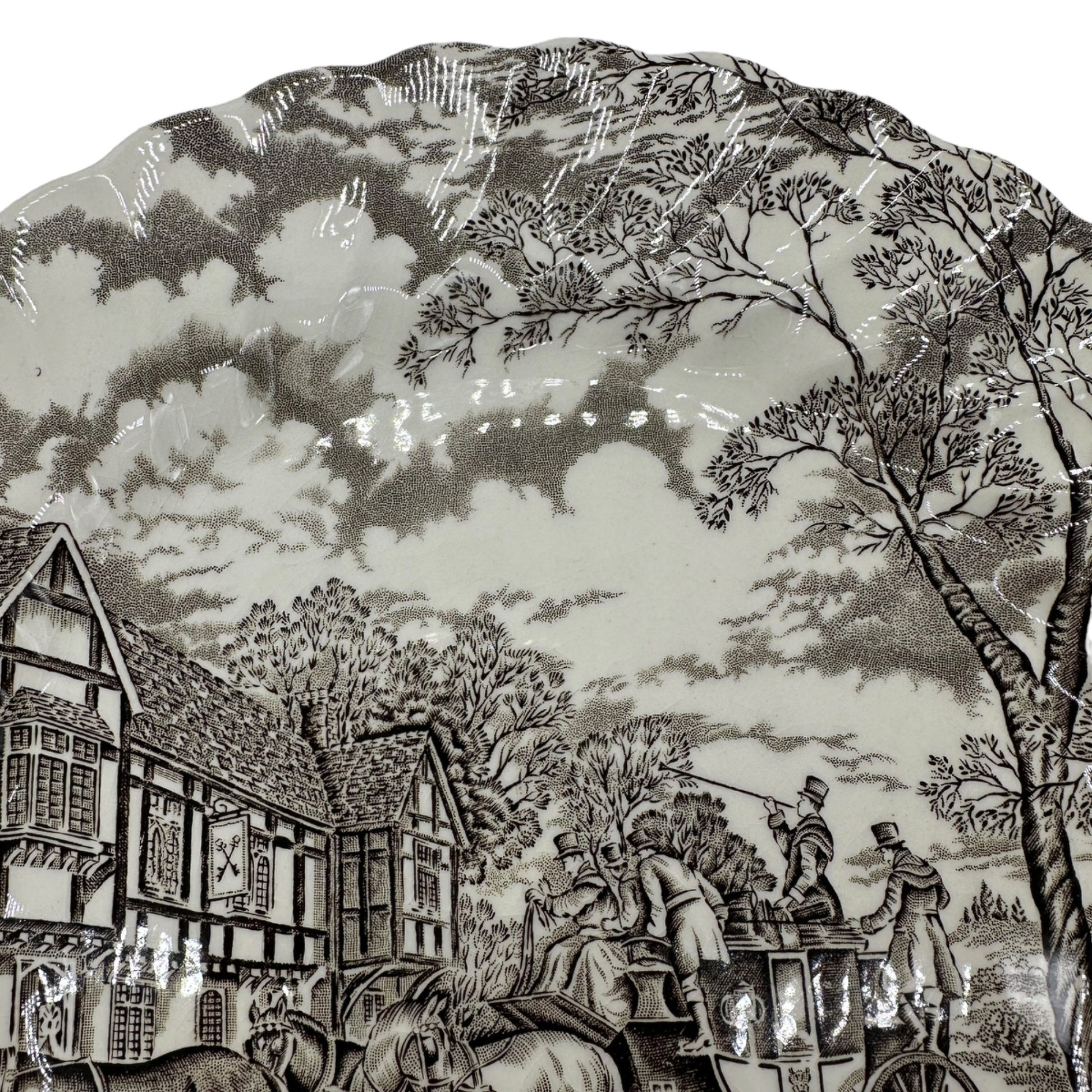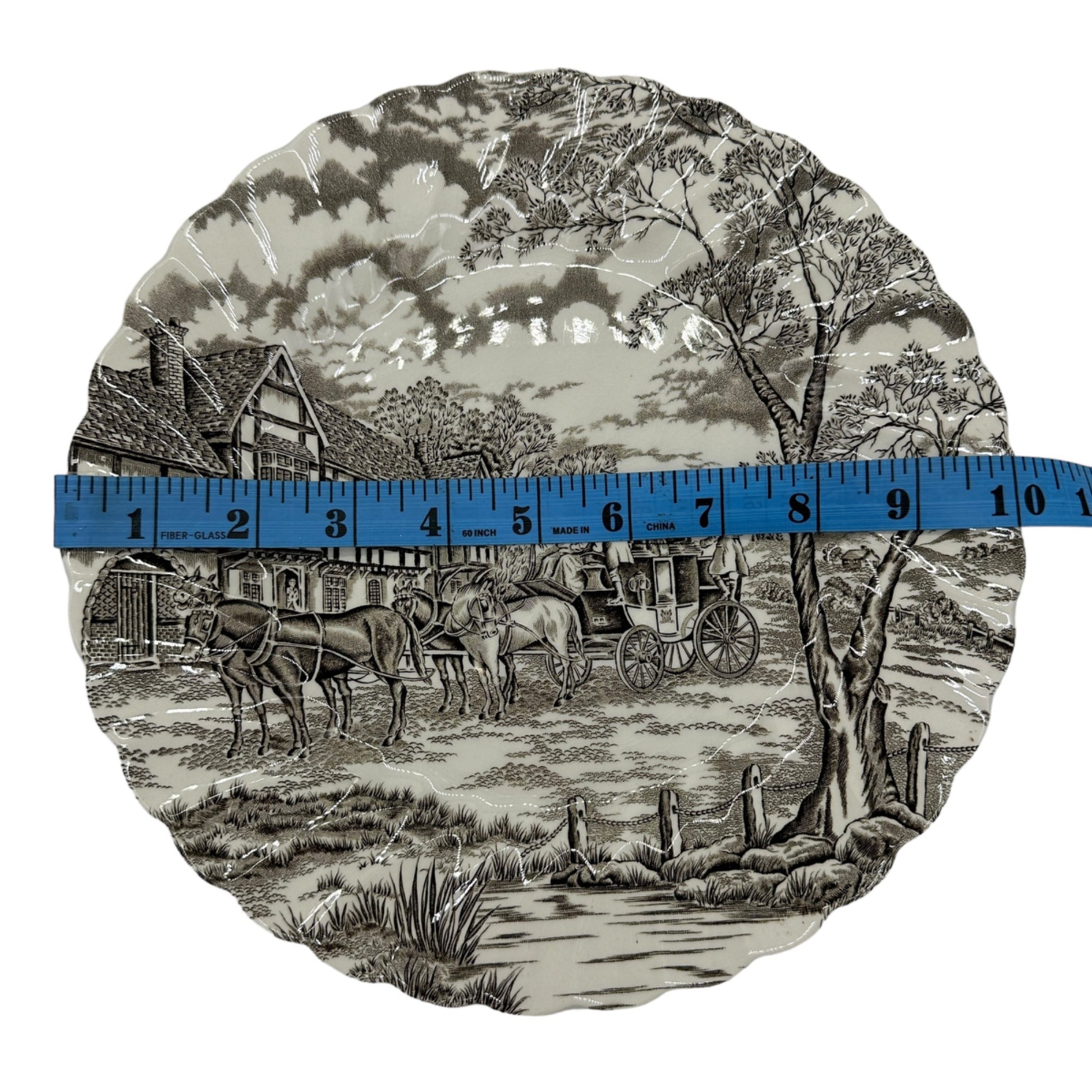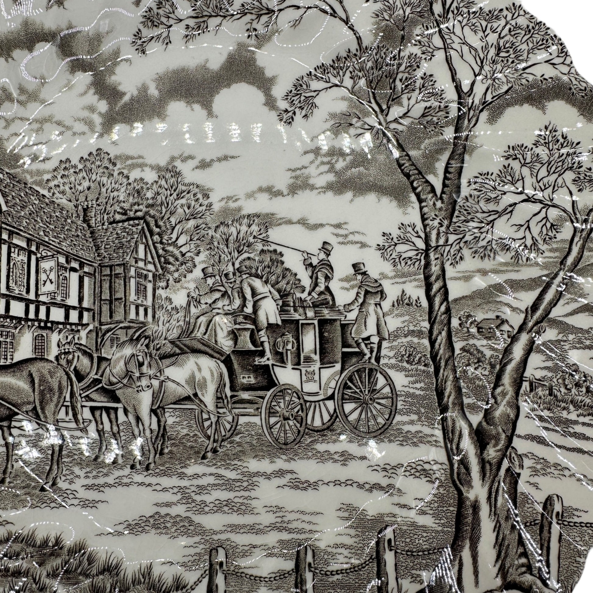 Royal Mail Fine Staffordshire Ironstone Dinner Plate - This handcrafted Staffordshire dinner plate features intricate hand-engraving, showcasing a quaint countryside scene. Made with fine ironstone and permanent colors, it's a timeless collectible.