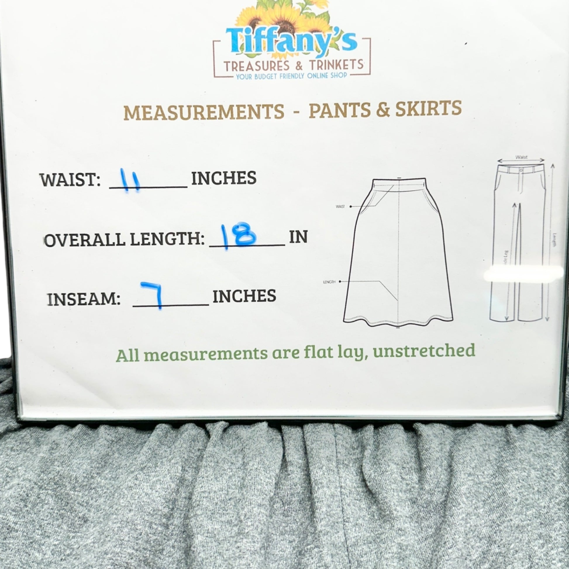 Minor signs of wear; overall length = 18 inches, waist = 11 inches (flat lay), inseam = 7 inches.