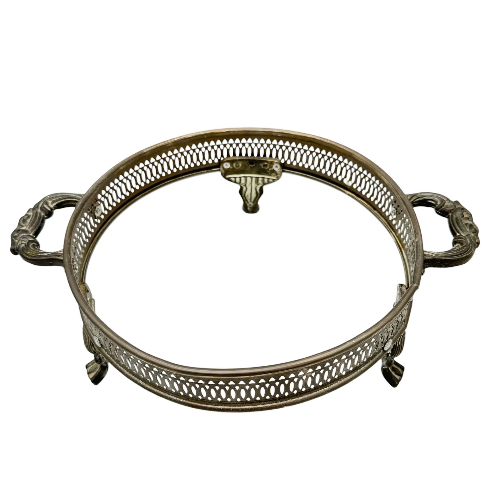 Silver Plate Round Serving Dish Holder With Ornate Handles+Feet 9 Inch Diameter