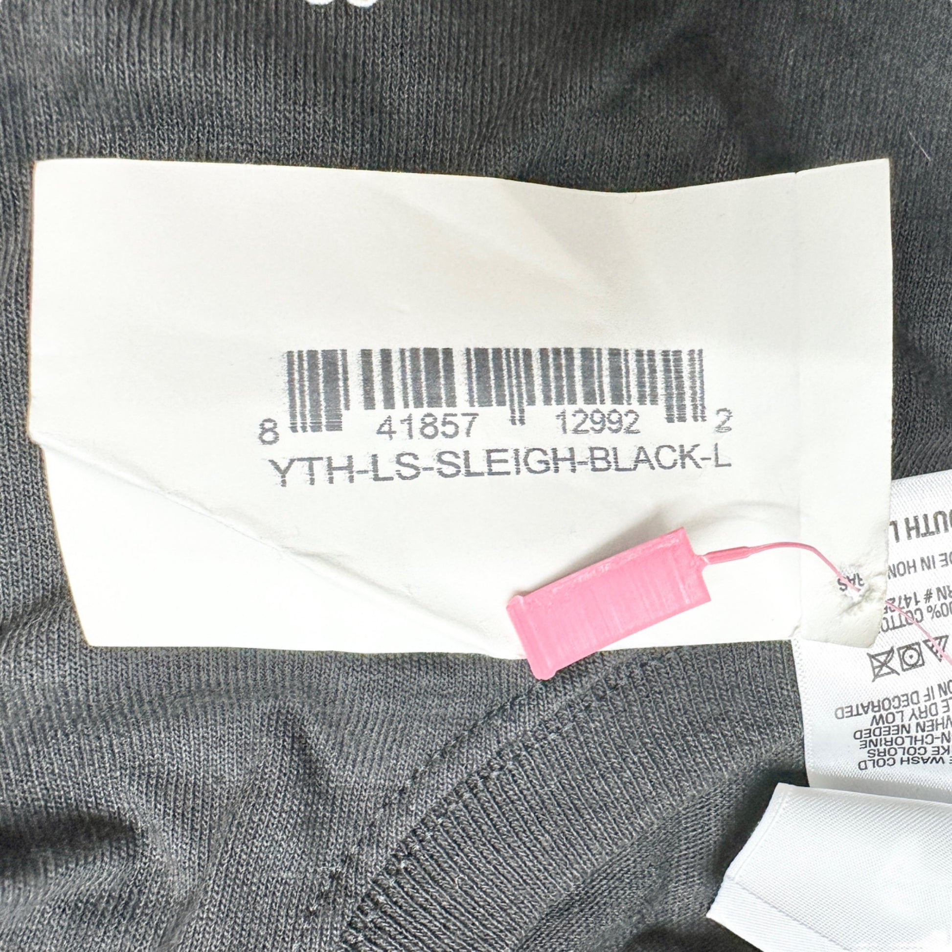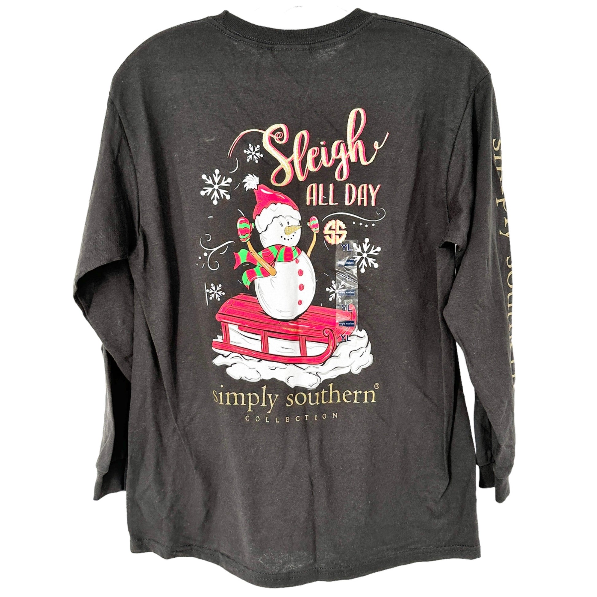Simply Southern TShirt Youth Large Black Christmas Snowman Long Sleeve Crew Neck NWT - Winter scene with snowman sledding on the back.