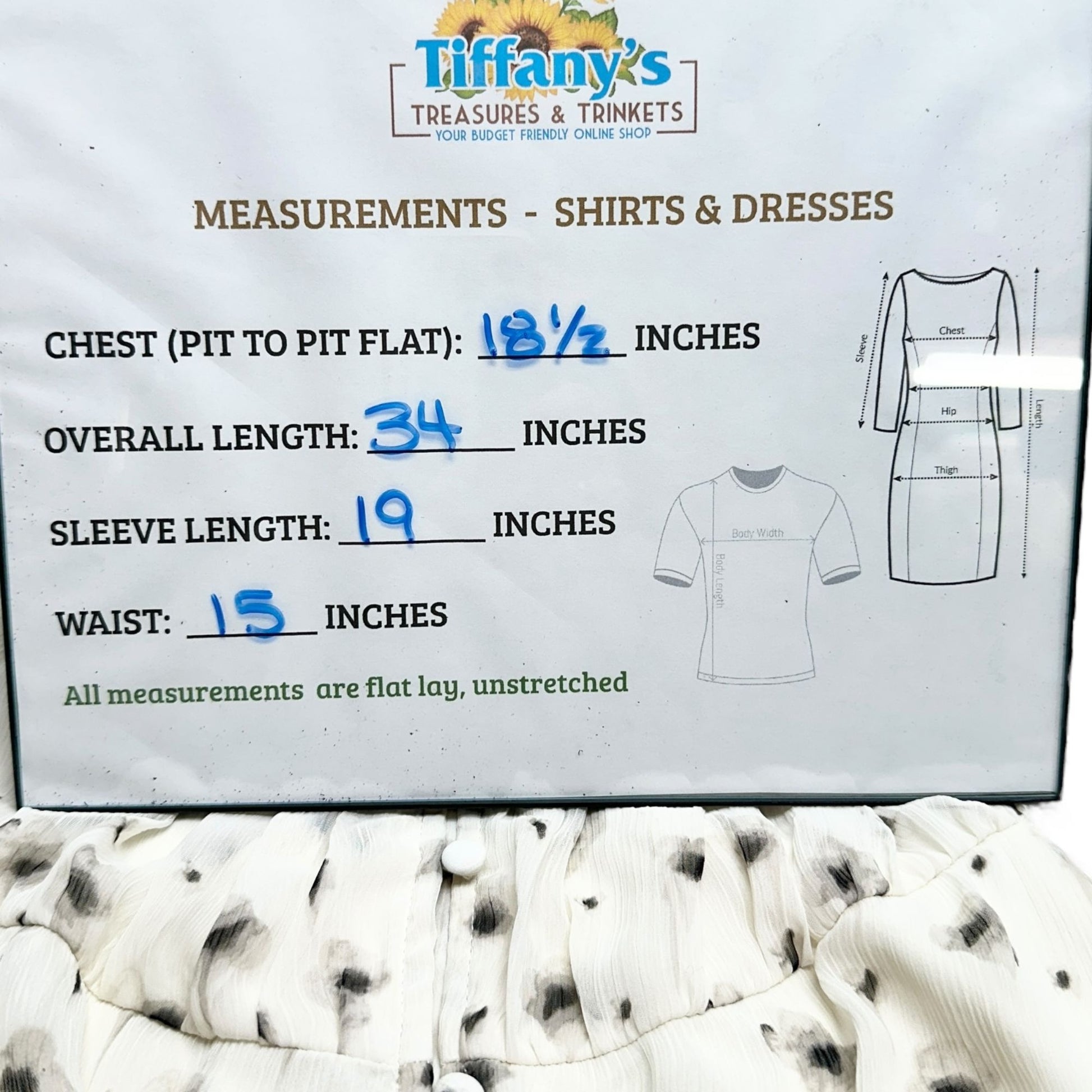 Measurements: Chest (Pit to Pit Flat) = 18.5", Overall Length = 34", Sleeve Length = 19", Waist = 15" (unstretched).
