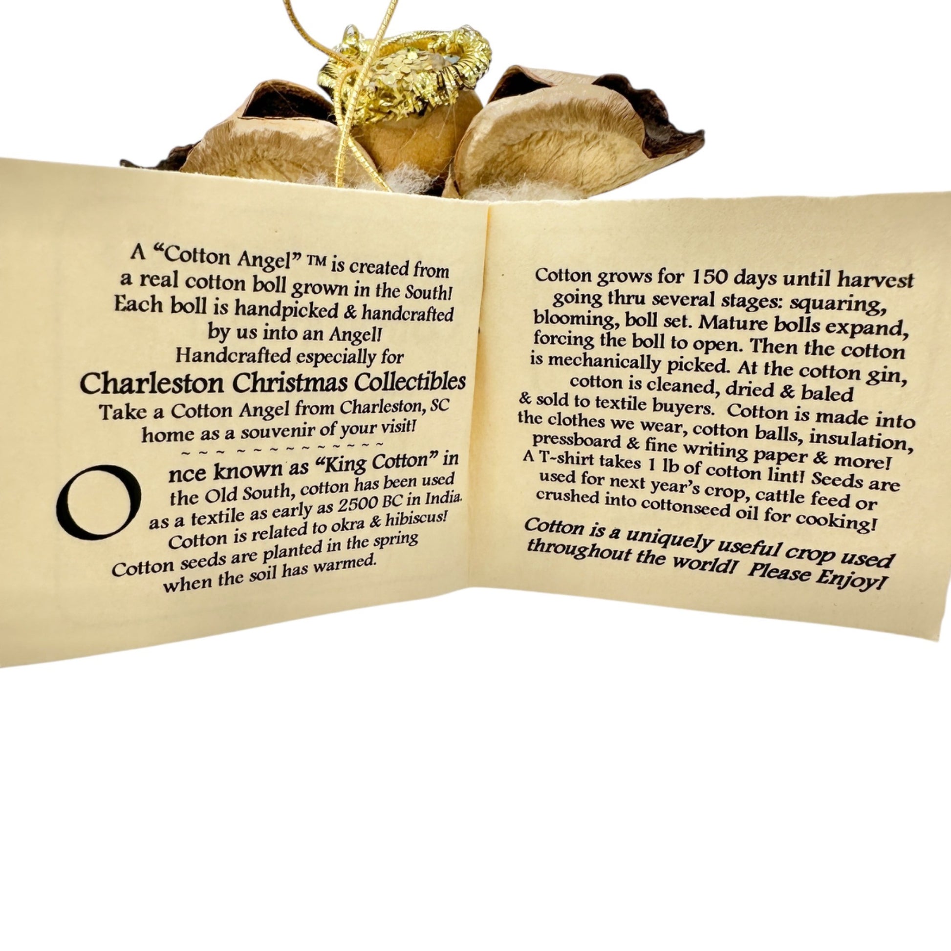 Once upon a time, in the heart of the South, cotton bolls transformed into angelic ornaments. This Southern Nature's Cotton Angel carries the charm of Charleston, SC, offering a handcrafted piece of history and holiday cheer. Let it bring a touch of Southern grace to your festivities.
