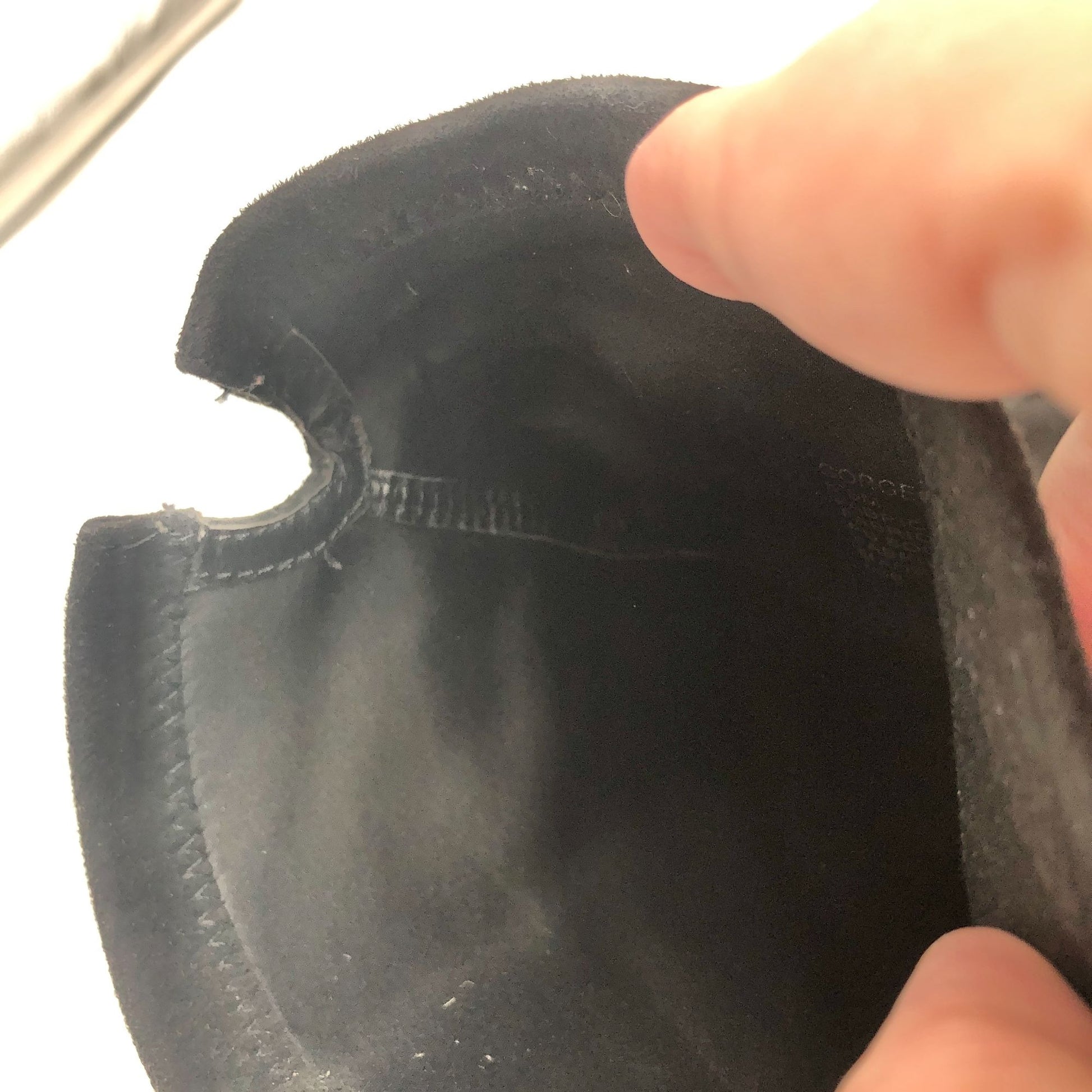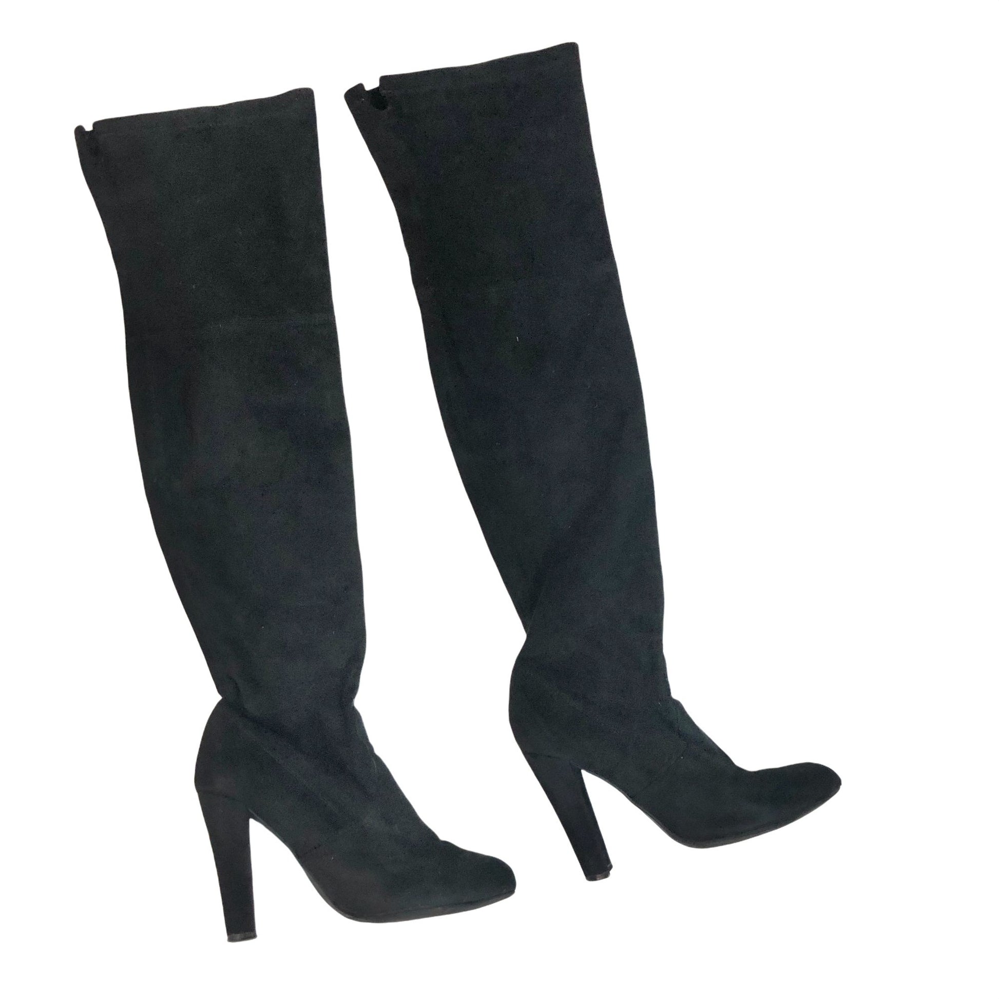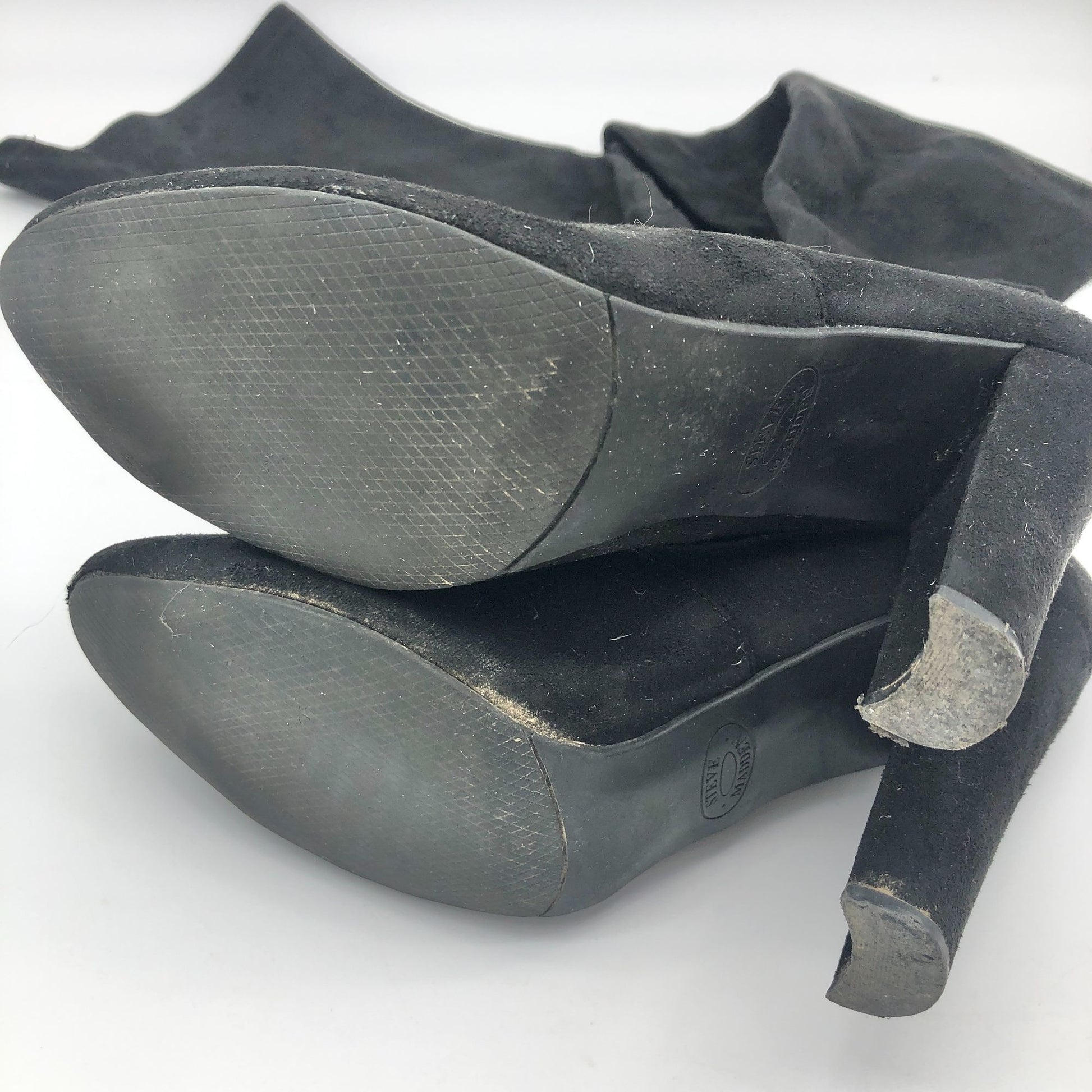 Design: Thigh high black suede boots with 4" heels, About 25" from top to heel
