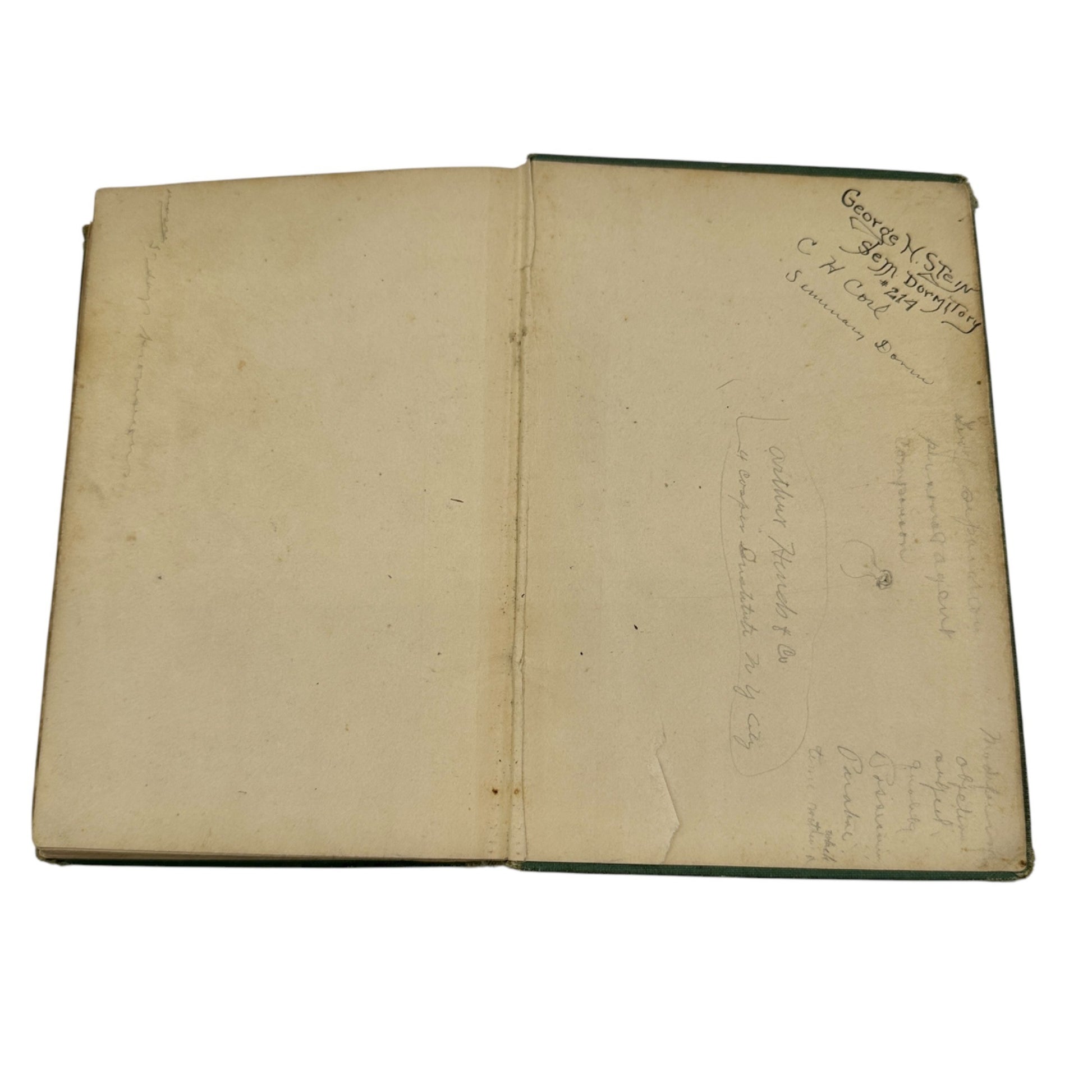 Severe spine damage with exposed binding and notable cover wear. Some handwritten notes on the initial pages. Top to bottom = 7.5 inches, side to side = 5.5 inches, depth = 1 inch.