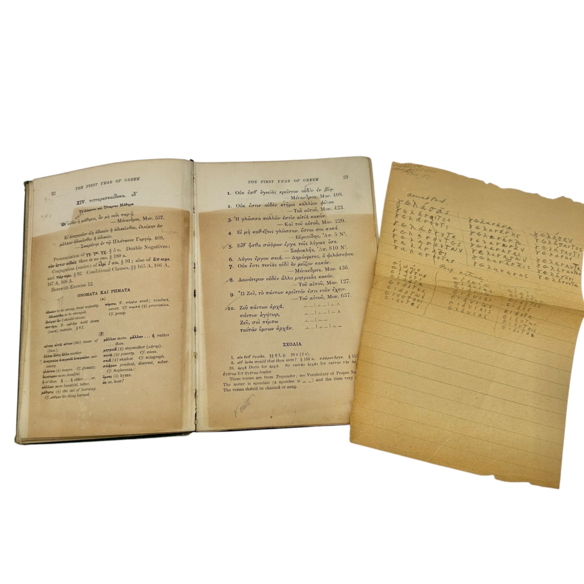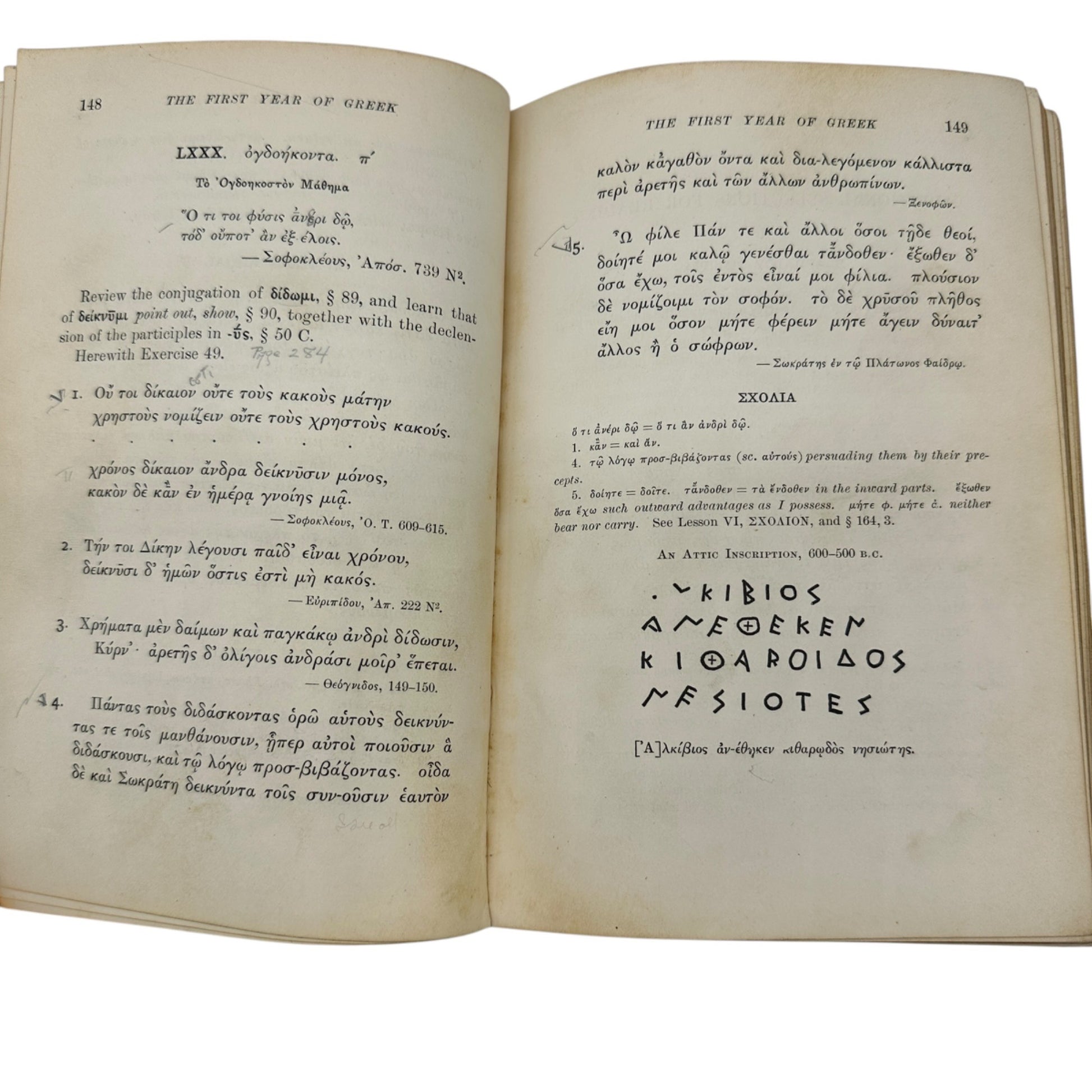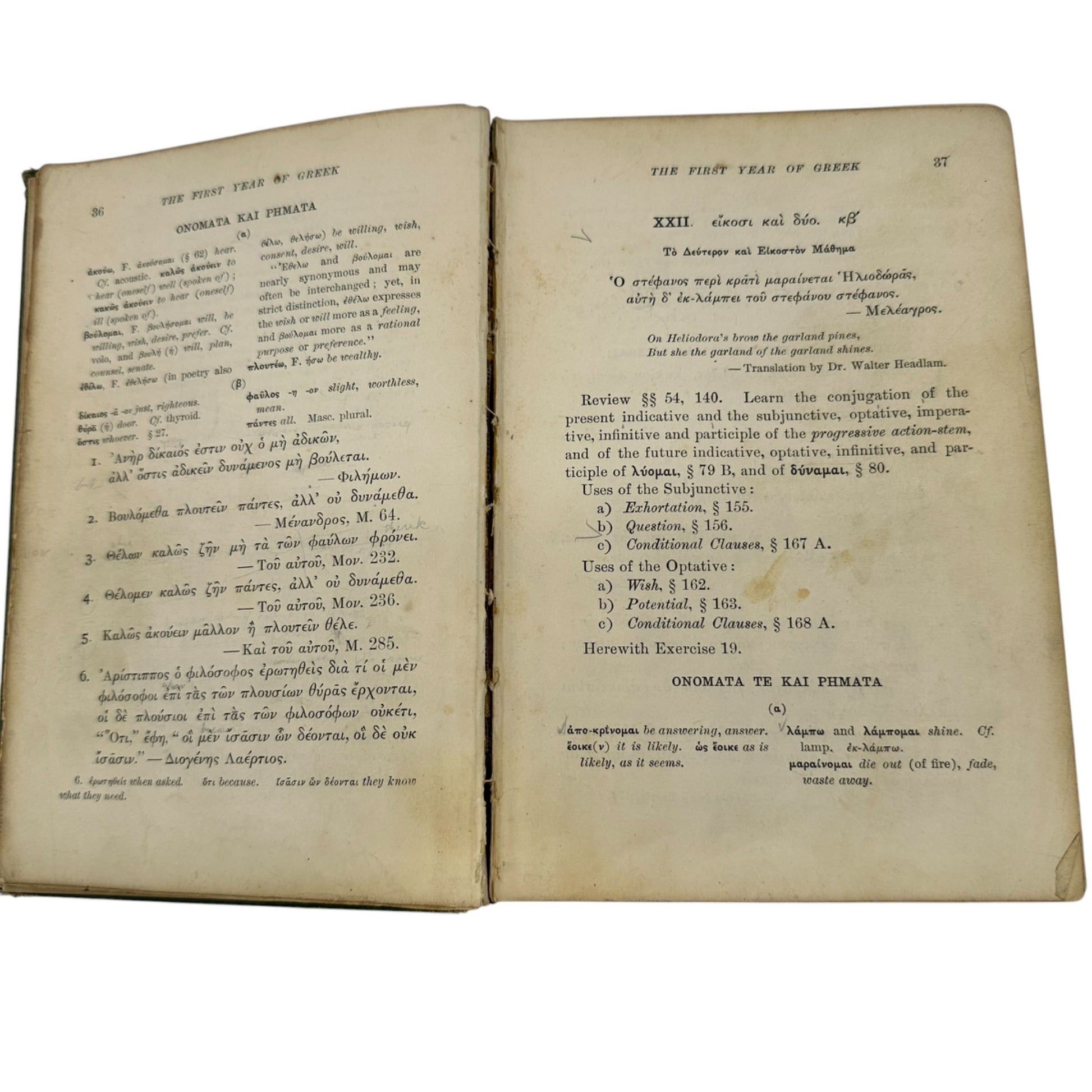 This 1921 edition of "The First Year of Greek" by James Turney Allen offers a fascinating glimpse into classical language instruction of the past. Its aged green cover, though worn, carries a sense of history, while the pages within unravel the fundamentals of ancient Greek, bridging centuries of linguistic tradition.