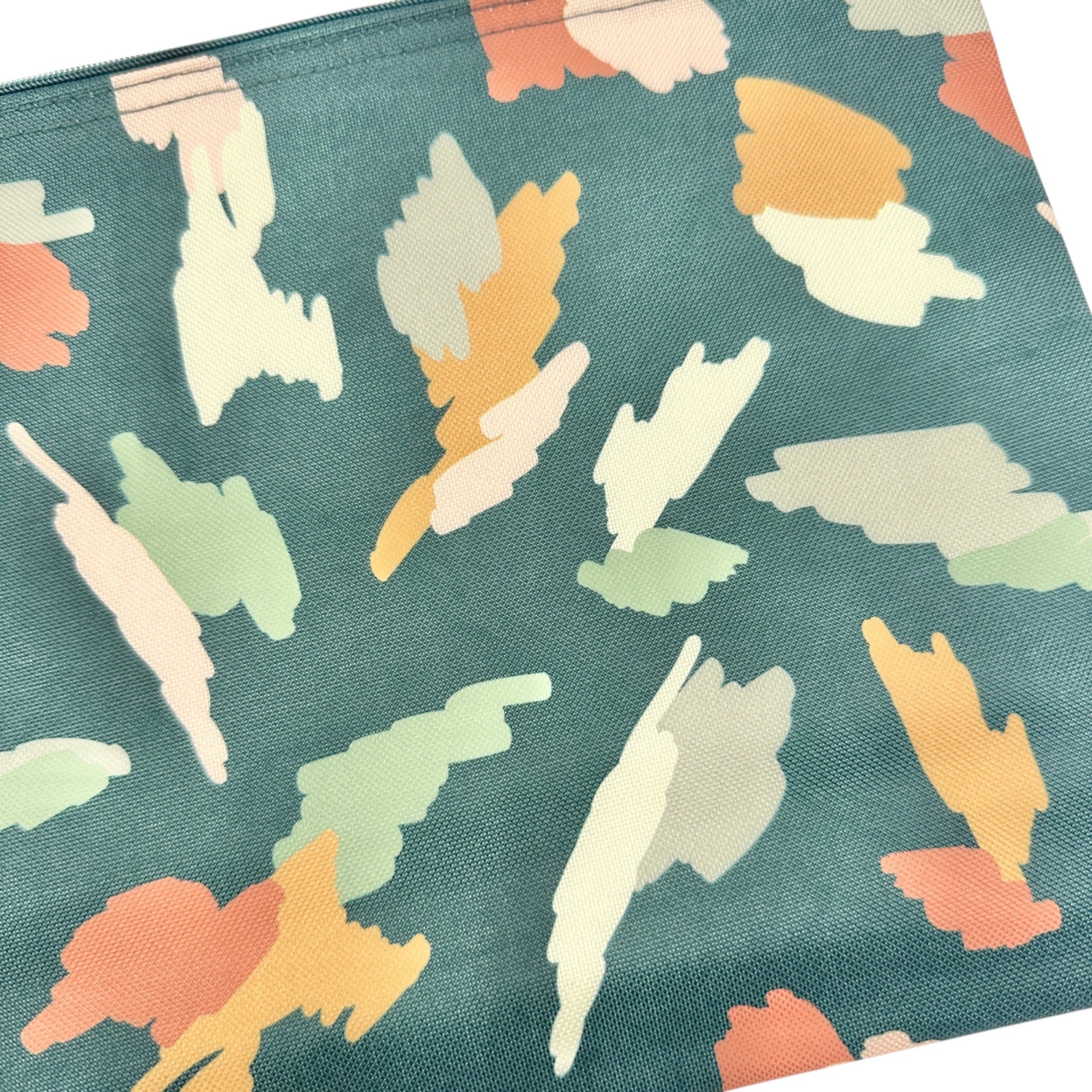 This vibrant pouch tells a story of sustainability and style, crafted from 100% recycled polyester. Its shattered abstract design adds an artistic flair to your essentials.