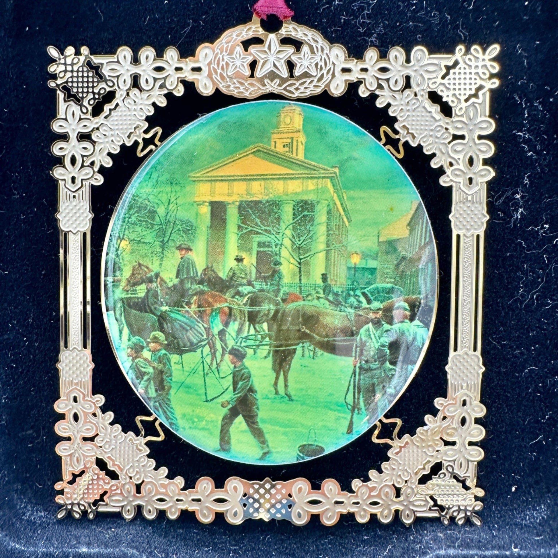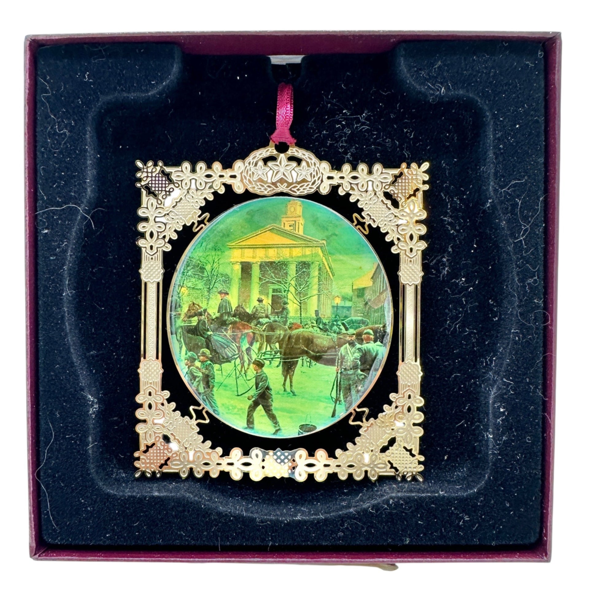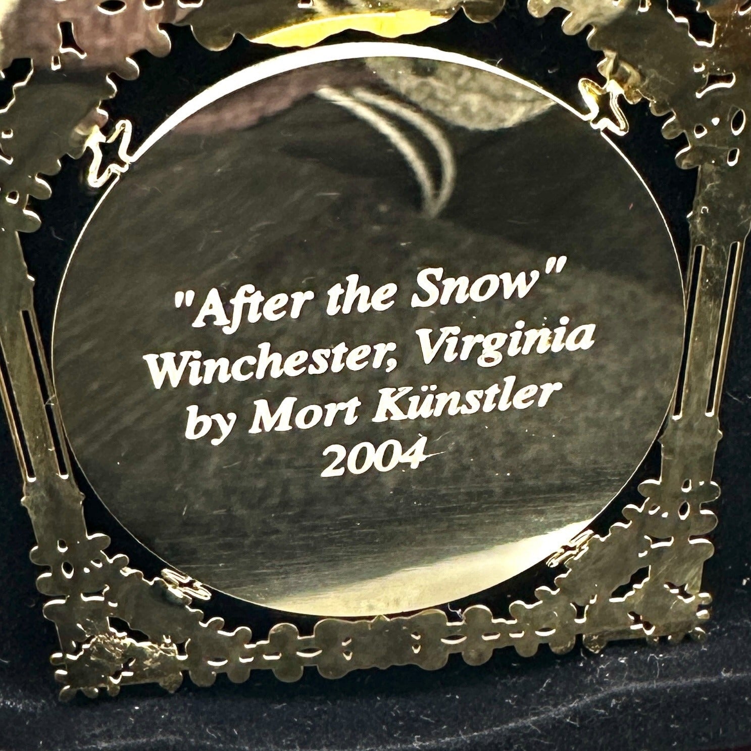 Crafted with care and steeped in history, this ornament encapsulates a serene winter scene by Mort Künstler. Displayed in a regal box, it’s a tribute to Winchester, Virginia. Its intricate design and limited production make it a cherished collectible, celebrating the artist’s legacy and the beauty of a snowy day.